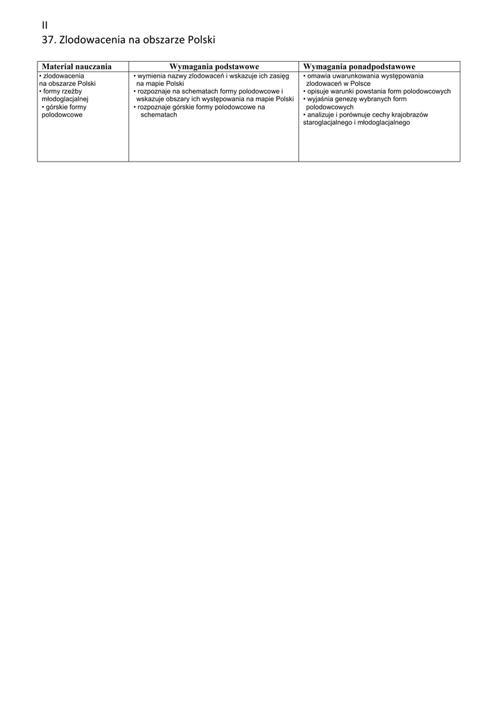 II 37. Zlodowacenia na obszarze Polski Materiał nauczania • zlodowacenia na obszarze Polski • formy rzeźby młodoglacjalnej • górskie formy polodowcowe Wymagania podstawowe • wymienia nazwy zlodowaceń i wskazuje ich zasięg na mapie Polski • rozpoznaje na schematach formy polodowcowe i wskazuje obszary ich występowania na mapie Polski • rozpoznaje górskie formy polodowcowe na schematach Wymagania ponadpodstawowe • omawia uwarunkowania występowania zlodowaceń w Polsce • opisuje warunki powstania form polodowcowych • wyjaśnia genezę wybranych form polodowcowych • analizuje i porównuje cechy krajobrazów staroglacjalnego i młodoglacjalnego