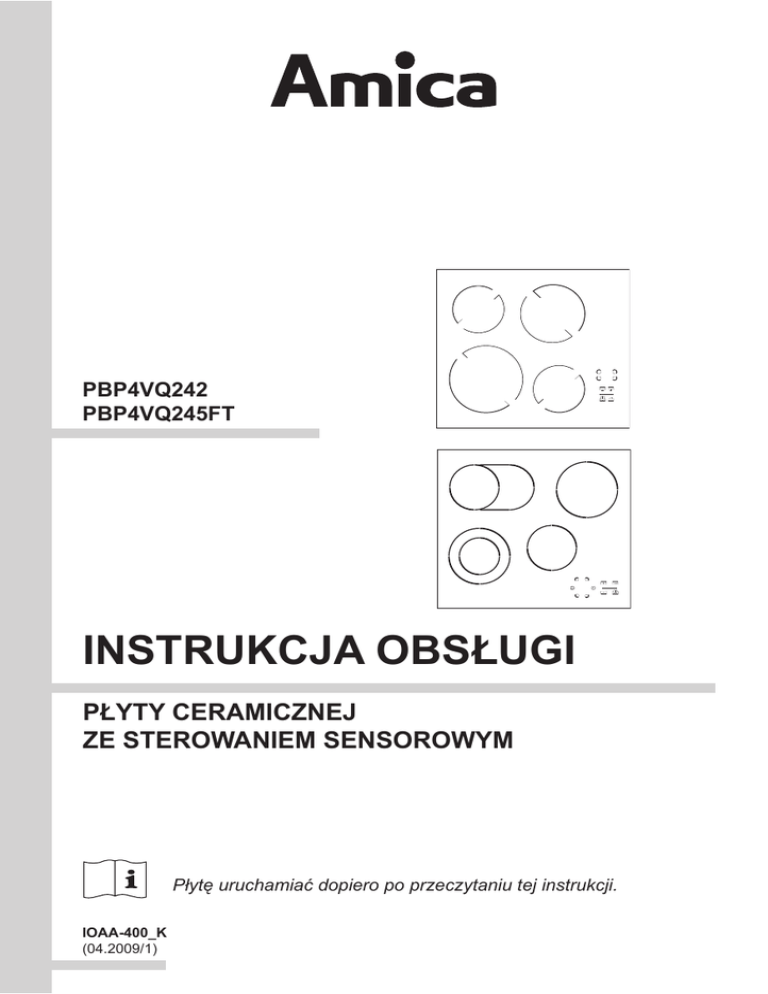 PBP4VQ242 PBP4VQ245FT INSTRUKCJA OBSŁUGI PŁYTY CERAMICZNEJ ZE STEROWANIEM SENSOROWYM Płytę uruchamiać dopiero po przeczytaniu tej instrukcji. IOAA-400_K (04.2009/1) SZANOWNY KLIENCIE, Płyta Amica to połączenie wyjątkowej łatwości obsługi i doskonałej efektywności. Po przeczytaniu instrukcji, obsługa płyty nie będzie problemem. Płyta, która opuściła fabrykę była dokładnie sprawdzona przed zapakowaniem pod względem bezpieczeństwa i funkcjonalności na stanowiskach kontrolnych. Prosimy Państwa o uważną lekturę instrukcji obsługi przed uruchomieniem urządzenia. Przestrzeganie zawartych w niej wskazówek uchroni Państwa przed niewłaściwym użytko waniem. Instrukcję należy zachować i przechowywać tak, aby mieć ją zawsze pod ręką. Należy dokładnie przestrzegać instrukcji obsługi w celu uniknięcia nieszczęśliwych wypad ków. Uwaga! Urządzenie obsługiwać tylko po przeczytaniu / zrozumieniu niniejszej instrukcji. Urządzenie zostało zaprojektowane wyłącznie jako urządzenie do gotowania.Każde inne jego zastosowanie (np. do ogrzewania pomieszczeń) jest niezgodne z jego przeznaczeniem i może być niebezpieczne. Producent zastrzega sobie możliwość dokonywania zmian nie wpływających na dzia łanie urządzenia. Oświadczenie producenta Producent deklaruje niniejszym, że wyrób ten spełnia zasadnicze wymagania wymienionych poniżej dyrektyw europejskich: ● dyrektywy niskonapięciowej 2006/95/WE, ● dyrektywy kompatybilności elektromagnetycznej 2004/108/WE, i dlatego wyrób został oznakowany oraz została wystawiona dla niego deklaracja zgodności udostępniana organom nadzorującym rynek. Masz wątpliwości? Nie wszystko, co przeczytałeś w instrukcji jest zrozumiałe zadzwoń do Centrum Serwisowego, gdzie uzyskasz wszechstronną pomoc. tel.0-801 801 800 2 Płyta ceramiczna ze sterowaniem sensorowym spis treści Podstawowe informacje............................................................................................2 Wskazówki odnośnie bezpieczeństwa......................................................................4 Jak oszczędzać energię..............................................................................................5 Rozpakowanie...........................................................................................................6 Usuwanie zużytych urządzeń....................................................................................6 Opis wyrobu..............................................................................................................7 Instalacja...................................................................................................................9 Przyłączenie płyty do instalacji elektrycznej.............................................................10 Wskazówki dla instalatora...........................................................................................11 Obsługa..................................................................................................................12 Przed pierwszym włączeniem płyty.........................................................................12 Odpowiednie naczynia do gotowania.......................................................................13 Panel sterowania......................................................................................................14 Włączenie płyty grzejnej..........................................................................................14 Włączenie pola grzejngo...................................................................................14 Nastawienie stopnia mocy grzania...........................................................................15 Układ automatycznego zmniejszania mocy grzania.................................................15 Wyłączanie całej płyty grzejnej...............................................................................16 Wyłączanie jednego pola grzejnego......................................................................16 Funkcja blokady.........................................................................................16 Zablokowanie płyty grzejnej...........................................................................17 Odblokowanie płyty grzejnej...................................................................................17 Wskaźnik nagrzania szczątkowego.......................................................................17 Ograniczenie czasu pracy........................................................................................18 Czyszczenie i konserwacja...................................................................................19 Postępowanie w sytuacjach awaryjnych............................................................21 Dane techniczne....................................................................................................23 Gwarancja, obsługa posprzedażna.....................................................................23 Płyta ceramiczna ze sterowaniem sensorowym 3 WSKAZÓWKI ODNOŚNIE BEZPIECZEŃSTWA • Przed pierwszym użyciem ceramicznej płyty grzejnej należy przeczytać instrukcję użytko wania. W ten sposób zapewniamy sobie bezpieczeństwo oraz unikamy uszkodzenia płyty. • Jeżeli płyta ceramiczna użytkowana jest w bezpośredniej bliskości radia, telewizora lub innego urządzenia emitującego, należy sprawdzić, czy zapewniona jest prawidłowość działania panelu sterującego płyty ceramicznej. • Płytę winien podłączyć uprawniony instalator – elektryk. • Nie wolno instalować płyty w pobliżu urządzeń chłodniczych. • Meble w których zabudowywana jest płyta muszą być odporne na temperatury ok 100oC. Dotyczy to oklein,krawędzi,powierzchni wykonanych z tworzyw sztucznych, klejów oraz lakierów. • Płytę należy użytkować tylko po jej zabudowaniu. W ten sposób zabezpieczamy się przed