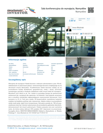 Sala konferencyjna do wynajęcia, Namysłów Namysłów Cena 2 257 zł Powierzchnia Piętro 98 m2 1/1 Irena Woźniak Dyrektor Oddziału 513 134 067 77 410 57 37 Informacje ogólne Nr oferty 21411 Ogrzewanie centralne ogrzewanie Województwo Opolskie Typ podłączenia wody miejska Miasto Namysłów Prąd tak Piętro 1 Siła tak Pięter w budynku 1 Kanalizacja miejska Pow. użytkowa 98 m2 Zwalniany od zaraz Typ nieruchomości biura/sala konferencyjna Rodzaj łącz jest Liczba telefonów 5 Szczegółowy opis Oferujemy do wynajęcia 4 lokale biurowe z własnym sekretariatem o pow. 98 m2, zlokalizowane na pierwszym piętrze, nowoczesnego biurowca znajdującego się na obrzeżach miasta Namysłów. Przedmiotowe lokale biurowe nadają się na prowadzenie każdej działalności gospodarczej, małej i dużej, ponieważ wynajmujący posiada w budynku dodatkowo wiele innych lokali do wynajęcia . Wysokość tych lokali to ok. 3m. Lokale te posiadają dostęp do pomieszczeń sanitarnych jak i socjalnych dla najemców i ich klientów. Cały budynek utrzymany jest w wysokim standardzie odpowiadającym nowoczesnym biurowcom. Cena wynajmu to 23 zł /1m2 plus media. W bezpośrednim sąsiedztwie budynku znajduje się bezpłatny parking i plac manewrowy. Idealne miejsce na prowadzenie szkoły nauki jazdy, bądz firmy transportowej. Całe piętro posiada ok. 100 m2 pow. użytkowej może być również wykorzystana do prowadzenia gabinetów lekarskich, dentystycznych lub innych pokrewnych. Podana powyżej cena jest wartością netto, do której należy doliczyć 23% podatku VAT. Zapraszam na prezentację. Szczegóły oferty: INVESTOR NIERUCHOMOŚCI Oddział w Namysłowie, ul. Wojska Polskiego 9 - Irena Woźniak tel. 513 134 067 lub 77 410 57 37. Nota prawna: Informacje dotyczące opisu nieruchomości podane są przez właściciela, mają charakter wyłącznie informacyjny i mogą podlegać aktualizacji. Oferta dotycząca nieruchomości stanowi zaproszenie do rokowań zgodnie z art. 71 Kodeksu Cywilnego i nie stanowi oferty określonej w art. 66 i następnych KC. Oddział Namysłów, ul. Wojska Polskiego 9 , 46-100 Namysłów 77 400 01 76 • [email protected] • www.investor.net.pl 2017-03-07 07:08:17 Strona 1 z 1