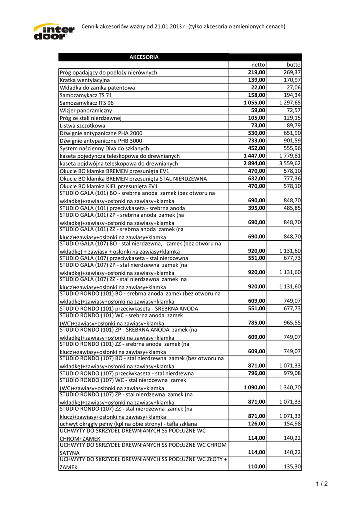 Cennik akcesoriów ważny od 21.01.2013 r. (tylko akcesoria o zmienionych cenach) AKCESORIA Próg opadający do podłoży nierównych Kratka wentylacyjna Wkładka do zamka patentowa Samozamykacz TS 71 Samozamykacz ITS 96 Wizjer panoramiczny Próg ze stali nierdzewnej Listwa szczotkowa Dźwignie antypaniczne PHA 2000 Dźwignie antypaniczne PHB 3000 System naścienny Diva do szklanych kaseta pojedyncza teleskopowa do drewnianych kaseta pojdwójna teleskopowa do drewnianych Okucie BO klamka BREMEN przesunięta EV1 Okucie BO klamka BREMEN przesunięta STAL NIERDZEWNA Okucie BO klamka KIEL przesunięta EV1 STUDIO GALA (101) BO - srebrna anoda zamek (bez otworu na wkładkę)+zawiasy+osłonki na zawiasy+klamka STUDIO GALA (101) przeciwkaseta - srebrna anoda STUDIO GALA (101) ZP - srebrna anoda zamek (na wkładkę)+zawiasy+osłonki na zawiasy+klamka STUDIO GALA (101) ZZ - srebrna anoda zamek (na klucz)+zawiasy+osłonki na zawiasy+klamka STUDIO GALA (107) BO - stal nierdzewna, zamek (bez otworu na wkładkę) + zawiasy + osłonki na zawiasy+klamka STUDIO GALA (107) przeciwkaseta - stal nierdzewna STUDIO GALA (107) ZP - stal nierdzewna zamek (na wkładkę)+zawiasy+osłonki na zawiasy+klamka STUDIO GALA (107) ZZ - stal nierdzewna zamek (na klucz)+zawiasy+osłonki na zawiasy+klamka STUDIO RONDO (101) BO - srebrna anoda zamek (bez otworu na wkładkę)+zawiasy+osłonki na zawiasy+klamka STUDIO RONDO (101) przeciwkaseta - SREBRNA ANODA STUDIO RONDO (101) WC - srebrna anoda zamek (WC)+zawiasy+osłonki na zawiasy+klamka STUDIO RONDO (101) ZP - SREBRNA ANODA zamek (na wkładkę)+zawiasy+osłonki na zawiasy+klamka STUDIO RONDO (101) ZZ - srebrna anoda zamek (na klucz)+zawiasy+osłonki na zawiasy+klamka STUDIO RONDO (107) BO - stal nierdzewna zamek (bez otworu na wkładkę)+zawiasy+osłonki na zawiasy+klamka STUDIO RONDO (107) przeciwkaseta - stal nierdzewna STUDIO RONDO (107) WC - stal nierdzewna zamek (WC)+zawiasy+osłonki na zawiasy+klamka STUDIO RONDO (107) ZP - stal nierdzewna zamek (na wkładkę)+zawiasy+osłonki na zawiasy+klamka STUDIO RONDO (107) ZZ - stal nierdzewna zamek (na klucz)+zawiasy+osłonki na zawiasy+klamka uchwyt okrągły pełny (kpl na obie strony) - tafla szklana UCHWYTY DO SKRZYDEŁ DREWNIANYCH SS PODŁUŻNE WC CHROM+ZAMEK UCHWYTY DO SKRZYDEŁ DREWNIANYCH SS PODŁUŻNE WC CHROM SATYNA UCHWYTY DO SKRZYDEŁ DREWNIANYCH SS PODŁUŻNE WC ZŁOTY + ZAMEK netto 219,00 139,00 22,00 158,00 1 055,00 59,00 105,00 73,00 530,00 733,00 452,00 1 447,00 2 894,00 470,00 632,00 470,00 butto 269,37 170,97 27,06 194,34 1 297,65 72,57 129,15 89,79 651,90 901,59 555,96 1 779,81 3 559,62 578,10 777,36 578,10 690,00 395,00 848,70 485,85 690,00 848,70 690,00 848,70 920,00 551,00 1 131,60 677,73 920,00 1 131,60 920,00 1 131,60 609,00 551,00 749,07 677,73 785,00 965,55 609,00 749,07 609,00 749,07 871,00 796,00 1 071,33 979,08 1 090,00 1 340,70 871,00 1 071,33 871,00 126,00 1 071,33 154,98 114,00 140,22 114,00 140,22 110,00 135,30 1/2 Cennik akcesoriów ważny od 21.01.2013 r. (tylko akcesoria o zmienionych cenach) UCHWYTY DO SKRZYDEŁ DREWNIANYCH SS PODŁUŻNE WC + ZAMEKZŁOTY SATYNA reling prosty (VDS) reling kwadratowy (TUPAI) 110,00 306,00 314,00 135,30 376,38 386,22 2/2