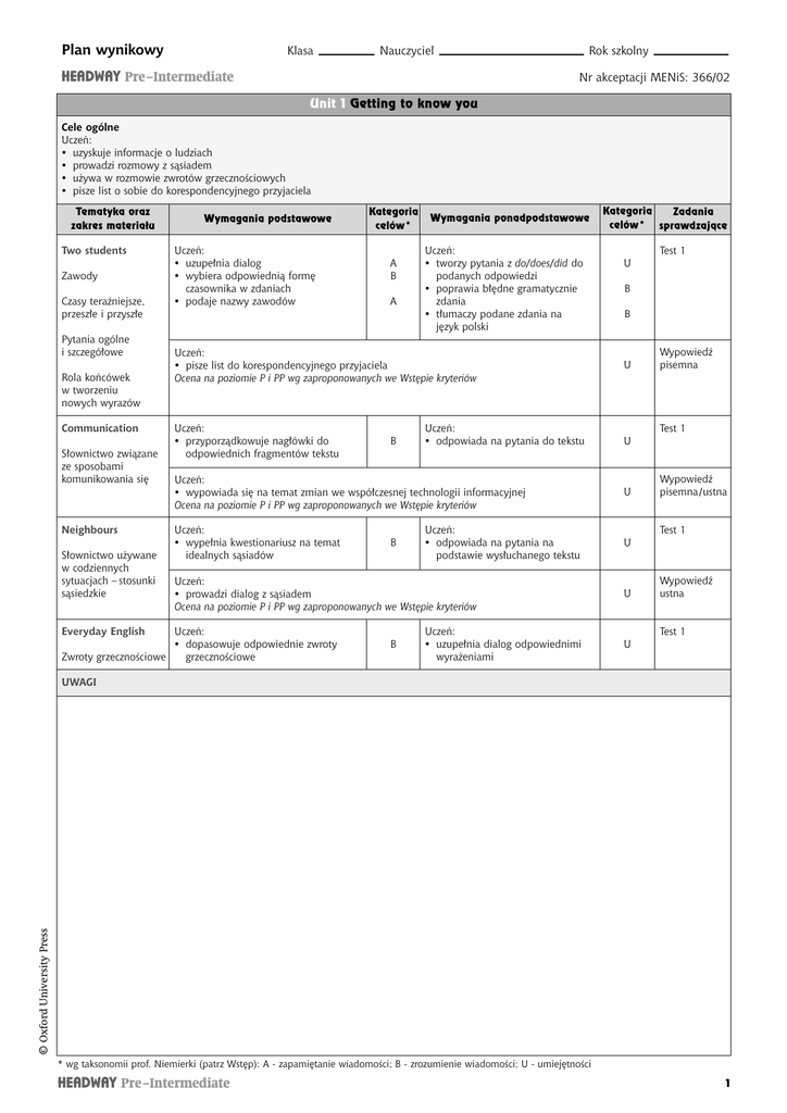 Plan wynikowy Klasa Nauczyciel HEADWAY Pre–Intermediate Rok szkolny Nr akceptacji MENiS: 366/02 Unit 1 Getting to know you Cele ogólne Uczeƒ: uzyskuje informacje o ludziach prowadzi rozmowy z sàsiadem u˝ywa w rozmowie zwrotów grzecznoÊciowych pisze list o sobie do korespondencyjnego przyjaciela Tematyka oraz zakres materiału Two students Zawody Czasy teraêniejsze, przesz∏e i przysz∏e Pytania ogólne i szczegó∏owe Rola koƒcówek w tworzeniu nowych wyrazów Communication S∏ownictwo zwiàzane ze sposobami komunikowania si´ Neighbours S∏ownictwo u˝ywane w codziennych sytuacjach – stosunki sàsiedzkie Wymagania podstawowe Uczeƒ: uzupe∏nia dialog wybiera odpowiednià form´ czasownika w zdaniach podaje nazwy zawodów Kategoria celów* A B A Wymagania ponadpodstawowe Uczeƒ: tworzy pytania z do/does/did do podanych odpowiedzi poprawia b∏´dne gramatycznie zdania t∏umaczy podane zdania na j´zyk polski Kategoria Zadania celów* sprawdzające Test 1 U B B Uczeƒ: pisze list do korespondencyjnego przyjaciela Ocena na poziomie P i PP wg zaproponowanych we Wst´pie kryteriów U Uczeƒ: przyporzàdkowuje nag∏ówki do odpowiednich fragmentów tekstu U B Uczeƒ: odpowiada na pytania do tekstu Test 1 Uczeƒ: wypowiada si´ na temat zmian we wspó∏czesnej technologii informacyjnej Ocena na poziomie P i PP wg zaproponowanych we Wst´pie kryteriów U Uczeƒ: wype∏nia kwestionariusz na temat idealnych sàsiadów U B Uczeƒ: odpowiada na pytania na podstawie wys∏uchanego tekstu Uczeƒ: prowadzi dialog z sàsiadem Ocena na poziomie P i PP wg zaproponowanych we Wst´pie kryteriów Everyday English Uczeƒ: dopasowuje odpowiednie zwroty Zwroty grzecznoÊciowe grzecznoÊciowe B Uczeƒ: uzupe∏nia dialog odpowiednimi wyra˝eniami Wypowiedê pisemna Wypowiedê pisemna /ustna Test 1 U Wypowiedê ustna Test 1 U © Oxford University Press UWAGI * wg taksonomii prof. Niemierki (patrz Wst´p): A - zapami´tanie wiadomoÊci; B - zrozumienie wiadomoÊci; U - umiej´tnoÊci HEADWAY Pre–Intermediate 1 Unit 2 The way we live Cele ogólne Uczeƒ: opisuje pomieszczenia opisuje ˝ycie w swoim kraju ocenia czyjeÊ post´powanie prowadzi rozmow´ towarzyskà Tematyka oraz zakres materiału People and places Kraje angloj´zyczne Present simple i present continuous Wymagania podstawowe Uczeƒ: nadaje czasownikom form´ czasu present simple dokonuje wyboru formy czasownika dodaje koƒcówki -ing do podanych czasowników odpowiada na podane pytania Kategoria celów A B A U Wymagania ponadpodstawowe Uczeƒ: wskazuje zdania poprawne gramatycznie uzupe∏nia tabel´ na podstawie informacji uzyskanych od kolegi t∏umaczy podane zdania na j´zyk polski Kategoria Zadania celów sprawdzające Test 2 B U B Have/have got S∏ownictwo zwiàzane z domem – czynnoÊci i sprz´ty Living in the USA Wyrazy i wyra˝enia zwiàzane z ocenà i opisem sposobu ˝ycia w obcym kraju You drive me mad S∏ownictwo i zwroty zwiàzane z wyra˝aniem opinii na temat nawyków Everyday English Zasady i zwroty przydatne w prowadzeniu rozmowy towarzyskiej Uczeƒ: opisuje ulubione pomieszczenie Ocena na poziomie P i PP wg zaproponowanych we Wst´pie kryteriów U Uczeƒ: wyra˝a opini´ na temat ˝ycia w swoim kraju rozwa˝a podobieƒstwa i ró˝nice mi´dzy cudzoziemcami i swoimi rodakami Ocena na poziomie P i PP wg zaproponowanych we Wst´pie kryteriów U U Uczeƒ: porównuje siebie z innymi ludêmi Ocena na poziomie P i PP wg zaproponowanych we Wst´pie kryteriów U Uczeƒ: ocenia prawdziwoÊç podanych zdaƒ na podstawie wys∏uchanego tekstu U Uczeƒ: uzupe∏nia podane zdania o bliskich osobach Uczeƒ: prowadzi rozmow´ towarzyskà, przyjmujàc wymyÊlonà przez siebie to˝samoÊç Ocena na poziomie P i PP wg zaproponowanych we Wst´pie kryteriów Wypowiedê ustna Wypowiedê ustna Wypowiedê pisemna Test 2 U U Wypowiedê ustna © Oxford University Press UWAGI HEADWAY Pre–Intermediate 2 Unit 3 It all went wrong Cele ogólne Uczeƒ: opowiada o wydarzeniach z przesz∏oÊci, u˝ywajàc czasów past simple i past continuous podaje daty Tematyka oraz zakres materiału The burglars’ friend Past simple Newspaper stories Past continuous A radio drama Sposób narracji w czasie past simple Everyday English Wyra˝enia czasu Wymagania podstawowe Uczeƒ: nadaje podanym czasownikom form´ past simple uzupe∏nia tekst czasownikami w odpowiedniej formie Uczeƒ: wybiera form´ past simple lub past continuous w podanym kontekÊcie uzupe∏nia artyku∏ podanymi czasownikami, nadajàc im form´ past simple Uczeƒ: ocenia prawdziwoÊç zdaƒ na podstawie tekstu Kategoria celów A B B U U Wymagania ponadpodstawowe Uczeƒ: tworzy zdania pytajàce do podanych odpowiedzi t∏umaczy podane zdania na j´zyk polski Uczeƒ: uzupe∏nia zdania czasownikami w formie past simple i past continuous wstawia podane zdania w odpowiednie miejsce w tekÊcie Uczeƒ: odpowiada na pytania do tekstu Kategoria Zadania celów sprawdzające Test 3 B B Test 3 B U Test 3 U Uczeƒ: opowiada przeczytanà histori´ w∏asnymi s∏owami Ocena na poziomie P i PP wg zaproponowanych we Wst´pie kryteriów U Wypowiedê ustna Uczeƒ: opisuje niepomyÊlny okres w swoim ˝yciu Ocena na poziomie P i PP wg zaproponowanych we Wst´pie kryteriów U Wypowiedê pisemna Uczeƒ: uzupe∏nia wyra˝enia czasu odpowiednimi przyimkami A A Uczeƒ: podaje sposoby odczytywania dat Test 3 Daty © Oxford University Press UWAGI HEADWAY Pre–Intermediate 3 Unit 4 Let’s go shopping! Cele ogólne Uczeƒ: okreÊla liczb´ i iloÊç przedmiotów prowadzi rozmowy „w sklepie” wype∏nia formularz Tematyka oraz zakres materiału Wymagania podstawowe Kategoria celów The weekend shop Uczeƒ: nadaje podanym rzeczownikom Rzeczowniki policzalne liczb´ mnogà i niepoliczalne z: uzupe∏nia zdania odpowiednimi much/many, some/any, przedimkami a few/a little, a lot/lots of uzupe∏nia zdania odpowiednimi wyrazami Something/anything, someone/anyone, somewhere/anywhere A A Wymagania ponadpodstaw