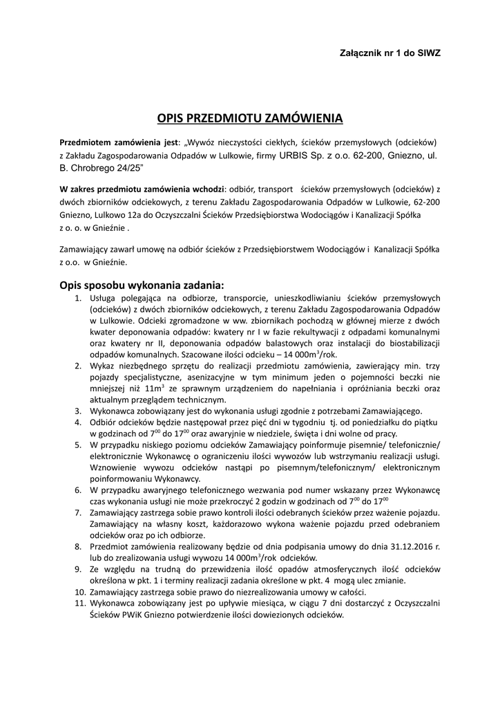 Załącznik nr 1 do SIWZ OPIS PRZEDMIOTU ZAMÓWIENIA Przedmiotem zamówienia jest: „Wywóz nieczystości ciekłych, ścieków przemysłowych (odcieków) z Zakładu Zagospodarowania Odpadów w Lulkowie, firmy URBIS Sp. z o.o. 62-200, Gniezno, ul. B. Chrobrego 24/25” W zakres przedmiotu zamówienia wchodzi: odbiór, transport ścieków przemysłowych (odcieków) z dwóch zbiorników odciekowych, z terenu Zakładu Zagospodarowania Odpadów w Lulkowie, 62-200 Gniezno, Lulkowo 12a do Oczyszczalni Ścieków Przedsiębiorstwa Wodociągów i Kanalizacji Spółka z o. o. w Gnieźnie . Zamawiający zawarł umowę na odbiór ścieków z Przedsiębiorstwem Wodociągów i Kanalizacji Spółka z o.o. w Gnieźnie. Opis sposobu wykonania zadania: 1. Usługa polegająca na odbiorze, transporcie, unieszkodliwianiu ścieków przemysłowych (odcieków) z dwóch zbiorników odciekowych, z terenu Zakładu Zagospodarowania Odpadów w Lulkowie. Odcieki zgromadzone w ww. zbiornikach pochodzą w głównej mierze z dwóch kwater deponowania odpadów: kwatery nr I w fazie rekultywacji z odpadami komunalnymi oraz kwatery nr II, deponowania odpadów balastowych oraz instalacji do biostabilizacji odpadów komunalnych. Szacowane ilości odcieku – 14 000m 3/rok. 2. Wykaz niezbędnego sprzętu do realizacji przedmiotu zamówienia, zawierający min. trzy pojazdy specjalistyczne, asenizacyjne w tym minimum jeden o pojemności beczki nie mniejszej niż 11m3 ze sprawnym urządzeniem do napełniania i opróżniania beczki oraz aktualnym przeglądem technicznym. 3. Wykonawca zobowiązany jest do wykonania usługi zgodnie z potrzebami Zamawiającego. 4. Odbiór odcieków będzie następował przez pięć dni w tygodniu tj. od poniedziałku do piątku w godzinach od 700 do 1700 oraz awaryjnie w niedziele, święta i dni wolne od pracy. 5. W przypadku niskiego poziomu odcieków Zamawiający poinformuje pisemnie/ telefonicznie/ elektronicznie Wykonawcę o ograniczeniu ilości wywozów lub wstrzymaniu realizacji usługi. Wznowienie wywozu odcieków nastąpi po pisemnym/telefonicznym/ elektronicznym poinformowaniu Wykonawcy. 6. W przypadku awaryjnego telefonicznego wezwania pod numer wskazany przez Wykonawcę czas wykonania usługi nie może przekroczyć 2 godzin w godzinach od 7 00 do 1700 7. Zamawiający zastrzega sobie prawo kontroli ilości odebranych ścieków przez ważenie pojazdu. Zamawiający na własny koszt, każdorazowo wykona ważenie pojazdu przed odebraniem odcieków oraz po ich odbiorze. 8. Przedmiot zamówienia realizowany będzie od dnia podpisania umowy do dnia 31.12.2016 r. lub do zrealizowania usługi wywozu 14 000m3/rok odcieków. 9. Ze względu na trudną do przewidzenia ilość opadów atmosferycznych ilość odcieków określona w pkt. 1 i terminy realizacji zadania określone w pkt. 4 mogą ulec zmianie. 10. Zamawiający zastrzega sobie prawo do niezrealizowania umowy w całości. 11. Wykonawca zobowiązany jest po upływie miesiąca, w ciągu 7 dni dostarczyć z Oczyszczalni Ścieków PWiK Gniezno potwierdzenie ilości dowiezionych odcieków. 12. W przypadku rozbieżności powyżej 5% w ilości pomiędzy masą netto ważenia pojazdu, a masą ścieków dostarczonych do Oczyszczalni Ścieków Wykonawca na fakturze wykaże niższą ilość odcieków. 13.W przypadku rozbieżności do 5%, Wykonawca obciąży Zamawiającego za ilość odcieków wykazaną zgodnie z miesięcznym zestawieniem odbioru nieczystości ciekłych z Oczyszczalni Ścieków – załącznik nr 9 do SIWZ. 13. Ilości w Mg będą przeliczone na ilość w m 3 w stosunku 1:1. 14. Podstawą do przyjęcia przez Zamawiającego faktury jest dołączenie następujących dokumentów: a) pisemne potwierdzenia ilości odebranych odcieków z Oczyszczalni zgodnie z pkt. 12, b) miesięczne zestawienie wywozu nieczystości ciekłych - załącznik nr 9 do SIWZ. wystawiony przez Wykonawcę i potwierdzony przez przedstawiciela Oczyszczalni Ścieków i Zamawiającego, c) dokumenty ważenia pojazdu zgodnie z pkt. 6,
