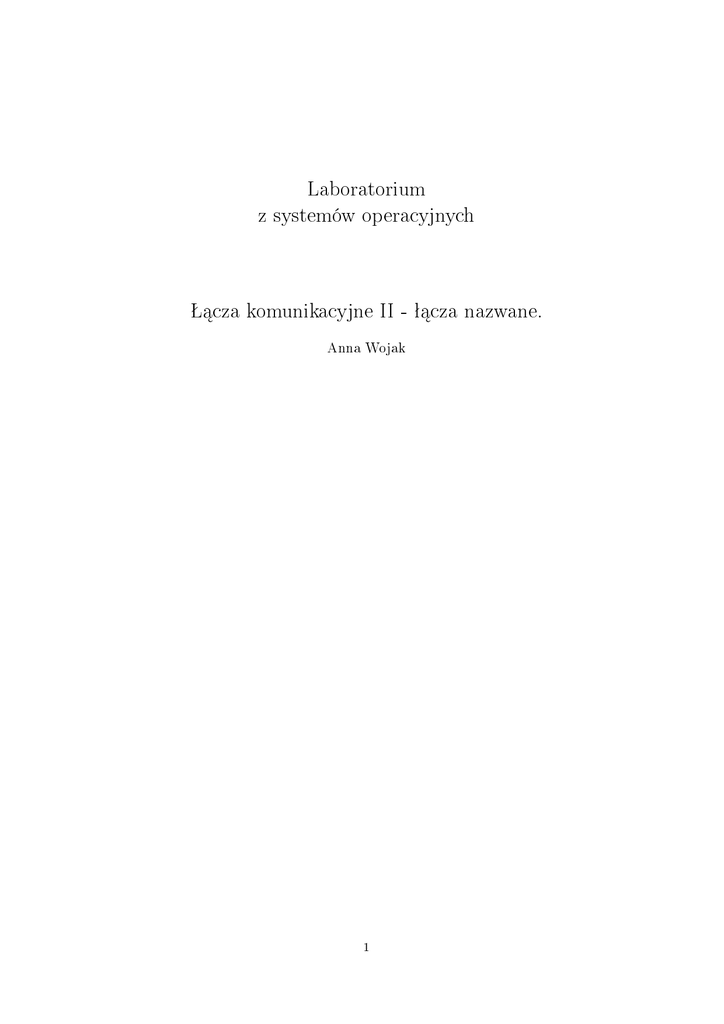 Laboratorium z systemów operacyjnych ¡cza komunikacyjne II - ª¡cza nazwane. Anna Wojak 1 Zagadnienia do samodzielnego przygotowania: • ª¡cze komunikacyjne i ich charakteryzacja, potok nazwany, • cechy potoków nazwanych, dziedziczenie deskryptorów otwartch plików od procesu macierzystego, • i-w¦zeª, PIPE_BUF, dowi¡zania twarde, dowiazania mi¦kkie, umask. 1 ¡cza nazwane - funkcje systemowe. Kolejki FIFO - inaczej nazywane potokami nazwanymi, s¡ plikami specjalnego rodzaju, które istniej¡ pod podan¡ nazw¡ w systemie plików. Zachowuj¡ si¦ one podobnie do potoków nienazwanych utworzonych za pomoc¡ funkcji pipe. Dzi¦ki kolejkom fo istnieje w systemie komunikacja miedzy procesami nie zwi¡zanymi ze sob¡. Jeden z procesów otwiera plik FIFO do zapisu, drugi do odczytu, po czym dane mog¡ przepªywa¢ przez kolejk¦ jak przez zwykªy potok nienazwany. Do tworzenia ª¡cza oraz komunikacji pomiedzy procesami za pomoc¡ tego» ª¡cza sªu»¡ nast¦puj¡ce funkcje: mkfo() int mkfo ( char * path, mode_t mode ) • funkcja tworzy plik typu kolejka FIFO, • pierwszy argument path jest nazw¡ kolejki wraz z ±cie»k¡ gdzie zostanie utworzona, • drugi argument okre±la uprawnienia wªa±ciciela potoku, grupy i innych u»ytkowników (prawa dostepu), • uprawnienia musz¡ zawiera¢ zarówno pozwolenie na zapis, jak i na odczyt, • okre±lanie praw dost¦pu jest modykowane przez ustawienia maski u»ytkownika, • w przypadku poprawnego wykonania funkcji zwracana jest warto±¢ 0, natomiast w przypadku bª¦du -1, • mo»liwe kody bª¦dów: EXIST - plik o podanej nazwie ju» istnieje, u»yto ag O_CREAT i O_EXCL, EFAULT - nazwa path wskazuje poza dost¦pn¡ przestrze« adresow¡, EACCES - »¡dany dost¦p do pliku nie jest dozwolony, ENFILE - osi¡gni¦to limit otwartych plików w systemie, EMFILE - proces ju» otworzyª dozwolon¡ maksymaln¡ liczb¦ plików, EROFS - »¡dane jest otwarcie w trybie zapisu pliku b¦d¡cego plikiem tylko do odczytu, • do rozpocz¦cia komunikacji za pomoc¡ kolejki jeden program musi otworzy¢ j¡ do zapisu, a drugi do odczytu, wykorzystuj¡c niskopoziomowe funkcje open, close, • po utworzeniu i otworzeniu kolejki mozemy zapisywac i odczytywa¢ z niej dane u»ywaj¡c funkcji systemowych write, read (omówionych na poprzednich zaj¦ciach), • do kolejki mo»e pisac i czytac wiele procesów cho¢ jej rozmiar jest ograniczony. Ilo±¢ danych, jakie mog¡ znajdowa¢ si¦ w kolejce w danym momencie okre±la staªa PIPE_BUF, której wielko±¢ mo»na sprawdzi¢ w pliku nagªówkowym <limits.h>. W systemach unixowych jest to 4096 bajtów. • zastosowaniem kolejki FIFO jest przesyªanie danych mi¦dzy klientem a serwerem: 2 Rysunek 1: Schemat komunikacji przez kolejk¦ FIFO serwer tworzy kolejk¦ FIFO klienci wysyªaj¡ komunikaty do serwera za po±rednictwem znanej nazwy kolejki, serwer czyta dane z kolejki, nale»y pami¦ta¢ o rozmiarze wysyªanych danych - aby nie ulegªy wymieszaniu nie mog¡ przekroczy¢ rozmiaru PIPE_BUF. open() int open (char*pathname,intmode, int ags) • poprawne wykonanie funkcji zwraca deskryptor kolejki FIFO, • w przypadku wyst¡pienia bª¦du -1, • pierwszy argument pathname okre±la nazw¦ ±cie»kow¡ pliku specjalnego b¦d¡cego kolejk¡ fo, • drugi argument mode okre±la prawa dost¦pu do ª¡cza, • agi: 3 O_RDONLY - funkcja blokuje si¦ do momentu, a» inny proces nie otworzy kolejki FIFO do zapisu, O_WRONLY- funkcja blokuje si¦ do momentu, a» inny proces nie otworzy kolejki FIFO do odczytu, O_RDONLY | O_NONBLOCK - funkcja powraca natychmiast, O_WRONLY | O_NONBLOCK - funkcja powraca natychmiast i przeka»e bª¡d je»eli nie ma procesu, który ma otwart¡ kolejk¦ FIFO do odczytu, W przeciwie«stwie do ª¡czy nienazwanych, pliki FIFO pozostaj¡ w systemie plików po zako«czeniu ich u»ywania przez wszystkie procesy. Dopiero jawne wywoªanie funkcji unlink() powoduje usuni¦cie ª¡cza nazwanego. unlink() int unlink(const char *pathname) • w przypadku powodzenia zwraca 0, a w przypadku bledu -1. • unlink() usuwa dowiazanie do pliku z katalogu oraz zmniejsza o jeden licznik dowi¡zan do tego pliku przechowywany w i-we¹le. Gdy licznik przyjmie wartosc zero, to zostanie usuniety równie» sam plik. Oznacza to udostepnienie zajmowanej przez niego przestrzeni dyskowej innym plikom (dodanie jej do listy wolnych bloków) oraz zwolnienie samego i-wezªa. Je»eli licznik dowiaza« osi¡gnie warto±¢ zero, podczas gdy dany plik jest nadal u»ywany (tzn. otwarty) przez inny proces, to usuni¦cie pliku b¦dzie wstrzymywane do czasu jego zamkni¦cia. 2 Zadania do samodzielnego wykonania 1. Napisa¢ program który tworzy trzy procesy - proces macierzysty i jego dwa procesy potomne. Pierwszy z procesów potomnych zapisuje do potoku dowolne zdanie, a drugi proces potomny odczytuje ten napis. 2. Napisa¢ program który tworzy trzy procesy, z których dwa zapisuj¡ do potoku, a trzeci odczytuje z niego i drukuje otrzymane komunikaty. 3. Napisa¢ programy realizuj¡ce nast¦puj¡ce potoki: • ls | wc, • nger | cut -d' ' -f1, | more. • ls -l | grep d • ps -ef| tr -s ' ' :| cut -d: -f1 |sort| uniq -c |sort n • cat /etc/group | head -5 > grupy.txt, • nd /usr/bin -type f -atime +100 -print > znalezione.txt, • ls -R / | sort | uniq | less, 4. Napisa¢ program tworz¡cy dwa procesy: klienta i serwera. Serwer tworzy ogólnodost¦pn¡ kolejk¦ FIFO, i czeka na zgªoszenia klientów. Ka»dy klient tworzy wªasn¡ kolejk¦, poprzez któr¡ b¦d¡ przychodzi¢ odpowiedzi serwera. Zadaniem klienta jest przesªanie nazwy stworzonej przez siebie kolejki, a serwera odesªaniem poprzez kolejk¦ stworzon¡ przez klienta wyniku polecenia ls. 4 5. Zmodykowa¢ poprzedni program, tak, by kolejka utworzona przez klienta byªa dwukierunkowa, klient publiczn¡ kolejk¡ powinien przesyªa¢ nazw¦ stworzonej przez siebie kolejki. Dalsza wymiana komunikatów powinna odbywa¢ si¦ poprzez kolejk¦ stworzon¡ przez klie