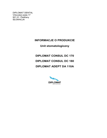 DIPLOMAT DENTAL Vrbovská cesta 17 921 01 Piešťany SŁOWACJA INFORMACJE O PRODUKCIE Unit stomatologiczny DIPLOMAT CONSUL DC 170 DIPLOMAT CONSUL DC 180 DIPLOMAT ADEPT DA 110A SPIS TREŚCI 1. WSTĘP ............................................................................................................................. 3 2. OPIS PRODUKTU ............................................................................................................ 4 3. DANE TECHNICZNE ........................................................................................................ 5 4. OPIS UNITU STOMATOLOGICZNEGO ........................................................................... 6 5. WYMOGI TECHNICZNE ................................................................................................... 9 5.1. WYMAGANIA DOTYCZĄCE POMIESZCZENIA ........................................................... 9 5.2. WYMAGANIA DOTYCZĄCE MEDIÓW ......................................................................... 9 5.3. PODŁOŻE.................................................................................................................... 10 5.4. OTOCZENIE ................................................................................................................ 10 6.SKŁADANIE ORAZ INSTALACJA ................................................................................. 10 7. URUCHAMIANIE UNITU ................................................................................................ 10 8. OBSŁUGA UNITU .......................................................................................................... 11 8.1. STOLIK LEKARZA WRAZ Z NARZĘDZIAMI.............................................................. 11 8.1.1. OPIS PRZYCISKÓW ................................................................................................ 12 8.1.2. ZAPISYWANIE USTAWIEŃ ..................................................................................... 13 8.1.3. REGULACJA PRZEPŁYWU WODY CHŁODZĄCEJ NARZĘDZIA .......................... 13 8.1.4. TRAY STOLIK .......................................................................................................... 14 8.1.5. OBSŁUGA POSZCZEGÓLNYCH NARZĘDZI.......................................................... 14 8.2. STEROWNIK NOŻNY .................................................................................................. 16 8.3. BLOK SPLUWACZKI .................................................................................................. 17 8.3.1. PANEL ASYSTY Z TRZEMA UCHWYTAMI NA NARZĘDZIA ................................. 18 8.3.2. ŚLINOCIĄG .............................................................................................................. 18 8.3.3. MOŻLIWOŚCI KONFIGURACYJNE BLOKU SPLUWACZKI .................................. 18 8.4. STEROWANIE FOTELEM STOMATOLOGICZNYM ................................................... 19 8.5. LAMPA BEZCIENIOWA ............................................................................................. 19 8.6. ZAKOŃCZENIE PRACY .............................................................................................. 19 9. KONSERWACJA ........................................................................................................... 20 10. CZYSZCZENIE, DEZYNFEKCJA I STERYLIZACJA ................................................... 21 11. ZŁOMOWANIE UNITU STOMATOLOGICZNEGO ....................................................... 24 12. NAPRAWY SERWISOWE ............................................................................................ 24 13. ZAWARTOŚĆ OPAKOWANIA..................................................................................... 25 14. GWARANCJA .............................................................................................................. 25 15. TRANSPORT I SKŁADOWANIE .................................................................................. 25 15.1. TRANSPORT ............................................................................................................. 25 15.2. SKŁADOWANIE ........................................................................................................ 25 pl_dc170,dc180,da110a_2014_06 2/25 1. WSTĘP Niniejsza instrukcja obsługi dotyczy unitów stomatologicznych DIPLOMAT CONSUL DC 170, DC 180 i DIPLOMAT ADEPT DA 110A. Proszę o jej uważne przeczytanie przed przystąpieniem do pracy. Do obsługi unitu może przystąpić tylko osoba wykwalifikowana, która zapoznała się zarówno z niniejszą instrukcją obsługi jak i z innymi instrukcjami dołączonymi do urządzeń, które współdziałają z unitem. Aby unit służył niezawodnie, instalację, ustawienia oraz wszelkie modyfikacje należy zlecić autoryzowanemu serwisowi. Należy również spełnić wszelkie wymagania sprzętowe oraz instalacyjne określone w instrukcji obsługi unitu DIPLOMAT CONSUL DC 170, DIPLOMAT CONSUL DC 180 i DIPLOMAT ADEPT DA 110A. 1 1 2 2 Rys. 1.1 Diplomat Consul DC 170 Rys. 1.2 Diplomat Consul DC 180 1 2 Rys. 1.3 Diplomat Adept DA 110A 1. Tabliczka znamionowa 2. Wyłącznik główny pl_dc170,dc180,da110a_2014_06 3/25 2. OPIS PRODUKTU Unity stomatologiczne DIPLOMAT CONSUL DC 170 i DC 180 występują w wersji zawieszonej, z energoblokiem umieszczonym w podstawie fotela. Unit DIPLOMAT ADEPT DA 110A to unit stacjonarny. Unity można zawiesić na fotelach stomatologicznych DIPLOMAT DE20 lub DM20. Na bloku spluwaczki osadzono pantograf stolika lekarza wraz z narzędziami, a także słupek nośny z ramieniem pantograficznym bezcieniowej lampy stomatologicznej. Za pomocą sterownika nożnego steruje się wszystkimi narzędziami, z wyjątkiem strzykawko-dmuchawki, ślinociągu, systemu ssącego, lampy polimeryzacyjnej i kamery wewnątrzustnej. Na stoliku lekarza znajduje się klawiatura z przyciskami funkcyjnymi oraz identyfikacją świetlną. Uchwyt umożliwia swobodną regul