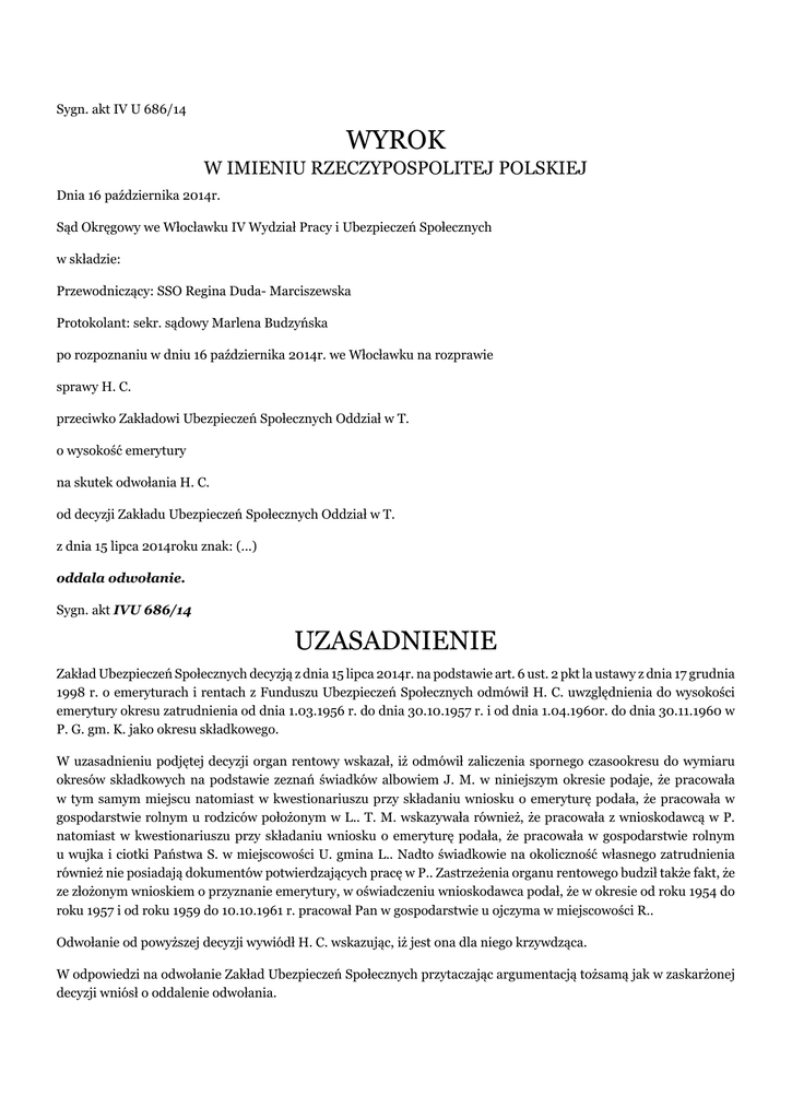 Sygn. akt IV U 686/14 WYROK W IMIENIU RZECZYPOSPOLITEJ POLSKIEJ Dnia 16 października 2014r. Sąd Okręgowy we Włocławku IV Wydział Pracy i Ubezpieczeń Społecznych w składzie: Przewodniczący: SSO Regina Duda- Marciszewska Protokolant: sekr. sądowy Marlena Budzyńska po rozpoznaniu w dniu 16 października 2014r. we Włocławku na rozprawie sprawy H. C. przeciwko Zakładowi Ubezpieczeń Społecznych Oddział w T. o wysokość emerytury na skutek odwołania H. C. od decyzji Zakładu Ubezpieczeń Społecznych Oddział w T. z dnia 15 lipca 2014roku znak: (...) oddala odwołanie. Sygn. akt IVU 686/14 UZASADNIENIE Zakład Ubezpieczeń Społecznych decyzją z dnia 15 lipca 2014r. na podstawie art. 6 ust. 2 pkt la ustawy z dnia 17 grudnia 1998 r. o emeryturach i rentach z Funduszu Ubezpieczeń Społecznych odmówił H. C. uwzględnienia do wysokości emerytury okresu zatrudnienia od dnia 1.03.1956 r. do dnia 30.10.1957 r. i od dnia 1.04.1960r. do dnia 30.11.1960 w P. G. gm. K. jako okresu składkowego. W uzasadnieniu podjętej decyzji organ rentowy wskazał, iż odmówił zaliczenia spornego czasookresu do wymiaru okresów składkowych na podstawie zeznań świadków albowiem J. M. w niniejszym okresie podaje, że pracowała w tym samym miejscu natomiast w kwestionariuszu przy składaniu wniosku o emeryturę podała, że pracowała w gospodarstwie rolnym u rodziców położonym w L.. T. M. wskazywała również, że pracowała z wnioskodawcą w P. natomiast w kwestionariuszu przy składaniu wniosku o emeryturę podała, że pracowała w gospodarstwie rolnym u wujka i ciotki Państwa S. w miejscowości U. gmina L.. Nadto świadkowie na okoliczność własnego zatrudnienia również nie posiadają dokumentów potwierdzających pracę w P.. Zastrzeżenia organu rentowego budził także fakt, że ze złożonym wnioskiem o przyznanie emerytury, w oświadczeniu wnioskodawca podał, że w okresie od roku 1954 do roku 1957 i od roku 1959 do 10.10.1961 r. pracował Pan w gospodarstwie u ojczyma w miejscowości R.. Odwołanie od powyższej decyzji wywiódł H. C. wskazując, iż jest ona dla niego krzywdząca. W odpowiedzi na odwołanie Zakład Ubezpieczeń Społecznych przytaczając argumentacją tożsamą jak w zaskarżonej decyzji wniósł o oddalenie odwołania. Sąd Okręgowy ustalił, co następuje: H. C. urodzony (...) od dnia 22 stycznia 1989roku pobierał rentę kolejowa II grupy. Od dnia 6 sierpnia 1997r. została mu przyznana emerytura kolejowa. Dowód: decyzja k. 1-2, k. 11-12 akt organu rentowego plik BR. W dniu 12 czerwca 2014roku H. C. złożył w Zakładzie Ubezpieczeń Społecznych wniosek o uwzględnienie okresu zatrudnienia wP.w G. do okresu składkowego, na dowód czego złożył zeznania świadków J. M. i T. M.. W odpowiedzi Zakład Ubezpieczeń Społecznych decyzją z dnia 15 lipca 2014r. na podstawie art. 6 ust. 2 pkt la ustawy z dnia 17 grudnia 1998 r. o emeryturach i rentach z Funduszu Ubezpieczeń Społecznych odmówił H. C. uwzględnienia do wysokości emerytury okresu zatrudnienia od dnia 1.03.1956 r. do dnia 30.10.1957 r. i od dnia 1.04.1960r. do dnia 30.11.1960 wP.— G. gm. K. jako okresu składkowego. Dowód: wniosek k.48, decyzja k. 54 akt organu rentowego plik BR. Sąd Okręgowy zważył, co następuje: Wysuniętym żądaniem H. C. domagał się doliczenia do okresu składkowego okresu zatrudnienia w P. G. od dnia 1 marca 1956r. do 30 października 1957r. i od 1 kwietnia do 30 listopada 1960r. Zgodnie bowiem z art. 6 ust. 2 pkt 1 a ustawy z dnia 17 grudnia 1998r. o emeryturach i rentach z Funduszu Ubezpieczeń Społecznych (Dz. U. 2013r., poz. 1440 j.t.) za okresy składkowe uważa się również okresy przypadające przed dniem 15 listopada 1991r., za które została opłacona składka na ubezpieczenie społeczne albo za które nie było obowiązku opłacania składek na ubezpieczenie społeczne, zatrudnienia po ukończeniu 15 lat życia na obszarze Państwa Polskiego-wymiarze nie niższym niż połowa pełnego wymiaru czasu pracy, jeżeli w tych okresach pracownik pobierał wynagrodzenia lub zasiłki z ubezpieczenia społecznego: chorobowy, macierzyński lub opiekuńczy albo rentę chorobową. Niemniej wskazać należy, że nie każdy podniesiony przez ubezpieczonego okres w świetle powołanej regulacji może zostać uznany za okres składkowy, wymaganym bowiem jest by w okresie, którego zaliczenia domaga się zainteresowany pracował on w wymiarze co najmniej połowy wymiaru czasu pracy, otrzymywał wynagrodzenie za wykonaną pracę, a nadto od otrzymanego uposażenia zostały odprowadzone składki na ubezpieczenie społeczne, chyba że nie było ustawowego wymogu odprowadzenia składki. Zanim jednak Sąd przystąpi do oceny czy owy okres zatrudnienia spełnia wyłuszczone powyżej kryteria niezbędne do zaliczenia jako okres składkowy w pierwszej kolejności winien ponad wszelką wątpliwość ustalić, czy we wskazanym czasookresie ubezpieczony faktycznie pracował. Zaznaczyć przy tym należy, że postępowanie sądowe wywołane wywiedzionym od decyzji odwołaniem nie doznaje ograniczeń dowodowych obowiązujących na etapie postępowania przed organem rentowym. Niniejsza okoliczność oznacza, że H. C. podnoszoną okoliczność tzn. fakt zatrudnienia w P. G. mógł dowodzić za pomocą wszelkich dostępnych i posiadanych środków dowodowych tak rzeczowych, jak i osobowych. Niniejszemu obowiązkowi wnioskodawca jednakże nie sprostał. Mając w tym względzie na uwadze, że wnioskodawca składał oświadczenie na okoliczność zdarzeń odległych w czasie o przeszło 50 lat, zaś jak wynika z pisma Agencji Nieruchomości Rolnych z dn. 8 maja 2014r. nie posiada ona akt osobowych ani płacowych wnioskodawcy Sąd dokonując oceny zgłoszonego żądania posiłkował się dokumentami zgromadzonymi w aktach osobowych wnioskodawcy z Przedsiębiorstwa (...). W ocenie Sądu z uwagi na duży upływ czasu jedynie dokumenty sporządzane ówcześnie na potrzeby zat