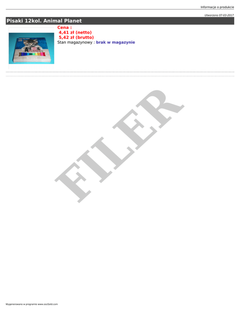 Informacje o produkcie Utworzono 07-03-2017 Pisaki 12kol. Animal Planet Cena : 4,41 zł (netto) 5,42 zł (brutto) FI LE R Stan magazynowy : brak w magazynie Wygenerowano w programie www.oscGold.com