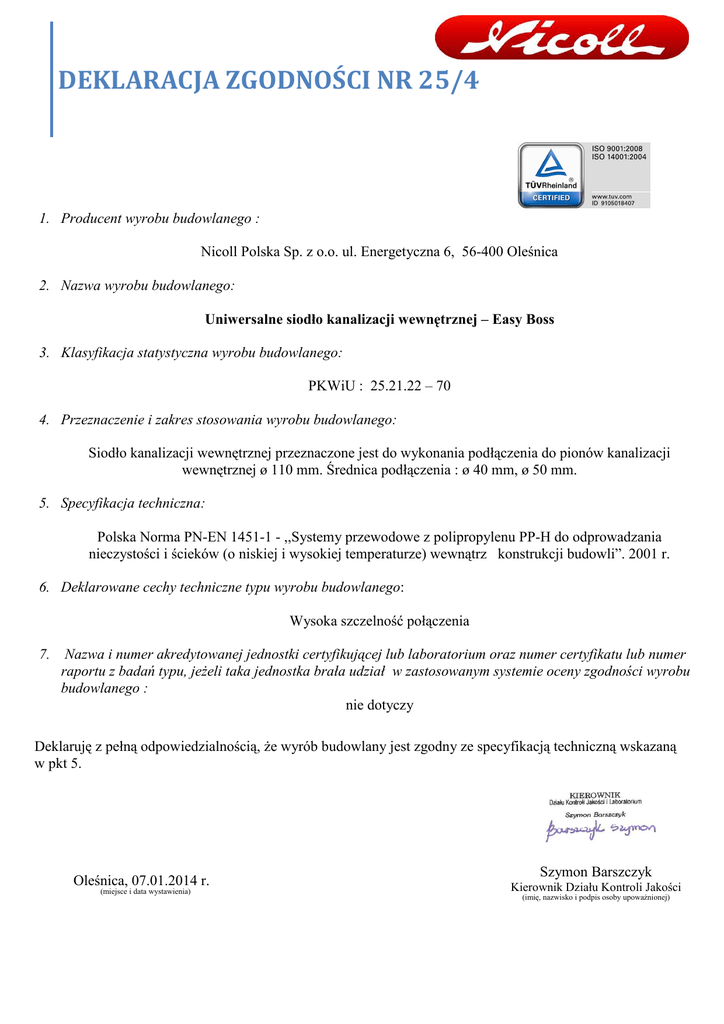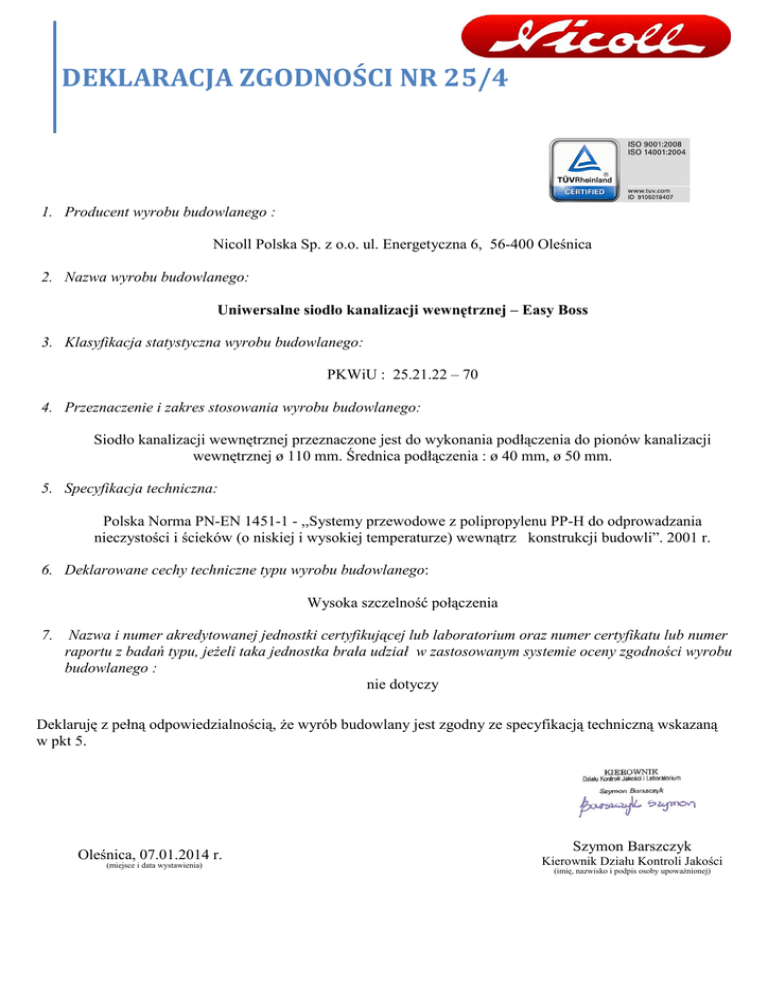 DEKLARACJA ZGODNOŚCI NR 25/4 1. Producent wyrobu budowlanego : Nicoll Polska Sp. z o.o. ul. Energetyczna 6, 56-400 Oleśnica 2. Nazwa wyrobu budowlanego: Uniwersalne siodło kanalizacji wewnętrznej – Easy Boss 3. Klasyfikacja statystyczna wyrobu budowlanego: PKWiU : 25.21.22 – 70 4. Przeznaczenie i zakres stosowania wyrobu budowlanego: Siodło kanalizacji wewnętrznej przeznaczone jest do wykonania podłączenia do pionów kanalizacji wewnętrznej ø 110 mm. Średnica podłączenia : ø 40 mm, ø 50 mm. 5. Specyfikacja techniczna: Polska Norma PN-EN 1451-1 - ,,Systemy przewodowe z polipropylenu PP-H do odprowadzania nieczystości i ścieków (o niskiej i wysokiej temperaturze) wewnątrz konstrukcji budowli”. 2001 r. 6. Deklarowane cechy techniczne typu wyrobu budowlanego: Wysoka szczelność połączenia 7. Nazwa i numer akredytowanej jednostki certyfikującej lub laboratorium oraz numer certyfikatu lub numer raportu z badań typu, jeżeli taka jednostka brała udział w zastosowanym systemie oceny zgodności wyrobu budowlanego : nie dotyczy Deklaruję z pełną odpowiedzialnością, że wyrób budowlany jest zgodny ze specyfikacją techniczną wskazaną w pkt 5. Oleśnica, 07.01.2014 r. (miejsce i data wystawienia) Szymon Barszczyk Kierownik Działu Kontroli Jakości (imię, nazwisko i podpis osoby upoważnionej)