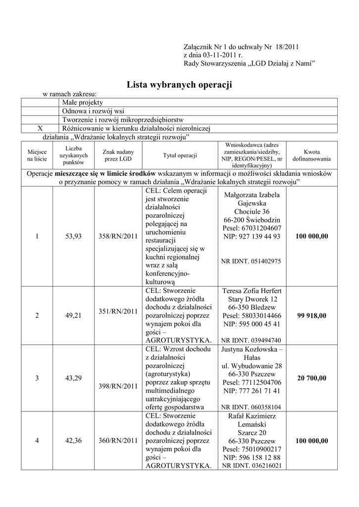 Załącznik Nr 1 do uchwały Nr 18/2011 z dnia 03-11-2011 r. Rady Stowarzyszenia „LGD Działaj z Nami” Lista wybranych operacji w ramach zakresu: Małe projekty Odnowa i rozwój wsi Tworzenie i rozwój mikroprzedsiębiorstw X Różnicowanie w kierunku działalności nierolniczej działania „Wdrażanie lokalnych strategii rozwoju” Miejsce na liście Liczba uzyskanych punktów Znak nadany przez LGD Tytuł operacji Wnioskodawca (adres zamieszkania/siedziby, NIP, REGON/PESEL, nr identyfikacyjny) Kwota dofinansowania Operacje mieszczące się w limicie środków wskazanym w informacji o możliwości składania wniosków o przyznanie pomocy w ramach działania „Wdrażanie lokalnych strategii rozwoju” CEL: Celem operacji Małgorzata Izabela jest stworzenie Gajewska działalności Chociule 36 pozarolniczej 66-200 Świebodzin polegającej na Pesel: 67031204607 uruchomieniu 1 53,93 358/RN/2011 100 000,00 NIP: 927 139 44 93 restauracji specjalizującej się w kuchni regionalnej NR IDNT. 051402975 wraz z salą konferencyjnokulturową CEL: Stworzenie Teresa Zofia Herfert dodatkowego źródła Stary Dworek 12 dochodu z działalności 66-350 Bledzew 351/RN/2011 2 49,21 pozarolniczej poprzez 99 918,00 Pesel: 58033014466 wynajem pokoi dla NIP: 595 000 45 41 gości – AGROTURYSTYKA. NR IDNT. 039494740 CEL: Wzrost dochodu Justyna Kozłowska – z działalności Hałas pozarolniczej ul. Wybudowanie 28 (agroturystyka) 66-330 Pszczew 3 43,29 20 700,00 poprzez zakup sprzętu Pesel: 77112504706 398/RN/2011 multimedialnego NIP: 777 261 71 41 uatrakcyjniającego NR IDNT. 060358104 ofertę gospodarstwa CEL: Stworzenie Rafał Kazimierz dodatkowego źródła Lemański dochodu z działalności Szarcz 20 4 42,36 360/RN/2011 pozarolniczej poprzez 100 000,00 66-330 Pszczew wynajem pokoi dla Pesel: 75010900217 gości – NIP: 596 158 12 88 AGROTURYSTYKA. NR IDNT. 036216021 5 6 7 25,29 17,50 16,21 353/RN/2011 397/RN/2011 414/RN/2011 CEL: Wzrost dochodu z działalności pozarolniczej poprzez rozwinięcie działalności usługowej o zagospodarowanie i utrzymanie terenów zieleni CEL: Wzrost dochodu z działalności pozarolniczej poprzez rozwinięcie działalności usługowej o zagospodarowanie i utrzymanie terenów zieleni CEL: Wzrost dochodu gospodarstwa w wyniku podjęcia pozarolniczej działalności związanej z utrzymanie terenów zielonych. Tomasz Byczkowski Glińsk 28 66-200 Świebodzin Pesel: 76030704872 NIP: 927 167 05 56 86 000,00 NR IDNT. 025148085 Grzegorz Józef Kacprzyk Pałck 40 66-213 Skąpe Pesel: 74052004817 NIP: 927 166 60 17 100 000,00 NR IDNT.024767600 Łukasz Antoni Grabarek Nowa Wieś 53 66-350 Bledzew Pesel: 81061307996 NIP: 596 159 79 93 100 000,00 NR IDNT. 037206534 Operacje nie mieszczące się w limicie środków wskazanym w informacji o możliwości składania wniosków o przyznanie pomocy w ramach działania „Wdrażanie lokalnych strategii rozwoju” - Przewodniczący Andrzej Walach