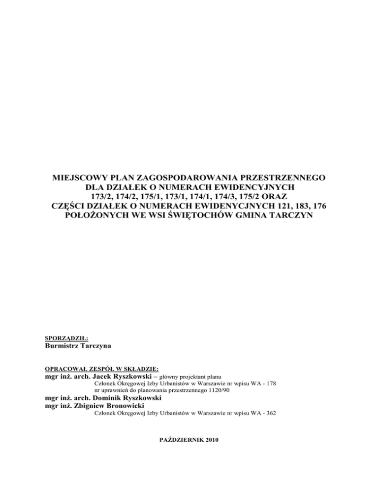 MIEJSCOWY PLAN ZAGOSPODAROWANIA PRZESTRZENNEGO DLA DZIAŁEK O NUMERACH EWIDENCYJNYCH 173/2, 174/2, 175/1, 173/1, 174/1, 174/3, 175/2 ORAZ CZĘŚCI DZIAŁEK O NUMERACH EWIDENYCJNYCH 121, 183, 176 POŁOŻONYCH WE WSI ŚWIĘTOCHÓW GMINA TARCZYN SPORZĄDZIŁ: Burmistrz Tarczyna OPRACOWAŁ ZESPÓŁ W SKŁADZIE: mgr inż. arch. Jacek Ryszkowski – główny projektant planu Członek Okręgowej Izby Urbanistów w Warszawie nr wpisu WA - 178 nr uprawnień do planowania przestrzennego 1120/90 mgr inż. arch. Dominik Ryszkowski mgr inż. Zbigniew Bronowicki Członek Okręgowej Izby Urbanistów w Warszawie nr wpisu WA - 362 PAŹDZIERNIK 2010 UCHWAŁA ...................... RADY MIEJSKIEJ W TARCZYNIE z dnia ................................... w sprawie uchwalenia miejscowego planu zagospodarowania przestrzennego dla działek o numerach ewidencyjnych 173/2, 174/2, 175/1, 173/1, 174/1, 174/3, 175/2 oraz części działek o numerach ewidencyjnych 121, 183, 176 położonych we wsi Świętochów Gmina Tarczyn Na podstawie art. 18 ust. 2 pkt 5 ustawy z dnia 8 marca 1990 roku o samorządzie gminnym (Dz. U z 2001r. Nr 142 poz. 1591 z późn. zm.) oraz na podstawie art. 20 ust. 1 ustawy z dnia 27 marca 2003r. o planowaniu i zagospodarowaniu przestrzennym (Dz.U. z 2003r. Nr 80 poz. 717 z późn. zm.) w związku z Uchwałami Nr XXXIII/182/09 z dnia 12 lutego 2009 r. oraz Nr L/26/10 z dnia 26 marca 2010 r. Rady Miejskiej w Tarczynie o przystąpieniu do sporządzenia miejscowego planu zagospodarowania przestrzennego dla działek o numerach ewidencyjnych 173/2, 174/2, 175/1, 173/1, 174/1, 174/3, 175/2 oraz części działek o numerach ewidencyjnych 121, 183, 176 położonych we wsi Świętochów Gmina Tarczyn, Rada Miejska w Tarczynie stwierdza zgodność niniejszego planu ze Studium Uwarunkowań i Kierunków Zagospodarowania Przestrzennego gminy Tarczyn i uchwala co następuje: §1 Uchwala się miejscowy plan zagospodarowania przestrzennego dla działek o numerach ewidencyjnych 173/2, 174/2, 175/1, 173/1, 174/1, 174/3, 175/2 oraz części działek o numerach ewidencyjnych 121, 183, 176 położonych we wsi Świętochów Gmina Tarczyn. DZIAŁ I. USTALENIA OGÓLNE. Rozdział 1 Zakres obowiązywania planu §2 1. Planem objęto obszar, którego granice przedstawia rysunek planu w skali 1: 1000, stanowiący załącznik nr 1 do niniejszej uchwały i będący jej integralną częścią. 2. Granice obszaru objętego planem: 1) od północnego zachodu wzdłuż osi istniejącej jezdni ulicy Mikołaja Kopernika 2) od północnego wschodu wzdłuż osi istniejącej jezdni ulicy Józefa Piłsudskiego 3) od południa wzdłuż osi istniejącej jezdni ulicy Wiosennej §3 1. Plan zawiera ustalenia dotyczące: 1) przeznaczenia terenów oraz linii rozgraniczających tereny o różnym przeznaczeniu lub różnych zasadach zagospodarowania, 2) zasad ochrony i kształtowania ładu przestrzennego, 3) zasad ochrony środowiska, przyrody i krajobrazu kulturowego, 4) parametrów i wskaźników kształtowania zabudowy oraz zagospodarowania terenu, 1 5) granic i sposobów zagospodarowania terenów lub obiektów podlegających ochronie, na podstawie przepisów odrębnych, 6) szczegółowych zasad i warunków scalania i podziału nieruchomości objętych planem miejscowym, 7) szczególnych warunków zagospodarowania terenów oraz ograniczeń w ich użytkowaniu, 8) zasad przebudowy, rozbudowy i budowy systemu komunikacji oraz infrastruktury technicznej, 9) sposobu i terminu tymczasowego zagospodarowania, urządzania i użytkowania terenów, 10) stawek procentowych, na podstawie których ustala się opłatę, o której mowa w art. 36 ust. 4 ustawy o planowaniu i zagospodarowaniu przestrzennym. 2. Plan nie zawiera ustaleń dotyczących: 1) zasad ochrony dziedzictwa kulturowego i zabytków oraz dóbr kultury współczesnej ze względu na ich brak w granicach planu (gminna ewidencja zabytków będąca podstawowym narzędziem opieki nad zabytkami jest w toku opracowywania), 2) wymagań wynikających z potrzeb kształtowania przestrzeni publicznych, ze względu na brak dla terenu objętego granicami planu ustaleń w tym zakresie w studium uwarunkowań i kierunków zagospodarowania przestrzennego gminy Tarczyn, 3) terenów górniczych, a także terenów narażonych na niebezpieczeństwo powodzi oraz zagrożonych osuwaniami się mas ziemnych, ze względu na brak w granicach planu takich terenów. §4 Integralnymi częściami uchwały są: 1) rysunek planu, stanowiący załącznik nr 1 do niniejszej uchwały, 2) rozstrzygnięcie o sposobie realizacji zapisanych w planie inwestycji z zakresu infrastruktury technicznej, które należą do zadań własnych gminy, oraz zasadach ich finansowania, stanowiące załącznik nr 2 do uchwały. §5 1. Załącznik graficzny nr 1 odnosi ustalenia uchwały do terenu objętego planem. 2. Następujące oznaczenia graficzne na rysunku planu są obowiązującymi ustaleniami planu: 1) granice planu, 2) linie rozgraniczające tereny o różnym przeznaczeniu lub różnych zasadach zagospodarowania, 3) nieprzekraczalne linie zabudowy, 4) przeznaczenie terenów wyrażone symbolami cyfrowymi i literowymi. 3. Wskazuje się na położenie obszaru objętego planem w granicach Warszawskiego Obszaru Chronionego Krajobrazu, wyznaczonego na podstawie przepisów odrębnych. 4. Wskazuje się oznaczoną na rysunku planu symbolem graficznym strefę potencjalnego szkodliwego oddziaływania od linii elektroenergetycznej średniego napięcia 5. Pozostałe oznaczenie graficzne mają charakter informacyjny §6 Ustalenia dla poszczególnych terenów obowiązują łącznie odpowiednio z ustaleniami ogólnymi zawartymi w rozdziale 2 niniejszej uchwały. 2 Rozdział 2 Przepisy ogólne Wyjaśnienie używanych pojęć §7 Ilekroć w uchwale jest mowa o: 1) uchwale – należy przez to rozumieć niniejszą uchwałę Rady Miejskiej w Tarczynie w sprawie miejscowego planu zagospodarowania przestrzennego, 2) przepisach szczególnych i odrębnych – nal