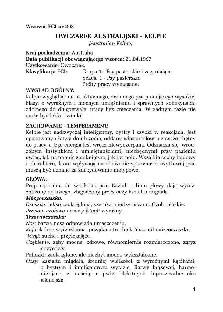 Wzorzec FCI nr 293 OWCZAREK AUSTRALIJSKI - KELPIE (Australian Kelpie) Kraj pochodzenia: Australia Data publikacji obowiązującego wzorca: 21.04.1997 Użytkowanie: Owczarek. Klasyfikacja FCI: Grupa 1 - Psy pasterskie i zaganiające. Sekcja 1 - Psy pasterskie. Próby pracy wymagane. WYGLĄD OGÓLNY: Kelpie wyglądać ma na aktywnego, zwinnego psa pracującego wysokiej klasy, o wyraźnym i mocnym umięśnieniu i sprawnych kończynach, zdolnego do długotrwałej pracy bez zmęczenia. W żadnym razie nie może być lekki i wiotki. ZACHOWANIE - TEMPERAMENT: Kelpie jest nadzwyczaj inteligentny, bystry i szybki w reakcjach. Jest opanowany i łatwy do ułożenia, oddany właścicielowi i zawsze chętny do pracy, a jego energia jest wręcz niewyczerpana. Odznacza się wrodzonym instynktem i umiejętnościami, niezbędnymi przy pasieniu owiec, tak na terenie zamkniętym, jak i w polu. Wszelkie cechy budowy i charakteru, które wpływają na obniżenie sprawności użytkowej psa, muszą być uznane za zdecydowanie nietypowe. GŁOWA: Proporcjonalna do wielkości psa. Kształt i linie głowy dają wyraz, zbliżony do lisiego, złagodzony przez oczy kształtu migdała. Mózgoczaszka: Czaszka: lekko zaokrąglona, szeroka między uszami. Czoło płaskie. Przełom czołowo-nosowy (stop): wyraźny. Trzewioczaszka: Nos: barwa nosa odpowiada umaszczeniu. Kufa: ładnie wyrzeźbiona, pożądana trochę krótsza od mózgoczaszki. Wargi: suche i przylegające. Uzębienie: zęby mocne, zdrowe, równomiernie rozmieszczone, zgryz nożycowy. Policzki: zaokrąglone, ale niezbyt mocno wykształcone. Oczy: kształtu migdała, średniej wielkości, z wyraźnymi kącikami, o bystrym i inteligentnym wyrazie. Barwy brązowej, harmonizującej z maścią; u psów błękitnych dopuszczalne oko jaśniejsze. 1 Uszy: średniej wielkości, stojące, zaostrzone na końcach, cienkie, mocne przy podstawie, trochę zaokrąglone na zewnętrznych krawędziach, osadzone szeroko na bokach czaszki i skierowane na boki. Wnętrze ucha porośnięte gęstym włosem. SZYJA: Średniej długości, mocna, trochę łukowato wygięta, płynnie przechodząca w łopatki, bez podgardla, z niewielką grzywą. TUŁÓW: Stosunek długości tułowia, od najbardziej ku przodowi wysuniętego punktu mostka do guza siedzeniowego, do wysokości w kłębie wynosi 10 do 9. Grzebiet: mocny, prosty. Lędźwie: mocne i dobrze umięśnione. Zad: dość długi i opadający. Klatka piersiowa: raczej głęboka niż szeroka. Żebra: dobrze wysklepione. Słabizny: głębokie. OGON: W spoczynku zwisający i lekko wygięty. W ruchu i przy pobudzeniu może być wzniesiony, ale w żadnym razie nie zakręcony tak, by jego koniec znalazł się poza pionową linią, przechodzącą przez nasadę. Na ogonie wyraźna szczotka. Osadzony nisko, stanowi przedłużenie opadającej linii zadu i sięga mniej więcej do stawu skokowego. KOŃCZYNY: Kończyny przednie: dobrze umięśnione, o mocnym, ale nie ciężkim kośćcu, oglądane od przodu proste i równoległe wobec siebie. Łopatki: umięśnione, skośnie ustawione, szczyty łopatek blisko siebie ustawione. Ramiona: tworzą z łopatkami kąt prosty. Łokcie: nie wykręcone na zewnątrz ani do wewnątrz. Śródręcza: oglądane z boku trochę nachylone w stosunku do podłoża, co zapewnia sprężystość ruchu i pozwala na nagłe zwroty. Kończyny tylne: mocne, dobrze umięśnione. Oglądane z tyłu są proste i równoległe wobec siebie, ustawione niezbyt szeroko, ale i nie blisko siebie. Stawy kolanowe: dobrze kątowane. Stawy skokowe: dość nisko umiejscowione. Łapy: okrągłe, mocne, o mocnych opuszkach, place zwarte i wysklepione, pazury krótkie i mocne. 2 CHODY: Aby kelpie mógł bez zmęczenia wykonywać swą pracę, zwłaszcza na otwartych terenach, musi być on bezbłędnie zbudowany. Wszystkie wady, które upośledzają ruch i sprawność psa, jak krowia, czy beczkowata postawa kończyn tylnych, luźne łopatki, słabe kątowanie, krzyżowanie i wysokie podnoszenie łap, muszą być surowo oceniane. Ruch powinien być sprawny, bez wysiłku, a pies musi być zdolny do nagłych zwrotów w ruchu. W kłusie, gdy rośnie prędkość, łapy poruszają się trochę zbieżnie, ale w postawie rozstawione są szeroko. OKRYWA WŁOSOWA: Sierść: dwuwarstwowa, z podszerstkiem. Włos okrywowy prosty, zwarty, przylegający i twardy, nieprzemakalny. Na spodzie tułowia sierść trochę dłuższa, na udach tworzy niewielkie portki. Na głowie, zewnętrznej stronie uszu, przedniej stronie kończyn i łapach krótka, na szyi dłuższa i bardziej gęsta, tworzy grzywę, a na ogonie - szczotkę. Sierść zbyt długa lub zbyt krótka jest wadliwa. Prawidłowa długość sierści na tułowiu to 2-3 cm. Umaszczenie: czarne, czarne podpalane, czerwone, czerwone podpalane, płowe, czekoladowe i błękitne. WZROST: Wysokość w kłębie: 46 do 51 cm dla psa, 43 do 48 cm dla suki. WADY: Wszystkie odstępstwa od tego, co podano powyżej, powinny być traktowane jako wady, powodujące odpowiednie obniżenie oceny. UWAGA: Samce muszą mieć dwa, prawidłowo wykształcone jądra, całkowicie umieszczone w worku mosznowym. 3