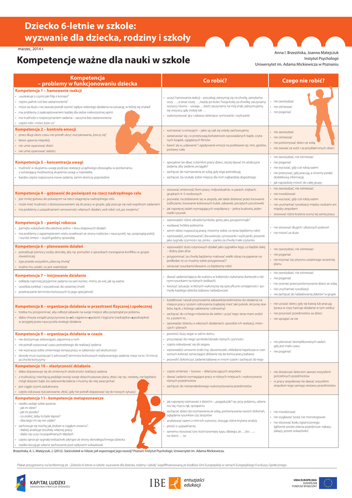 marzec, 2014 r. Anna I. Brzezińska, Joanna Matejczuk Instytut Psychologii Uniwersytet im. Adama Mickiewicza w Poznaniu Kompetencje ważne dla nauki w szkole Kompetencja – problemy w funkcjonowaniu dziecka Co robić? Czego nie robić? Kompetencja 1 – hamowanie reakcji • „wyskakuje z czymś jak Filip z konopii” • często „palnie coś bez zastanowienia” • mówi za dużo i nie zawsze potrafi ocenić wpływ własnego działania na sytuację, w której się znalazł • ma problemy z zaakceptowaniem każdej dla siebie niekorzystnej opinii • ma trudności z rozpoczynaniem zadania – zaczyna bez zastanowienia • uczyć hamowania reakcji – poczekaj; zatrzymaj się na chwilę; zamykamy oczy …; a teraz ciszej …; każdy po kolei; Twoja kolej za chwilkę; zaczynamy wszyscy równo – uwaga… start!; zaczynamy na mój znak; zatrzymujemy się wszyscy, gdy zrobię tak … • wykorzystywać gry i zabawy dziecięce, rymowanki i wyliczanki • nie zawstydzać • nie ośmieszać • nie poganiać • często robi i mówi „byle co” Kompetencja 2 – kontrola emocji • przez długi okres czasu nie potrafi ukryć rozczarowania, „boczy się” • łatwo ujawnia niepokój • nie umie opanować złości • nie umie opanować radości • rozmawiać o emocjach – jakie są i jak się wtedy zachowujemy • nie zawstydzać • zastanawiać się, co przeżywają bohaterowie opowiadanych bajek, czytanych książek, oglądanych filmów • nie ośmieszać • bawić się w „udawanie” i zgadywanie emocji na podstawie np. min, gestów, postawy ciała • nie stawiać za wzór i za przykład innych dzieci • nie porównywać dzieci ze sobą • nie zawstydzać, nie ośmieszać Kompetencja 3 – koncentracja uwagi • trudność w skupieniu uwagi podczas realizacji uciążliwego obowiązku w porównaniu z wzrastającą możliwością skupienia uwagi u nastolatka • bardzo często rozpoczyna nowe zadania, zanim skończy poprzednie • specjalnie nie dbać o komfort pracy dzieci, raczej dawać im atrakcyjne zadania, aby zadanie „wciągało” • nie poganiać • zachęcać do rozmawiania ze sobą, gdy tego potrzebują • nie przerywać, gdy pracują, a chcemy podać dodatkową informację • zachęcać, by szukały sobie miejsca dla nich najbardziej dogodnego • nie wyciszać, gdy coś robią razem • jak najrzadziej mówić do całej grupy Kompetencja 4 – gotowość do poświęceń na rzecz nadrzędnego celu • stosować zmienność form pracy: indywidualnie, w parach, trójkach, grupkach 4–5-osobowych • jest mniej gotowy do poświęceń na rzecz osiągnięcia nadrzędnego celu • pozwalać na dobieranie się w zespoły, ale także dobierać przez losowanie (odliczanie, losowanie kolorowych kulek, zabawek, pociętych pocztówek) • może mieć trudności z dostosowywaniem się do pracy w grupie, gdy pracuje się nad wspólnym zadaniem • jak najwięcej zadań wymagających współpracy – jedna budowla, jeden • ma problemy z uzasadnianiem sensowności własnych działań, woli robić coś „po swojemu” wielki rysunek Kompetencja 5 – pamięć robocza • pamięta wskazówki dla zaledwie jedno- i dwu-etapowych działań • ma problemy z zapamiętaniem wielu oczekiwań ze strony rodziców i nauczycieli, np.: posprzątaj pokój i wynieś śmieci – za pół godziny sprawdzę Kompetencja 6 – planowanie działań • potrzebuje pomocy osoby dorosłej, aby np. pomyśleć o sposobach rozwiązania konfliktu w grupie rówieśniczej • nie moralizować • nie wyciszać, gdy coś robią razem • nie uruchamiać rywalizacji między osobami ani między zespołami • stosować różne kryteria oceny tej samej pracy • wprowadzić różne obrazki/symbole, gesty jako „przypominajki” • wydawać krótkie polecenia • zanim dzieci rozpoczną pracę, mówimy sobie, co teraz będziemy robić • wprowadzić „rytmizowanie”, dwuwiersze, rymowanki i wyliczanki, piosenki jako sygnały czynności np. pinko – panko za chwilę małe czytanko • wprowadzić dużo rutynowych działań jako sygnałów tego, co będzie dalej – dobry plan dnia • żyje przede wszystkim „obecną chwilą” • przypominać: za chwilę będziemy malować wielki obraz na papierze na podłodze, to co musimy sobie przygotować? • trudno mu ustalić, co jest ważniejsze • oznaczać rysunkami/słowami, co będziemy robić Kompetencja 7 – inicjowanie działania • nie zawstydzać, nie ośmieszać • nie stosować długich i złożonych poleceń • nie mówić za dużo • nie zawstydzać, nie ośmieszać • nie poganiać • nie trzymać się sztywno ustalonego wcześniej planu • nie zawstydzać, nie ośmieszać • dawać zadania/zajęcia do wyboru w kolejności wykonania (karteczki z różnymi rysunkami na różnych stolikach) • nie poganiać • przekraczanie terminów końcowych to jego specjalność • tworzyć sytuacje, w których wykorzysta się specyficzne umiejętności i pomysły każdego dziecka (zabawy naśladowcze) • nie uruchamiać rywalizacji Kompetencja 8 – organizacja działania w przestrzeni fizycznej i społecznej • kształtować nawyk przynoszenia zabawek/przedmiotów do działania na miejsce pracy i potem odnoszenia (najlepiej mieć taki pokoik, skrzynię skarbów, kącik, z którego zabieramy i odnosimy) • odkłada najmniej przyjemne zadania na sam koniec, mimo, że wie, jak są ważne • uwielbia zwlekać i wyczekiwać do ostatniej chwili • trzeba mu przypominać, aby odłożył zabawki na swoje miejsce albo posprzątał po jedzeniu • słabo chwyta związki przyczynowe (agb; najpierwgpotem) i logiczne (nadrzędnegpodrzędne) w przyjętej przez nauczyciela strategii działania • nie oceniać przez porównywanie dzieci ze sobą • nie zachęcać do naśladowania „liderów” w grupie • zachęcać do cichego mówienia do siebie i uczyć tego: teraz mam zrobić to, a potem to … • nie uciszać dzieci, gdy się bawią lub pra