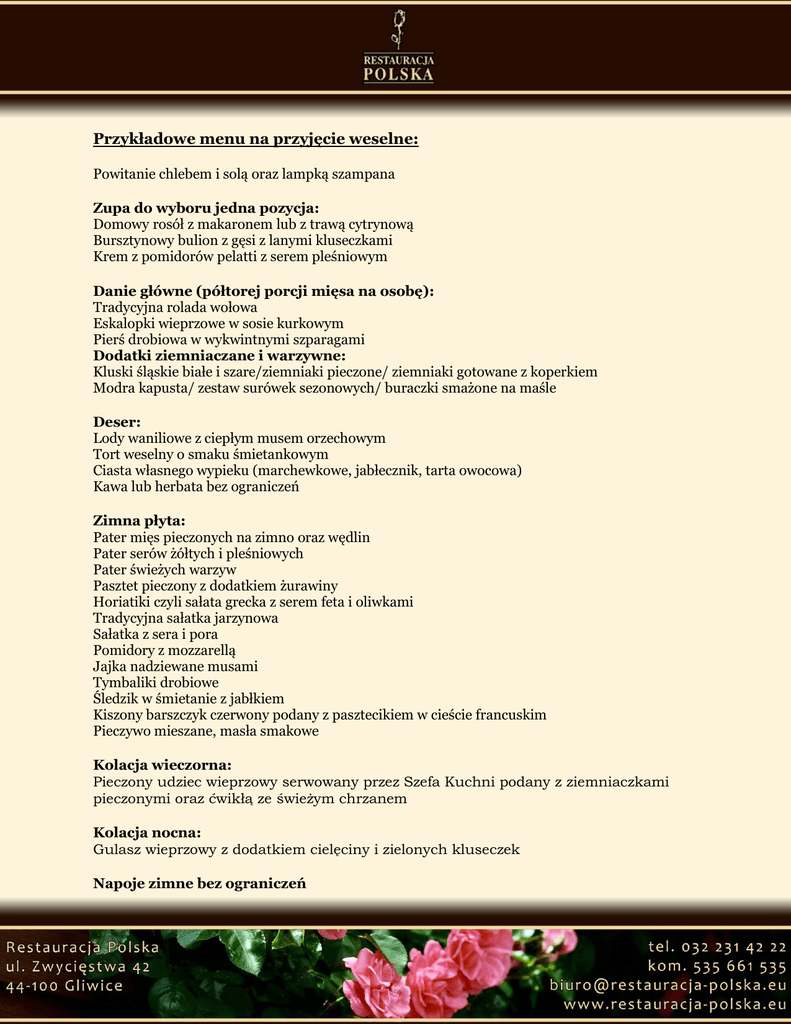 Przykładowe menu na przyjęcie weselne: Powitanie chlebem i solą oraz lampką szampana Zupa do wyboru jedna pozycja: Domowy rosół z makaronem lub z trawą cytrynową Bursztynowy bulion z gęsi z lanymi kluseczkami Krem z pomidorów pelatti z serem pleśniowym Danie główne (półtorej porcji mięsa na osobę): Tradycyjna rolada wołowa Eskalopki wieprzowe w sosie kurkowym Pierś drobiowa w wykwintnymi szparagami Dodatki ziemniaczane i warzywne: Kluski śląskie białe i szare/ziemniaki pieczone/ ziemniaki gotowane z koperkiem Modra kapusta/ zestaw surówek sezonowych/ buraczki smażone na maśle Deser: Lody waniliowe z ciepłym musem orzechowym Tort weselny o smaku śmietankowym Ciasta własnego wypieku (marchewkowe, jabłecznik, tarta owocowa) Kawa lub herbata bez ograniczeń Zimna płyta: Pater mięs pieczonych na zimno oraz wędlin Pater serów żółtych i pleśniowych Pater świeżych warzyw Pasztet pieczony z dodatkiem żurawiny Horiatiki czyli sałata grecka z serem feta i oliwkami Tradycyjna sałatka jarzynowa Sałatka z sera i pora Pomidory z mozzarellą Jajka nadziewane musami Tymbaliki drobiowe Śledzik w śmietanie z jabłkiem Kiszony barszczyk czerwony podany z pasztecikiem w cieście francuskim Pieczywo mieszane, masła smakowe Kolacja wieczorna: Pieczony udziec wieprzowy serwowany przez Szefa Kuchni podany z ziemniaczkami pieczonymi oraz ćwikłą ze świeżym chrzanem Kolacja nocna: Gulasz wieprzowy z dodatkiem cielęciny i zielonych kluseczek Napoje zimne bez ograniczeń Cena menu wynosi 190 zł/osobę. Powyższa cena zawiera: - wynajem sal weselnych bez ograniczenia czasowego - dekorację stołów w świeże kwiaty - obsługę kelnerską - możliwość własnego alkoholu, napoi zimnych oraz ciast i tortów bez dodatkowych opłat - możliwość noclegu dla gości (przykładowa cena- pokój 2-osobowy 120 zł)