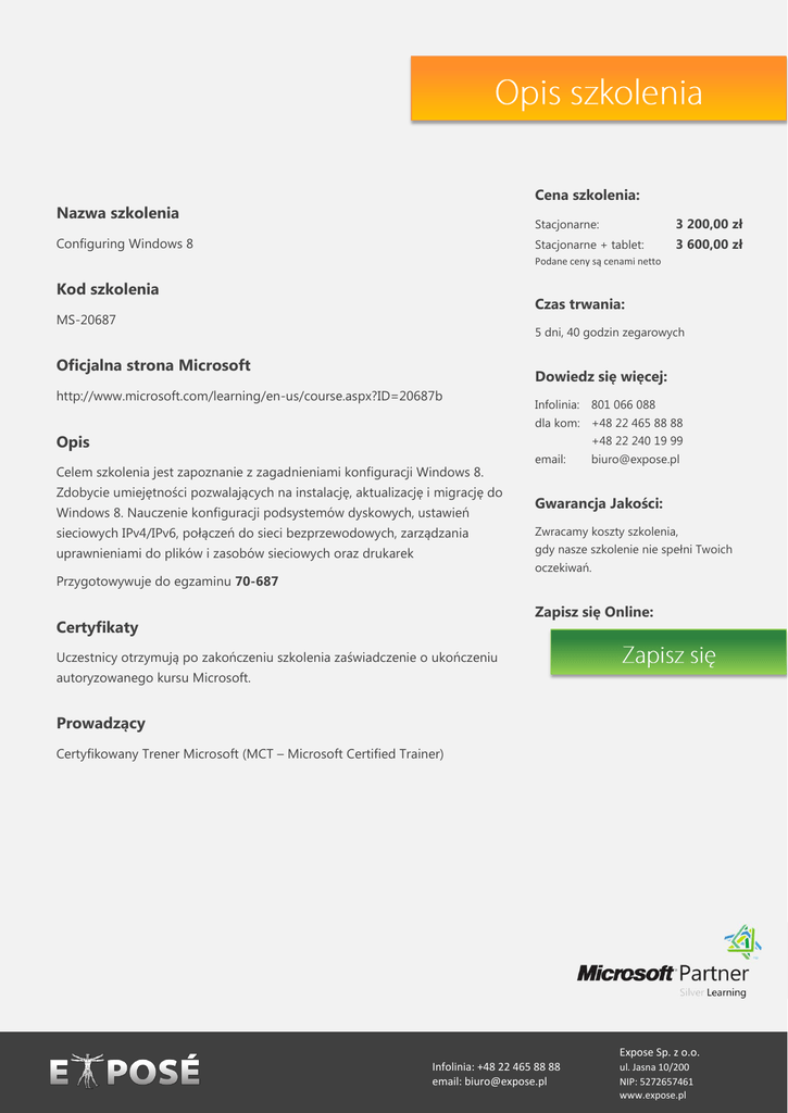 Cena szkolenia: Nazwa szkolenia Configuring Windows 8 Stacjonarne: 3 200,00 zł Stacjonarne + tablet: 3 600,00 zł Podane ceny są cenami netto Kod szkolenia Czas trwania: MS-20687 5 dni, 40 godzin zegarowych Oficjalna strona Microsoft Dowiedz się więcej: http://www.microsoft.com/learning/en-us/course.aspx?ID=20687b Infolinia: 801 066 088 dla kom: +48 22 465 88 88 Opis +48 22 240 19 99 Celem szkolenia jest zapoznanie z zagadnieniami konfiguracji Windows 8. Zdobycie umiejętności pozwalających na instalację, aktualizację i migrację do Windows 8. Nauczenie konfiguracji podsystemów dyskowych, ustawień email: [email protected] Gwarancja Jakości: sieciowych IPv4/IPv6, połączeń do sieci bezprzewodowych, zarządzania Zwracamy koszty szkolenia, uprawnieniami do plików i zasobów sieciowych oraz drukarek gdy nasze szkolenie nie spełni Twoich oczekiwań. Przygotowywuje do egzaminu 70-687 Zapisz się Online: Certyfikaty Uczestnicy otrzymują po zakończeniu szkolenia zaświadczenie o ukończeniu autoryzowanego kursu Microsoft. Prowadzący Certyfikowany Trener Microsoft (MCT – Microsoft Certified Trainer) Expose Sp. z o.o. Infolinia: +48 22 465 88 88 email: [email protected] ul. Jasna 10/200 NIP: 5272657461 www.expose.pl 1. 2. 3. 4. 5. 6. 7. 8. 9. Instalacja Windows 8 wprowadzenie do Windows 8 przygotowanie do instalacji Windows 8 instalacja Windows 8 automatyzacja instalacji Windows 8 aktywacja Windows 8 Aktualizacja i migracja do Windows 8 aktualizacja do Windows 8 migracja do Windows 8 migracja ustawień i danych użytkownika Zarządzanie dyskami i sterownikami urządzeń zarządzanie dyskami, partycjami i woluminami utrzymanie dysków, partycji i woluminów praca z dyskami wirtualnymi VHD instalacja i konfiguracja sterowników urządzeń Konfiguracja i rozwiązywanie problemów z połączeniami sieciowymi konfiguracja połączeń IPv4 konfiguracja połączeń IPv6 implementacja adresacji autokonfiguracji implementacja rozpoznawania nazw rozwiązywanie problemów z połączeniami sieciowymi Implementacja połączeń sieci bezprzewodowych wprowadzenie do sieci bezprzewodowych implementacja połączeń do sieci bezprzewodowych Implementacja zabezpieczeń sieciowych omówienie zagrożeń sieciowych konfiguracja Windows Firewall zabezpieczanie ruchu sieciowego konfiguracja Windows Defender Konfiguracja dostępu do plików i drukarek na komputerach z Windows 8 zarządzanie dostępem do plików zarządzanie folderami sieciowymi konfiguracja kompresji plików zarządzanie drukarkami omówienie SkyDrive Zabezpieczanie stacji roboczych Windows 8 uwierzytelnianie i autoryzacja w Windows 8 implementacja obiektów zasad grupowych ochrona danych za pomocą EFS i BitLocker konfiguracja User Account Control Konfiguracja aplikacji instalacja i konfiguracja aplikacji zarządzanie aplikacjami z Windows Store Expose Sp. z o.o. Infolinia: +48 22 465 88 88 email: [email protected] ul. Jasna 10/200 NIP: 5272657461 www.expose.pl 10. 11. 12. 13. 14. konfiguracja ustawień Internet Explorer konfiguracja ograniczeń dostępu do aplikacji w przedsiębiorstwie Optymalizacja i utrzymanie komputerów z Windows 8 optymalizacja pod kątem wydajności zarządzanie dostępnością Windows 8 zarządzanie aktualizacjami w Windows 8 Konfiguracja komputerów przenośnych i dostęp zdalny konfiguracja komputerów przenośnych i ustawienia urządzeń konfiguracja dostępu VPN konfiguracja dostępu zdalnego oraz pomocy zdalnej omówienie DirectAccess Implementacja Hyper-V omówienie Hyper-V tworzenie maszyn wirtualnych zarządzanie dyskami wirtualnymi VHD zarządzanie migawkami Rozwiązywanie problemów i odtwarzanie Windows 8 tworzenie kopii zapasowych oraz odtwarzanie plików w Windows 8 opcje odtwarzania w Windows 8 Wykorzystanie Windows PowerShell wprowadzenie do WindowsPowerShell 3.0 zdalne praca w Windows PowerShell wykorzystanie Windows PowerShell Cmdlets Expose Sp. z o.o. Infolinia: +48 22 465 88 88 email: [email protected] ul. Jasna 10/200 NIP: 5272657461 www.expose.pl