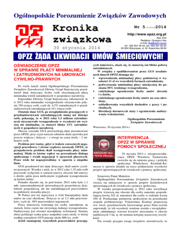 Ogólnopolskie Porozumienie Związków Zawodowych Kronika związkowa 30 stycznia 2014 Nr 5(2394)/2014 http://www.opzz.org.pl Rok XVII Redaktor: Grzegorz Ilka e-mail: [email protected] tel.: 022 551 55 04, fax: 022 551 55 24 00-924 Warszawa, ul. M. Kopernika 36/40 OPZZ ŻĄDA LIKWIDACJI UMÓW ŚMIECIOWYCH! OŚWIADCZENIE OPZZ W SPRAWIE PŁACY MINIMALNEJ I ZATRUDNIONYCH NA UMOWACH CYWILNO-PRAWNYCH Po wielu latach starań Ogólnopolskiego Porozumienia Związków Zawodowych Główny Urząd Statystyczny przedstawił dane dotyczące liczby osób otrzymujących płacę minimalną wśród zatrudnionych w gospodarce narodowej. Poprzednio Główny Urząd Statystyczny informował, że w 2012 roku minimalne wynagrodzenie otrzymywało jedynie 358 tysięcy osób, czyli ok. 4,3% zatrudnionych w przedsiębiorstwach zatrudniających 10 i więcej osób. Ostatnie dane GUS, po uwzględnieniu pracujących w przedsiębiorstwach zatrudniających mniej niż dziesięć osób, pokazują, że w 2012 roku 1,3 miliona zatrudnionych otrzymywało wynagrodzenie w wysokości nie wyższej niż minimalne, co stanowi blisko 13% zatrudnionych w gospodarce narodowej. Obecne szacunki GUS potwierdzają dane prezentowane przez OPZZ, przy czym naszym zdaniem skala zjawiska jest jeszcze większa i dotyczy – z uwagi na szarą strefę – 2 milionów osób. Problem jest ważny, gdyż w trakcie corocznych negocjacji pracodawcy i strona rządowa zarzucały OPZZ, że przejaskrawia problem skali występowania płacy minimalnej. Miało to istotny wpływ na prowadzenie dialogu społecznego i wynik negocjacji w sprawach płacowych. Przez wiele lat negocjowaliśmy w oparciu o niepełne dane. GUS przedstawił też dane dotyczące skali umów cywilno-prawnych. Wynika z nich, że w 2012 roku 1,35 mln osób pracowało wyłącznie w ramach umowy zlecenie lub umowy o dzieło, gdzie poza nielicznymi wyjątkami wynagrodzenia są bardzo niskie. Ponadto okazało się, że pod koniec 2012 roku było 1,1 mln samozatrudnionych (prowadzących pozarolniczą działalność gospodarczą, ale nie zatrudniających pracowników na podstawie stosunku pracy). W Polsce jest też najwyższa w Unii Europejskiej skala umów na czas określony. Dotyczy to aż 3,3 mln pracowników, czyli ok. 30% pracowników najemnych. Pracę śmieciową wykonują też osoby zatrudnione na stażach, które często nie otrzymują żadnego wynagrodzenia. Nadużywany jest również nieodpłatny wolontariat. Smutny obraz polskiego rynku pracy uzupełnia szara strefa, w której według szacunków GUS pracuje około 800 tys. osób. Jeżeli zsumujemy wszystkich pracowników pracują- cych śmieciowo, okaże się, że stanowią oni blisko połowę zatrudnionych. W związku z opublikowaniem przez GUS urealnionych danych OPZZ domaga się: • wprowadzenia minimalnej płacy godzinowej w wysokości 11 zł we wszystkich formach zatrudnienia, • podwyższenia minimalnej płacy miesięcznej do poziomu 50% średniego wynagrodzenia, • radykalnego ograniczenia liczby umów zlecenia i o dzieło, • radykalnego ograniczenia liczby umów na czas określony, • oskładkowania wszystkich dochodów z pracy i pochodnych, • likwidacji darmowych staży i ograniczenia nadużywania wolontariatu. Ogólnopolskie Porozumienie Związków Zawodowych Warszawa, 30 stycznia 2014 r. ________________________________________________ INTERWENCJA OPZZ W SPRAWIE POMOCY SPOŁECZNEJ 29 stycznia 2014 r. wiceprzewodnicząca OPZZ Wiesława Taranowska zwróciła się do ministra pracy i polityki społecznej Władysława Kosiniak-Kamysza w sprawie działań na rzecz podniesienia wysokości progów uprawniających do świadczeń z pomocy społecznej: Szanowny Panie Ministrze Ogólnopolskie Porozumienie Związków Zawodowych zwraca się niniejszym w sprawie progów dochodowych uprawniających do świadczeń z pomocy społecznej. W wyniku przeprowadzonej w 2012 roku weryfikacji progów wynoszą one obecnie dla osoby samotnie gospodarującej kwotę 542 zł, natomiast dla osoby w rodzinie kwotę 456 zł. Przekazując partnerom społecznym na posiedzeniu zespołu problemowego Trójstronnej Komisji propozycję ww. kwot, przedstawiciele kierowanego przez Pana resortu zapewniali, że ich wysokość ustalona została z uwzględnieniem zakładanego wzrostu kosztów utrzymania w okresie najbliższych 3 lat, tj. do terminu kolejnej ustawowej weryfikacji. Nie zostały przyjęte uwagi związków zawodowych, że Kronika związkowa nr 5(2394)/2014 – strona 2 wysokość progów została ustalona na zbyt niskim poziomie, niższym dla osoby samotnie gospodarującej od wynikającej z uchwały Trójstronnej Komisji do Spraw Społeczno-Gospodarczych z dnia 24 czerwca 2010 r. w sprawie weryfikacji kwot kryteriów dochodowych od 1 października 2010 r. Jak wynika z badań Instytutu Pracy i Spraw Socjalnych w sprawie wysokości minimum egzystencji, już w roku 2012 wysokość progu dochodowego dla niektórych typów rodzin kształtowała się na pograniczu a nawet poniżej minimum biologicznego. Sytuacja tych rodzin uległa pogorszeniu w ubiegłym roku z uwagi na wzrost wysokości minimum we wszystkich typach rodzin. Oznacza to, że coraz większa liczba osób w rodzinach, szczególnie wielodzietnych, mających dochody poniżej minimum egzystencji nie ma dostępu do świadczeń z pomocy społecznej. W świetle powyższych faktów zwracam się do Pana Ministra o podjęcie działań na rzecz podniesienia wysokości progów uprawniających do świadczeń z pomocy społecznej oraz decyzji w sprawie udzielania przez ośrodki pomocy społecznej obligatoryjnej pomocy tym rodzinom, których dochody znajdują się w przedziale między progiem dochodowym a minimum egzystencji. Z poważaniem Wiesława Taranowska ________________________________________________ KONFERENCJA IGM I KZZM WE WROCŁAWIU 24 stycznia 2014 r. we Wrocławiu odbyła się konferencja poświęcona rozwojowi przemysłu w Niemczech i Polski oraz ocenie wsparcia udzielanego przez rządy tych 