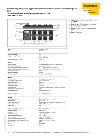 hub I/O do podłączania sygnałów cyfrowych do urządzenia nadrzędnego IOLink 16 uniwersalnych kanałów dwustanowych PNP TBIL-M1-16DXP ■ Wytrzymały, w pełni uszczelniony hub I/ O w IP67 ■ Diagnostyka IO-Link przerwy w obwodzie i napięcia zasilania ■ 2 uniwersalne kanały dwustanowe na port Edition • 2016-11-09T22:01:26+01:00 ■ Złącze metalowe Typ Nr kat. TBIL-M1-16DXP 6814102 Liczba kanałów Napięcie pracy / obciążenia Standardowa strata mocy 16 maks. prąd 4 A na moduł 20,4…28,8 VDC ð 3,2 W Wejścia Liczba kanałów Type of input diagnostics Sygnał napięciowy niskiego poziomu Sygnał napięciowy wysokiego poziomu Opóźnienie wejścia Maks. prąd wejścia Izolacja elektryczna 16 wejść dwustanowych PNP (EN 61131-2) group diagnostics -3…5 VDC (EN 61131-2, typ 1 i 3) 11…30 VDC (EN 61131-2, typ 1 i 3) 0,010 ms 15 mA Wejścia do FE 500VDC Wyjścia Liczba kanałów Type of output diagnostics Napięcie wyjścia Prąd wyjściowy na kanał Opóźnienie wyjścia Typ obciążenia Współczynnik równoczesności Izolacja elektryczna 16 wyjść dwustanowych PNP group diagnostics 24 VDC 0,5 A, ochrona przed zwarciem 0.15 ms obciążenie rezystancyjne, indukcyjne, lampowe 0,35 wyjście FE 500 VDC Zasilanie czujników maks. 120 mA na port IO-Link Specyfikacja IO-Link Programming Transmission physics Transmission rate Frame type Specyfikacja zgodna z wersją 1.1 FDT/DTM Odpowiednio dla przewodu 3-żyłowego (PHY2) COM 2 / 38,4 kbps 2,6 Dimensions (W x L x H) materiał obudowy Montaż Temperatura pracy Temperatura składowania Test wibracyjny Test przeciążeniowy/wstrząsowy Kompatybilność elektromagnetyczna Klasa ochrony MTTF Certyfikaty 54 x 150 x 27.4mm PA6-GF30 4 otwory montażowe � 4,3 mm -40 … + 70 °C -40 … + 85 °C zgodnie z EN 60068-2-6 zgodnie z EN 60068-2-27 zgodnie z EN 61131-2:22007 IP67 96 rok/lata CE 1/4 Hans Turck GmbH & Co.KG ñ D-45472 Mülheim an der Ruhr ñ Witzlebenstraße 7 ñ Tel. 0208 4952-0 ñ Fax 0208 4952-264 ñ [email protected] ñ www.turck.com hub I/O do podłączania sygnałów cyfrowych do urządzenia nadrzędnego IOLink 16 uniwersalnych kanałów dwustanowych PNP TBIL-M1-16DXP Pin configuration and wiring diagrams Uwaga Łącze IO Link M12 x 1 Odpowiedni przewód IO-Link na przykład: 2 m: RKC4T-2-RSC4T/TXL (nr katalogowy 6625604) 5 m: RKC4T-5-RSC4T/TXL (nr katalogowy 6625730) Inne długości przewodów można znaleźć w katalogu. Możliwe są również wykonania na zamówienie. Odpowiedni Master IO-Link na przykład: BL20-E-4IOL (nr katalogowy 6827385) BL67-4IOL (nr katalogowy 6827386) TBEN-S2-4IOL (nr katalogowy 6814024) SDPX-IOL4-0001 (nr kat. 6825480) Inne urządzenia można znaleźć w katalogu. Możliwe są również wykonania na zamówienie. Uwaga Złącze I/O M12 x 1 Dedykowane przewody zasilające czujnika (np.): 2 m: RSC4.4T-2/TXL (nr kat. 6625527) 5 m: RSC4.4T-5/TXL (nr kat. 6625528) Inne długości przewodów można znaleźć w katalogu. Możliwe są również wykonania na zamówienie. Opcjonalne akcesoria Zatyczka VZ3 M12 numer kat. (8000004) Edition • 2016-11-09T22:01:26+01:00 Etykiety KS9/20 numer kat. (8015002) 2/4 Hans Turck GmbH & Co.KG ñ D-45472 Mülheim an der Ruhr ñ Witzlebenstraße 7 ñ Tel. 0208 4952-0 ñ Fax 0208 4952-264 ñ [email protected] ñ www.turck.com hub I/O do podłączania sygnałów cyfrowych do urządzenia nadrzędnego IOLink 16 uniwersalnych kanałów dwustanowych PNP TBIL-M1-16DXP Diody LED stanu modułu LED Kolor Stan Opis IO-Link Zielony wył. Zasilanie wyłączone Miganie Komunikacja IO-Link OK, wysłane lub odebrane poprawne dane procesowe Czerwony zał. Miganie Komunikacja IO-Link lub błąd modułu Komunikacja IO-Link OK, niewłaściwe dane procesowe lub włączona diagnostyka Diody LED stanu wejść/wyjść LED Kolor Stan Opis C1 A / B … C8 A / B Zielony zał. Wejście lub wyjście aktywne Czerwony zał. Wyjście aktywne przy zwarciu/przeciążeniu Miganie Przeciążenie mocy danego portu. Oba LED danego portu migają. wył. Wejście lub wyjście nieaktywne Edition • 2016-11-09T22:01:26+01:00 C … = numer gniazda, A / B = dioda LED sygnału (sygnał A = pin 4, sygnał B = pin 2) 3/4 Hans Turck GmbH & Co.KG ñ D-45472 Mülheim an der Ruhr ñ Witzlebenstraße 7 ñ Tel. 0208 4952-0 ñ Fax 0208 4952-264 ñ [email protected] ñ www.turck.com hub I/O do podłączania sygnałów cyfrowych do urządzenia nadrzędnego IOLink 16 uniwersalnych kanałów dwustanowych PNP TBIL-M1-16DXP Dane procesowe Bajt Bit 7 Bit 6 Bit 5 Bit 4 Bit 3 Bit 2 Bit 1 DI8 DI7 DI6 DI5 DI4 DI3 DI2 DI1 C4P2 (B) C4P4 (A) C3P2 (B) C3P4 (A) C2P2 (B) C2P4 (A) C1P2 (B) C1P4 (A) MSB Wejścia 0 1 Wyjścia LSB DI16 DI15 DI14 DI13 DI12 DI11 DI10 DI9 C8P2 (B) C8P4 (A) C7P2 (B) C7P4 (A) C6P2 (B) C6P4 (A) C5P2 (B) C5P4 (A) 0 DO8 DO7 DO6 DO5 DO4 DO3 DO2 DO1 C4P2 (B) C4P4 (A) C3P2 (B) C3P4 (A) C2P2 (B) C2P4 (A) C1P2 (B) C1P4 (A) 1 DO16 DO15 DO14 DO13 DO12 DO11 DO10 DO9 C8P2 (B) C8P4 (A) C7P2 (B) C7P4 (A) C6P2 (B) C6P4 (A) C5P2 (B) C5P4 (A) C… = nr gniazda, P… = nr pinu Diagnostyka / Zdarzenia Klasa / Kwalifikator Tryb Typ Przykład Kod Opis 0xC0 0x30 0x04 0xF4 appears 0x5110 Za wysokie napięcie zasilania 0x80 0x30 0x04 0xB4 disappears 0x5110 0xC0 0x30 0x04 0xF4 appears 0x5111 0x80 0x30 0x04 0xB4 disappears 0x5111 0xC0 0x30 0x04 0xF4 appears 0x7710 0x80 0x30 0x04 0xB4 disappears 0x7710 0xC0 0x30 0x04 0xF4 appears 0x5000 0x80 0x30 0x04 0xB4 disappears 0x5000 Za niskie napięcie zasilania Zwarcie do GND Błąd hardware'u Parametry urządzenia ISDU Nazwa parametru Długość danych Typ danych W: Zapis indeks 0x02 Dostęp R: Odczyt Indeks Pod 0x0C Blokada przechowywanych R/W 1Bit Wartość logiczna Blokada pobierania parametru danych 0: Odblokowane; 1: Zablokowane Fabrycznie: 0 0x10 0x00 Nazwa dostawcy R 16 bajtów Ciąg znaków TURCK 0x11 0x00 Tekst dostawcy R 32 bajty Ciąg znaków www.turck.com 0x12 0x00 Nazwa produktu R 32 bajty Ciąg znaków TBIL-M1-16DXP 0x13 0x00 Nr produktu R 16 bajtów Ciąg znaków 6814102 0x14 0x0