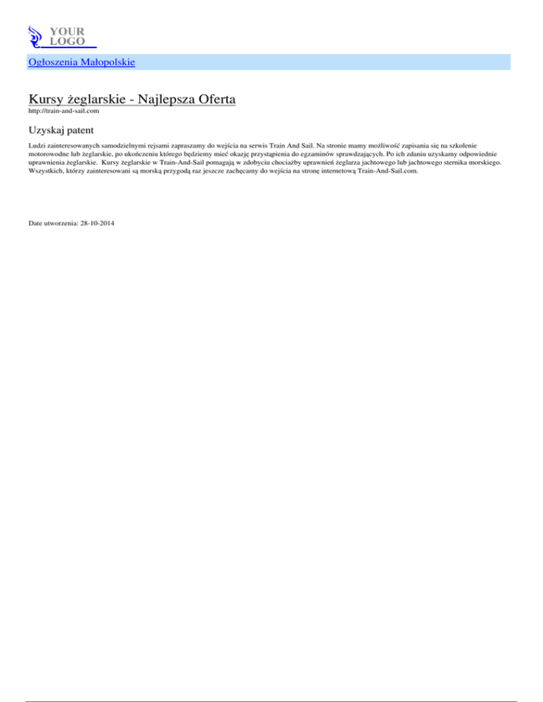 Ogłoszenia Małopolskie Kursy żeglarskie - Najlepsza Oferta http://train-and-sail.com Uzyskaj patent Ludzi zainteresowanych samodzielnymi rejsami zapraszamy do wejścia na serwis Train And Sail. Na stronie mamy możliwość zapisania się na szkolenie motorowodne lub żeglarskie, po ukończeniu którego będziemy mieć okazję przystąpienia do egzaminów sprawdzających. Po ich zdaniu uzyskamy odpowiednie uprawnienia żeglarskie. Kursy żeglarskie w Train-And-Sail pomagają w zdobyciu chociażby uprawnień żeglarza jachtowego lub jachtowego sternika morskiego. Wszystkich, którzy zainteresowani są morską przygodą raz jeszcze zachęcamy do wejścia na stronę internetową Train-And-Sail.com. Date utworzenia: 28-10-2014
