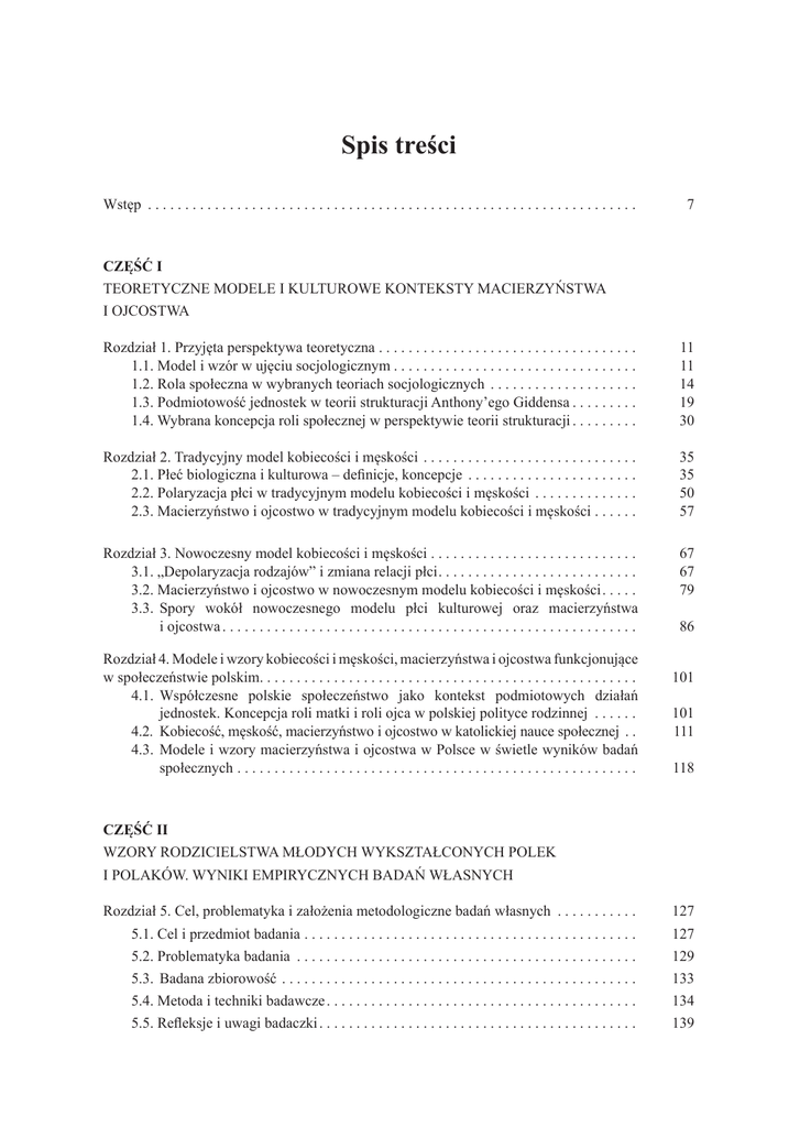 Spis treści Wstęp . . . . . . . . . . . . . . . . . . . . . . . . . . . . . . . . . . . . . . . . . . . . . . . . . . . . . . . . . . . . . . . . . . 7 CZĘŚĆ I TEORETYCZNE MODELE I KULTUROWE KONTEKSTY MACIERZYŃSTWA I OJCOSTWA Rozdział 1. Przyjęta perspektywa teoretyczna. . . . . . . . . . . . . . . . . . . . . . . . . . . . . . . . . . . 1.1. Model i wzór w ujęciu socjologicznym. . . . . . . . . . . . . . . . . . . . . . . . . . . . . . . . . 1.2. Rola społeczna w wybranych teoriach socjologicznych . . . . . . . . . . . . . . . . . . . . 1.3. Podmiotowość jednostek w teorii strukturacji Anthony’ego Giddensa. . . . . . . . . 1.4. Wybrana koncepcja roli społecznej w perspektywie teorii strukturacji. . . . . . . . . 11 11 14 19 30 Rozdział 2. Tradycyjny model kobiecości i męskości . . . . . . . . . . . . . . . . . . . . . . . . . . . . . 35 2.1. Płeć biologiczna i kulturowa – definicje, koncepcje . . . . . . . . . . . . . . . . . . . . . . . 35 2.2. Polaryzacja płci w tradycyjnym modelu kobiecości i męskości . . . . . . . . . . . . . . 50 2.3. Macierzyństwo i ojcostwo w tradycyjnym modelu kobiecości i męskości. . . . . . 57 Rozdział 3. Nowoczesny model kobiecości i męskości. . . . . . . . . . . . . . . . . . . . . . . . . . . . 3.1. „Depolaryzacja rodzajów” i zmiana relacji płci. . . . . . . . . . . . . . . . . . . . . . . . . . . 3.2. Macierzyństwo i ojcostwo w nowoczesnym modelu kobiecości i męskości. . . . . 3.3. Spory wokół nowoczesnego modelu płci kulturowej oraz macierzyństwa i ojcostwa. . . . . . . . . . . . . . . . . . . . . . . . . . . . . . . . . . . . . . . . . . . . . . . . . . . . . . . . Rozdział 4. Modele i wzory kobiecości i męskości, macierzyństwa i ojcostwa funkcjonujące w społeczeństwie polskim. . . . . . . . . . . . . . . . . . . . . . . . . . . . . . . . . . . . . . . . . . . . . . . . . . . 4.1. Współczesne polskie społeczeństwo jako kontekst podmiotowych działań jednostek. Koncepcja roli matki i roli ojca w polskiej polityce rodzinnej . . . . . . 4.2. Kobiecość, męskość, macierzyństwo i ojcostwo w katolickiej nauce społecznej . . 4.3. Modele i wzory macierzyństwa i ojcostwa w Polsce w świetle wyników badań społecznych. . . . . . . . . . . . . . . . . . . . . . . . . . . . . . . . . . . . . . . . . . . . . . . . . . . . . . 67 67 79 86 101 101 111 118 CZĘŚĆ II WZORY RODZICIELSTWA MŁODYCH WYKSZTAŁCONYCH POLEK I POLAKÓW. WYNIKI EMPIRYCZNYCH BADAŃ WŁASNYCH Rozdział 5. Cel, problematyka i założenia metodologiczne badań własnych . . . . . . . . . . . 5.1. Cel i przedmiot badania. . . . . . . . . . . . . . . . . . . . . . . . . . . . . . . . . . . . . . . . . . . . . 5.2. Problematyka badania . . . . . . . . . . . . . . . . . . . . . . . . . . . . . . . . . . . . . . . . . . . . . . 5.3. Badana zbiorowość . . . . . . . . . . . . . . . . . . . . . . . . . . . . . . . . . . . . . . . . . . . . . . . . 5.4. Metoda i techniki badawcze. . . . . . . . . . . . . . . . . . . . . . . . . . . . . . . . . . . . . . . . . . 5.5. Refleksje i uwagi badaczki. . . . . . . . . . . . . . . . . . . . . . . . . . . . . . . . . . . . . . . . . . . 127 127 129 133 134 139 6 Rozdział 6. Kobiecość i męskość w świadomości młodych wykształconych Polaków. . . . 6.1. Sposób definiowania kobiecości i męskości przez uczestników badania. . . . . . . 6.2. Postrzeganie macierzyństwa i ojcostwa jako elementów roli kobiety i mężczyzny w świetle wypowiedzi respondentów . . . . . . . . . . . . . . . . . . . . . . . . . . . . . . . . . . 6.3. Konkluzje. . . . . . . . . . . . . . . . . . . . . . . . . . . . . . . . . . . . . . . . . . . . . . . . . . . . . . . . Rozdział 7. Wzory roli matki i roli ojca realizowane przez młodych wykształconych Polaków. . . . . . . . . . . . . . . . . . . . . . . . . . . . . . . . . . . . . . . . . . . . . . . . . . . . . . . . . . . . . . . . . 7.1. Sposób definiowania macierzyństwa i ojcostwa przez badanych. . . . . . . . . . . . . 7.2. Rodzicielstwo młodych wykształconych Polaków – partnerstwo czy podział ról?. . . . . . . . . . . . . . . . . . . . . . . . . . . . . . . . . . . . . . . . . . . . . . . . . . . . . . . . . . . . . 7.3. Role matki i ojca w rodzinach pochodzenia uczestników badania. . . . . . . . . . . . 7.4. Konkluzje. . . . . . . . . . . . . . . . . . . . . . . . . . . . . . . . . . . . . . . . . . . . . . . . . . . . . . . . 145 145 158 165 167 167 182 193 198 Rozdział 8. Macierzyństwo i ojcostwo jako nowe doświadczenie kobiety i mężczyzny. . . 8.1. Zostanie rodzicem jako przełomowy moment w życiu kobiet i mężczyzn. . . . . . 8.2. „Jestem matką”, „jestem ojcem” – kobiety i mężczyźni o zmianach w sposobie postrzegania siebie. . . . . . . . . . . . . . . . . . . . . . . . . . . . . . . . . . . . . . . . . . . . . . . . . 8.3. Konkluzje. . . . . . . . . . . . . . . . . . . . . . . . . . . . . . . . . . . . . . . . . . . . . . . . . . . . . . . . 201 201 Zakończenie . . . . . . . . . . . . . . . . . . . . . . . . . . . . . . . . . . . . . . . . . . . . . . . . . . . . . . . . . . . . . 213 Bibliografia. . . . . . . . . . . . . . . . . . . . . . . . . . . . . . . . . . . . . . . . . . . . . . . . . . . . . . . . . . . . . . 217 Wykaz tabel. . . . . . . . . . . . . . . . . . . . . . . . . . . . . . . . . . . . . . . . . . . . . . . . . . . . . . . . . . . . . . 235 Od Redakcji . . . . . . . . . . . . . . . . . . . . . . . . . . . . . . . . . . . . . . . . . . . . . . . . . . . . . . . . . . . . . 237 206 212