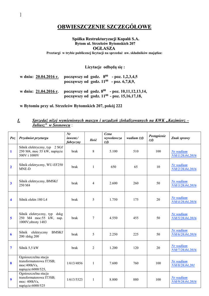 ] OBWIESZCZENIE SZCZEGÓŁOWE Spółka Restrukturyzacji Kopalń S.A. Bytom ul. Strzelców Bytomskich 207 OGŁASZA Przetargi w trybie publicznej licytacji na sprzedaż nw. składników majątku: Licytacje odbędą się : w dniu: 20.04.2016 r. począwszy od godz. 800 - poz. 1,2,3,4,5 począwszy od godz. 1100 - poz. 6,7,8,9, w dniu: 21.04.2016 r. począwszy od godz. 800 - poz. 10,11,12,13,14, począwszy od godz. 1100 - poz. 15,16,17,18, w Bytomiu przy ul. Strzelców Bytomskich 207, pokój 222 I. Sprzedaż niżej wymienionych maszyn i urządzeń zlokalizowanych na KWK „Kazimierz – Juliusz” w Sosnowcu : Nr inwent./ fabryczny Ilość Cena wywoławcza (zł) wadium (zł) Postąpienie (zł) Silnik elektryczny, typ 2 SGf 250 M4, moc 55 kW, napięcie 500V i 1000V brak 8 5.100 510 100 2 Silnik elektryczny, WU-EF250 MNE-D brak 1 650 65 10 Nr wadium NM/2/20.04.2016 3 Silnik elektryczny, BMSKf 250 M4 brak 4 2.600 260 50 Nr wadium NM/3/20.04.2016 4 Silnik elektr.180 L4 brak 5 1.750 175 20 Nr wadium NM/4/20.04.2016 5 Silnik elektryczny, typ dskg 250 M4 moc:55 kW, nap. 1000V;obroty 1483 brak 7 4.550 455 50 Nr wadium NM/5/20.04.2016 6 Silnik elektryczny 200 /dskg 200 brak 5 2.250 225 50 Nr wadium NM/6/20.04.2016 7 Silnik 5,5 kW brak 2 1.200 120 20 Nr wadium NM/7/20.04.2016 1/613/4856 1 7.600 760 100 Nr wadium NM/8/20.04.201 1/613/5323 1 8.800 880 100 Nr wadium NM/9/20.04.2016 Poz Przedmiot przetargu 1 8 9 BMSKf Ognioszczelna stacja transformatorowa IT3SB; moc:400kVa, napięcie:6000/525, Ognioszczelna stacja transformatorowa IT3SB; moc: 400kVa, napięcie:6000/525 Znak sprawy Nr wadium NM/1/20.04.2016 10 11 12 13 14 15 16 17 Ognioszczelna stacja transformatorowa IT3SB; moc: 400kVa, napięcie:6000/525 Ognioszczelna stacja transformatorowa IT3SB; moc: 400kVa, napięcie:6000/525 Ognioszczelna stacja transformatorowa IT3SB; moc: 400kVa, napięcie:6000/525 Ognioszczelna stacja transformatorowa IT3SB; moc: 630kVa, napięcie:6000/525 Ognioszczelna stacja transformatorowa IT3SB; moc: 400kVa, napięcie:6000/525 Ognioszczelna stacja transformatorowa IT3SB; moc: 400kVa, napięcie:6000/525 Ognioszczelna stacja transformatorowa IT3SB; moc: 630kVa, napięcie:6000/525 Ognioszczelna stacja transformatorowa IT3SB; moc: 400kVa, napięcie:6000/525, II. Poz 18 1/613/4797 1 3.800 380 50 Nr wadium NM/10/21.04.2016 1/613/4422 1 3.800 380 50 Nr wadium NM/11/21.04.2016 1/613/5334 1 8.800 880 100 Nr wadium NM/21/06.04.2016 1/613/6378 1 17.700 1.770 200 Nr wadium NM/13/21.04.2016 1/613/5749 1 3.800 380 50 Nr wadium NM/14/21.04.2016 1/613/5278 1 8.800 880 100 Nr wadium NM/15/21.04.2016 1/613/6173 1 15.500 1.550 200 Nr wadium NM/16/21.04.2016 1/613/5609 1 3.800 380 50 Nr wadium NM/17/21.04.2016 Sprzedaż niżej wymienionych maszyn i urządzeń zlokalizowanych na KWK „Mysłowice” w Mysłowicach : Przedmiot przetargu a/ Transformator olejowy TAOO 1000/6 Moc 1000 kV, napięcie górne 6,3 kV, napięcie dolne 0,4 kV, rok produkcji 1978, masa całkowita 3 860 kg ------------------------------------b/ Transformator olejowy TAOO1000/6 Moc 1000 kV, napięcie górne 6,3 kV, napięcie dolne 0,4 kV, rok produkcji 1978, masa całkowita 3 860 kg ------------------------------------c/ Transformator olejowy KTMU 7x45216 Moc 1000 kV, napięcie górne 6 kV, napięcie dolne 0,5 kV, rok produkcji 1977, masa całkowita 3 600 kg ----------------------------------d/ Transformator olejowy KTMU 7x45216 Moc 1000 kV, napięcie górne 6 kV, napięcie dolne 0,5 kV, rok produkcji 1977, masa całkowita 3 600 kg Nr inwent./ fabryczny Ilość Cena wywoławcza (zł) wadium (zł) Łączna cena 33.200 3.320 Postąpienie (zł) Znak sprawy Nr inwent. dla poz. a,b,c,d 1/610/3029 32 4 Nr fabryczne a / 26714 b/ 26715 c/ 5120843 d/5120842 500 Nr wadium NM/18/21.04.2016 „Do wylicytowanej ceny sprzedaży maszyn i urządzeń wymienionych w poz. 1 -18 zostanie doliczony podatek od towarów i usług według stawki 23%.” W/w urządzenia techniczne zostały z uwagi na zaprzestanie ich eksploatacji trwale wyłączone z ruchu. Warunkiem przystąpienia do przetargu jest: 1/ wniesienie wadium w podanej wyżej wysokości w terminie do dnia 18.04.2016 r. przelewem na konto Spółki Nr konta: 30 1050 1230 1000 0024 1045 1583, z dokładnym oznaczeniem przedmiotu przetargu na który zostało wpłacone wadium dla pozycji przetargowej dot. sprzedaży składnika majatku, dla której zostało wpłacone wadium, na przelewie należy wpisać Nr wadium i krótki opis przedmiotu przetargu (datą wniesienia wadium jest data wpływu środków na konto Spółki), - okazanie członkom komisji przetargowej dowodu tożsamości a w przypadku podmiotów gospodarczych dodatkowo aktualnego wypisu z rejestru handlowego albo zaświadczenia o wpisie do ewidencji działalności gospodarczej oraz dokumentów, z których wynika umocowanie do reprezentowania uczestnika przetargu, - przedłożenie członkom komisji podpisanego oświadczenia o tym, iż uczestnik licytacji zapoznał się i akceptuje bez zastrzeżeń : stan prawny i faktyczny, w tym techniczny przedmiotu przetargu, postanowienia “Regulaminu sprzedaży oraz oddawania mienia Spółki Restrukturyzacji Kopalń S.A do odpłatnego korzystania innym podmiotom z wyjatkiem sprzedazy nieruchomości.”, treść “Obwieszczenia szczegółowego” Przedmiot przetargu może być oglądany w dni robocze od poniedziałku do piątku w godzinach od 800–1400 do dnia: 18.04.2016r., po wcześniejszym ustaleniu terminu pod numerem telefonicznym: - dla poz. 1 – 17 (32) 368 55 18 (kom. 668 491 581), - dla poz. 18 (32) 317 67 20. Dodatkowych informacji można uzyskać pod numerami telefonów: (032) 35-13-361, 35-13-362, (32) 396 66 74.191 Wadium przepada na rzecz Spółki w przypadku jeżeli żaden z uczestników licytacji nie zaoferuje co najmiej ceny wywoławczej. Wadium złożone przez uczestników licytacji, których oferty nie zostaną wybrane zostanie zwrócone niezwłocznie po zatwierdzeniu wyników przetargu przez Zarząd Spółki w formie uchwały. W