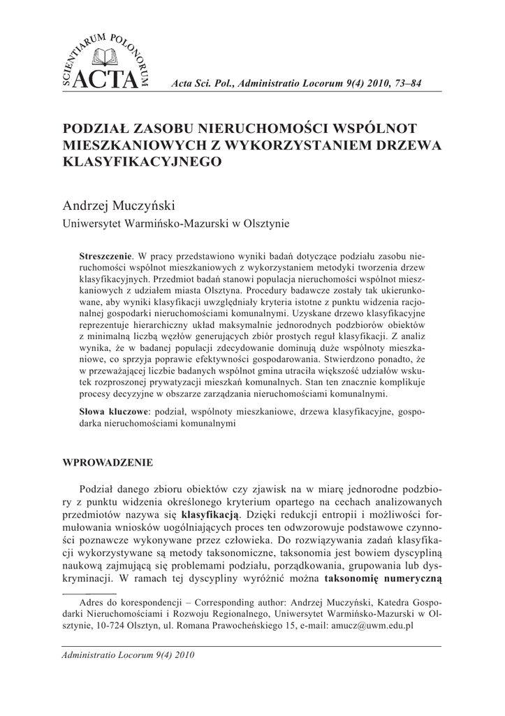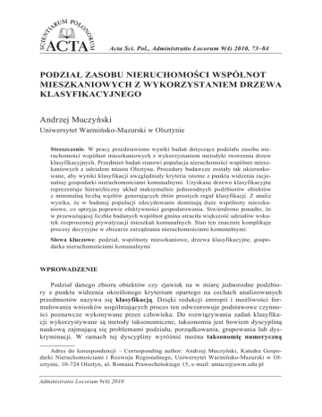 Podział zasobu nieruchomości wspólnot mieszkaniowych... 73 Acta Sci. Pol., Administratio Locorum 9(4) 2010, 73–84 PODZIAŁ ZASOBU NIERUCHOMOŚCI WSPÓLNOT MIESZKANIOWYCH Z WYKORZYSTANIEM DRZEWA KLASYFIKACYJNEGO Andrzej Muczyński Uniwersytet Warmińsko-Mazurski w Olsztynie Streszczenie. W pracy przedstawiono wyniki badań dotyczące podziału zasobu nieruchomości wspólnot mieszkaniowych z wykorzystaniem metodyki tworzenia drzew klasyfikacyjnych. Przedmiot badań stanowi populacja nieruchomości wspólnot mieszkaniowych z udziałem miasta Olsztyna. Procedury badawcze zostały tak ukierunkowane, aby wyniki klasyfikacji uwzględniały kryteria istotne z punktu widzenia racjonalnej gospodarki nieruchomościami komunalnymi. Uzyskane drzewo klasyfikacyjne reprezentuje hierarchiczny układ maksymalnie jednorodnych podzbiorów obiektów z minimalną liczbą węzłów generujących zbiór prostych reguł klasyfikacji. Z analiz wynika, że w badanej populacji zdecydowanie dominują duże wspólnoty mieszkaniowe, co sprzyja poprawie efektywności gospodarowania. Stwierdzono ponadto, że w przeważającej liczbie badanych wspólnot gmina utraciła większość udziałów wskutek rozproszonej prywatyzacji mieszkań komunalnych. Stan ten znacznie komplikuje procesy decyzyjne w obszarze zarządzania nieruchomościami komunalnymi. Słowa kluczowe: podział, wspólnoty mieszkaniowe, drzewa klasyfikacyjne, gospodarka nieruchomościami komunalnymi WPROWADZENIE Podział danego zbioru obiektów czy zjawisk na w miarę jednorodne podzbiory z punktu widzenia określonego kryterium opartego na cechach analizowanych przedmiotów nazywa się klasyfikacją. Dzięki redukcji entropii i możliwości formułowania wniosków uogólniających proces ten odwzorowuje podstawowe czynności poznawcze wykonywane przez człowieka. Do rozwiązywania zadań klasyfikacji wykorzystywane są metody taksonomiczne, taksonomia jest bowiem dyscypliną naukową zajmującą się problemami podziału, porządkowania, grupowania lub dyskryminacji. W ramach tej dyscypliny wyróżnić można taksonomię numeryczną Adres do korespondencji – Corresponding author: Andrzej Muczyński, Katedra Gospodarki Nieruchomościami i Rozwoju Regionalnego, Uniwersytet Warmińsko-Mazurski w Olsztynie, 10-724 Olsztyn, ul. Romana Prawocheńskiego 15, e-mail: [email protected] Administratio Locorum 9(4) 2010 74 Andrzej Muczyński (ilościową) i symboliczną (jakościową). Klasyczna taksonomia numeryczna (taksonometria) posługuje się obecnie prawie wyłącznie metodami ilościowymi, w których cechy obiektów mierzone są na skalach mocnych, a miary podobieństwa oparte na odległości wyrażonej z reguły funkcjami rzeczywistymi. Z kolei taksonomia symboliczna obejmuje grupę metod klasyfikacji charakteryzujących się tym, że ich przedmiotem są przede wszystkim obiekty symboliczne, których cechy mają charakter jakościowy i są reprezentowane przez zmienne mierzone w skalach słabych: nominalnej i porządkowej. Podejście symboliczne pozwala po prostu rozszerzyć przedmiot zainteresowań taksonomii na obiekty o złożonej strukturze, do których zaliczyć należy nieruchomości wspólnot mieszkaniowych. W zbiorze metod taksonomii symbolicznej jedną z podstawowych metod klasyfikacji takich obiektów jest metoda oparta na budowaniu drzew klasyfikacyjnych (decyzyjnych). Celem pracy jest dokonanie podziału zasobu nieruchomości wspólnot mieszkaniowych z wykorzystaniem metodyki tworzenia drzew klasyfikacyjnych. Opracowanie zasad hierarchicznego podziału badanego zbioru może być wykorzystane do wspomagania decyzji w procesach gospodarowania zasobami gminnymi, w szczególności w zakresie polityki prywatyzacyjnej i inwestycyjnej. Przedmiot badań stanowi populacja nieruchomości wspólnot mieszkaniowych z udziałem miasta Olsztyna. Procedury badawcze zostały tak ukierunkowane, aby wyniki klasyfikacji uwzględniały kryteria istotne z punktu widzenia racjonalnej gospodarki nieruchomościami komunalnymi. Uzyskane drzewo winno reprezentować hierarchiczny układ maksymalnie jednorodnych podzbiorów obiektów – z punktu widzenia przyjętych kryteriów – przy minimalnej liczbie węzłów decyzyjnych prowadzących do zbioru możliwie prostych reguł klasyfikacji. DRZEWA KLASYFIKACYJNE JAKO METODA TAKSONOMII SYMBOLICZNEJ Taksonomia symboliczna dostarcza komplementarnych metod klasyfikacji w stosunku do metod klasycznej taksonometrii będących ich rozszerzeniem i uzupełnieniem. Jej metody są stosowane wtedy, gdy charakter danych statystycznych nie pozwala na wykorzystanie metod numerycznych. Podobieństwo pary obiektów w tym ujęciu uwzględnia własności pozostałych obiektów w zbiorze (tzn. wykorzystuje miarę kontekstową). Ważną cechą metod symbolicznych jest generowanie informacji w postaci deklaratywnej, a powstałe w efekcie podziału skupienia są łatwiejsze do interpretacji dzięki zastosowaniu do ich opisu wyrażeń koniunkcyjnych opartych na wartościach cech należących do nich obiektów. Klasy obiektów uzyskane metodami symbolicznymi mają charakter naturalny, gdyż większość z nich opiera się na wynikach badań nad kategoryzacją dokonywaną przez ludzi. Metody symboliczne są poza tym mniej wymagające od metod numerycznych, dopuszczają bowiem nieznajomość niektórych cech lub brak precyzji ich pomiaru, jak również sekwencyjne włączanie obiektów do struktury klas. W przeciwieństwie do taksonomii numerycznej, której główne zadanie polega na znalezieniu struktury klas, w ramach taksonomii symbolicznej realizowane są jednocześnie dwie grupy czynności [Gatnar 1998]: Acta Sci. Pol. Podział zasobu nieruchomości wspólnot mieszkaniowych... 75 podział na skupienia – wyodrębnienie jednorodnych grup obiektów (klas), i znalezienie charakterystyki wydzielonych klas – opis klas za pomocą odpowiednich pojęć (zbiorów reguł przynależności obiektów do wyróżnionych klas). Podstawy teoretyczne metod