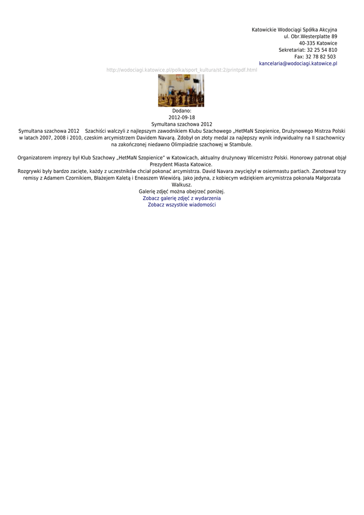 Katowickie Wodociągi Spółka Akcyjna ul. Obr.Westerplatte 89 40-335 Katowice Sekretariat: 32 25 54 810 Fax: 32 78 82 503 [email protected] http://wodociagi.katowice.pl/polka/sport_kultura/st:2/printpdf.html Dodano: 2012-09-18 Symultana szachowa 2012 Symultana szachowa 2012 Szachiści walczyli z najlepszym zawodnikiem Klubu Szachowego „HetMaN Szopienice, Drużynowego Mistrza Polski w latach 2007, 2008 i 2010, czeskim arcymistrzem Davidem Navarą. Zdobył on złoty medal za najlepszy wynik indywidualny na II szachownicy na zakończonej niedawno Olimpiadzie szachowej w Stambule. Organizatorem imprezy był Klub Szachowy „HetMaN Szopienice” w Katowicach, aktualny drużynowy Wicemistrz Polski. Honorowy patronat objął Prezydent Miasta Katowice. Rozgrywki były bardzo zacięte, każdy z uczestników chciał pokonać arcymistrza. David Navara zwyciężył w osiemnastu partiach. Zanotował trzy remisy z Adamem Czornikiem, Błażejem Kaletą i Eneaszem Wiewiórą. Jako jedyna, z kobiecym wdziękiem arcymistrza pokonała Małgorzata Walkusz. Galerię zdjęć można obejrzeć poniżej. Zobacz galerię zdjęć z wydarzenia Zobacz wszystkie wiadomości