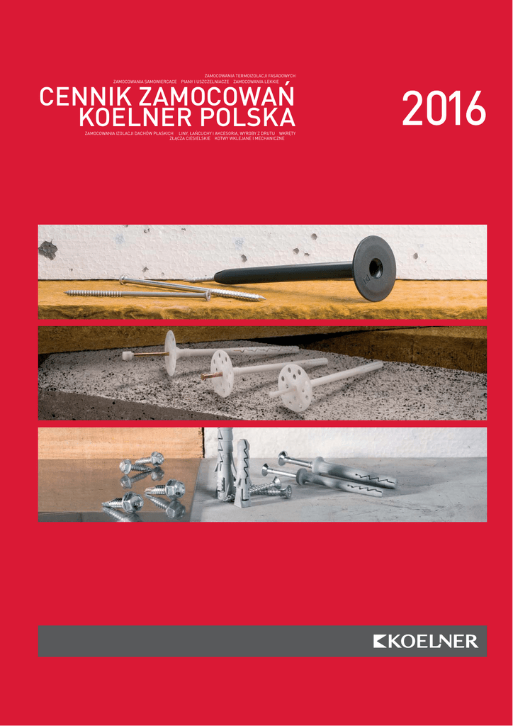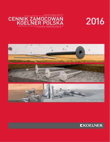 ZAMOCOWANIA TERMOIZOLACJI FASADOWYCH ZAMOCOWANIA SAMOWIERCĄCE PIANY I USZCZELNIACZE ZAMOCOWANIA LEKKIE CENNIK ZAMOCOWAŃ KOELNER POLSKA ZAMOCOWANIA IZOLACJI DACHÓW PŁASKICH LINY, ŁAŃCUCHY I AKCESORIA, WYROBY Z DRUTU WKRĘTY ZŁĄCZA CIESIELSKIE KOTWY WKLEJANE I MECHANICZNE 2016 SZANOWNI PAŃSTWO, Koelner to największy Polski producent zamocowań budowlanych, który za sprawą systematycznie rozwijanej oferty produktów o niezmiennie wysokiej jakości, szybko zaskarbił sobie powszechne uznanie klientów. Firma od ponad trzydziestu lat zajmuje się projektowaniem i wytwarzaniem rozwiązań cenionych i chętnie wybieranych zarówno przez profesjonalnych wykonawców dużych inwestycji, jak również użytkowników indywidualnych. Systematycznie rozwijana oferta marki ewoluuje wraz ze zmianą oczekiwań i wymagań klientów oraz wzrostem możliwości technologicznych i produkcyjnych. Głównymi grupami produktów dostępnych w ofercie firmy są: • łączniki izolacji fasadowych • łączniki samowiercące • liny, łańcuchy i akcesoria, wyroby z drutu oraz łączniki ciesielskie • łączniki do szybkiego montażu i systemów suchej zabudowy Wraz z rozwojem firmy jej produkty stają się coraz popularniejsze także na rynkach wielu krajów Europejskich. Przykładem mogą być na przykład Systemy łączników izolacji dachowych i fasadowych, które cieszą się coraz większym uznaniem np. we Francji, Wielkiej Brytanii czy Rosji. Wśród licznych zgromadzonych przez lata nagród i wyróżnień, za potwierdzenie profesjonalnego i odpowiedzialnego podejścia przedsiębiorstwa może służyć Certyfikat Zgodności z normą ISO 9001:2008 przyznany w zakresie projektowania, produkcji i handlu elementami złącznymi wykonanymi zarówno z metalu jak i tworzywa, a także kotwami wklejanymi. Cennik 2016 ETA ITB Płyta wiórowa Materiały izolujące Tworzywo PCV Płyta gipsowo-kartonowa Drewno Blacha stalowa Gazobeton Lekki beton Bloczki otworowe Cegła otworowa Cegła pełna Kamień Beton Beton spękany Spis treści str. KOTWY WKLEJANE I MECHANICZNE KEM-PSF Kotwa wklejane bez styrenu 10 R-GUN wyciskacz do kotew wklejanych 10 R-STUDS Pręty metryczne gwintowane 10 R-BRUSH-M Wycior metalowy 11 R-BRUSH Tworzywowy wycior manualny 11 R-PLS tuleja siatkowa plastikowa 11 R-NOZ Mieszacz do kotew wklejanych 11 KT Kotwa tulejowa do małych obciążeń 12 ZAMOCOWANIA LEKKIE KD/KD-K kołek ramowy z długą strefą rozporu i wkrętem z łbem heksagonalnym 14 KDS Kołek ramowy z długą strefą rozporu i wkrętem z łbem stożkowym PZ 14 KKS Kołek ramowy z krótką strefą rozporu i wkrętem z łbem stożkowym PZ 15 KKT kołek ramowy z krótką strefą rozporu i wkrętem z łbem stożkowym t40 15 KKD kołek ramowy z krótką strefą rozporu i wkrętem z łbem heksagonalnym 15 WHO Wkręt ościeżnicowy 16 WHS Wkręt ościeżnicowy 16 O Metalowa kotwa ościeżnicowa 17 Zaślepka maskująca do kotwy ościeżnicowej 17 KMW Metalowy kołek wbijany 17 TM Mosiężna tuleja rozprężna 17 KGS Kotwa do gazobetonu 18 SRS Kotwa sufitowa 18 KTS Kotwa rozprężna z hakiem 18 FX-C Kołek wbijany z kołnierzem cylindrycznym 19 FX-K Kołek wbijany z kołnierzem 19 FX-L Kołek wbijany 20 FIX Kołek rozporowy 20 FIX+ Kołek rozporowy z wkrętem 21 FIX Kołek rozporowy z hakiem 21 FIX+HEX Kołek rozporowy z wkrętem z łbem heksagonalnym 22 Wszystkie towary znajdujące się w tej publikacji są oznaczone oraz dystrybuowane ze znakami towarowymi KOELNER® 1 Cennik 2016 str. ZAMOCOWANIA LEKKIE FIX-NF/FIX-KK Kołek rozporowy z kołnierzem 22 FIX-K+ Kołek rozporowy z kołnierzem i wkrętem 23 FIX-K- Kołek rozporowy z kołnierzem i hakiem 23 KS Uniwersalny kołek rozporowy 24 KS Uniwersalny kołek rozporowy z wkrętem 24 KS Uniwersalny kołek rozporowy z wkrętem z hakiem kątowym 24 KS Uniwersalny kołek rozporowy z hakiem sufitowym 25 LSB Mocowanie drewnianych stopnic schodowych 25 FIX-ODBK Odbojnik drzwiowy 25 KPM Zestaw do mocowania sanitariatów 25 KPU Zestaw do mocowania umywalek 26 LSB-P Znacznik centrujący do stopnic schodowych 26 DRA Łącznik samowiercący do płyt GK 26 G/GL/GK Kołek do płyt cienkościennych 27 GKT-A Taśma akustyczna 27 GKT-P Taśma antyrysowa samoprzylepna 27 GKT-S Taśma spoinowa szklana 28 NAL Narożnik aluminiowy 28 NAL-P Półnarożnik aluminiowy 28 NAP Narożnik PCV 28 NALUK Narożnik PCV do łuków 29 NLU Profil dylatacyjny przyokienny 29 NGK Profil wykończeniowy PVC typu J 29 Listwy W-6 i W-10 29 Z-WOBR Wieszak obrotowy ze złączem samozaciskowym pojedynczym 30 Z-ES Wieszak bezpośredni uniwersalny 30 Z-LPJ Łącznik poprzeczny jednostronny 30 Z-N-G Noniusz górny 30 Z-N-KLM Klamra do wieszaka noniuszowego 31 Z-N-WT Wieszak typu thermatex z noniuszem 31 Z-N-WOBR Wieszak obrotowy z noniuszem 31 Wszystkie towary znajdujące się w tej publikacji są oznaczone oraz dystrybuowane ze znakami towarowymi KOELNER® 2 ETA ITB Płyta wiórowa Materiały izolujące Tworzywo PCV Płyta gipsowo-kartonowa Drewno Blacha stalowa Cegła otworowa Gazobeton Cegła pełna Lekki beton Kamień Bloczki otworowe Beton Beton spękany Spis treści ETA ITB Płyta wiórowa Materiały izolujące Tworzywo PCV Płyta gipsowo-kartonowa Drewno Blacha stalowa Gazobeton Lekki beton Bloczki otworowe Cegła otworowa Cegła pełna Kamień Beton Beton spękany Spis treści str. ZAMOCOWANIA LEKKIE Z-UE Wieszak bezpośredni 31 Z-WD Złącze samozaciskowe podwójne 32 Z-WKP Wieszak kotwowy bezpośredni 32 Komplet do osadzania ościeżnic 32 Z-WK Wieszak kotwowy 32 Z-WT Wieszak elastyczny bezpośredni 32 Z-WKB Wieszak płaski ze sprężyną 33 Z-WP Wieszak kotwowy uniwersalny 33 Z-L-O/Z-L-H Pręty mocujące 33 Z-LKRZ Łącznik krzyżowy 34 Z-LW Łącznik wzdłużny 34 Z-KSP Kotwa wbijana do sufitów podwieszanych 34 GS Stalowa kotwa wbijana 34 Z-KDP Kątowniki 34 ZAMOCOWANIA TERMOIZOLACJI FASADOWYCH KI-10NS Kołek fasadowy z długą strefą rozporu 36 KI-10N Kołek fasadowy wbijany z długą strefą rozporu 36 KI-10M Kołek