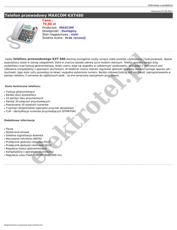 Informacje o produkcie Utworzono 07-03-2017 Telefon przewodowy MAXCOM KXT480 Cena : 79,00 zł Producent : MAXCOM Dostępność : Dostępny Stan magazynowy : niski Średnia ocena : brak recenzji ● ● ● ● ● ● Funkcja głośnomówiąca Bardzo duży wyświetlacz 10 pamięci dwu-przyciskowych Pamięć 20 połączeń przychodzących Powtarzanie 20 ostatnich numerów 3 pamięci bezpośrednie (specjalne przyciski obrazkowe) CLIP - identyfikacja numerów przychodzących (DTMF/FSK) Dodatkowe informacje ● ● ● ● ● ● ● Pauza Wybieranie tonowe Świetlna sygnalizacja dzwonka Wyciszenie mikrofonu (MUTE) Przełącznik głośności dzwonka HI/LO Przełącznik głośności słuchawki HI/LO Regulacja funkcji głośnomówiącej Kompatybilny z aparatami słuchowymi Regulacja czasu Flash (100/300/600/1000 ms) ek ● el ● tr o ● Wygenerowano w programie www.oscGold.com te Dane techniczne telefonu: l.p l Zalety telefonu przewodowego KXT 480 docenią szczególnie osoby ceniące sobie prostotę użytkowania i funkcjonalność. Aparat wyposażony został w szereg udogodnień, które w znaczny sposób ułatwią życie osobom starszym. Telefon posiada bardzo duży wyświetlacz oraz funkcję głośnomówiącą, dzięki czemu staje się wygodny w codziennym użytkowaniu. Jako jeden z nielicznych jest całkowicie kompatybilny z aparatami słuchowymi. W telefonie można również regulować głośność dzwonka zarówno samego aparatu jak i słuchawki. Jego duże cyfry pozwalają na łatwe i wygodne wybieranie numeru. Bardzo ciekawą funkcją jest możliwość zaprogramowania w pamięci telefonu 3 numerów do najbliższych osób – są one oznaczone specjalnymi przyciskami.