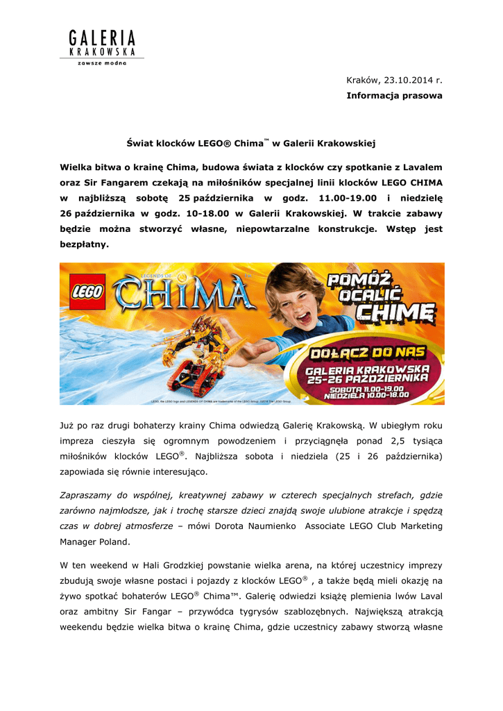 Kraków, 23.10.2014 r. Informacja prasowa Świat klocków LEGO® Chima™ w Galerii Krakowskiej Wielka bitwa o krainę Chima, budowa świata z klocków czy spotkanie z Lavalem oraz Sir Fangarem czekają na miłośników specjalnej linii klocków LEGO CHIMA w najbliższą sobotę 25 października w godz. 11.00-19.00 i niedzielę 26 października w godz. 10-18.00 w Galerii Krakowskiej. W trakcie zabawy będzie można stworzyć własne, niepowtarzalne konstrukcje. Wstęp jest bezpłatny. Już po raz drugi bohaterzy krainy Chima odwiedzą Galerię Krakowską. W ubiegłym roku impreza cieszyła się ogromnym powodzeniem i przyciągnęła ponad 2,5 tysiąca ® miłośników klocków LEGO . Najbliższa sobota i niedziela (25 i 26 października) zapowiada się równie interesująco. Zapraszamy do wspólnej, kreatywnej zabawy w czterech specjalnych strefach, gdzie zarówno najmłodsze, jak i trochę starsze dzieci znajdą swoje ulubione atrakcje i spędzą czas w dobrej atmosferze – mówi Dorota Naumienko Associate LEGO Club Marketing Manager Poland. W ten weekend w Hali Grodzkiej powstanie wielka arena, na której uczestnicy imprezy zbudują swoje własne postaci i pojazdy z klocków LEGO ® , a także będą mieli okazję na żywo spotkać bohaterów LEGO® Chima™. Galerię odwiedzi książę plemienia lwów Laval oraz ambitny Sir Fangar – przywódca tygrysów szablozębnych. Największą atrakcją weekendu będzie wielka bitwa o krainę Chima, gdzie uczestnicy zabawy stworzą własne pojazdy wspierające siły ognia lub armię lodu. Ich modele przesądzą o wyniku rywalizacji. Klienci Galerii, którzy będą chcieli odpocząć od konstruowania niepowtarzalnych pojazdów i figurek, będą mogli zajrzeć do strefy LEGO ® Club i spróbować swoich sił w grach LEGO video lub odwiedzić strefę LEGO® Friends, w której przyjaciółki z Heartlake City wyruszą na wyprawę do dżungli, aby zaopiekować się tamtejszymi zwierzętami. W trakcie weekendu nie zabraknie też atrakcji dla najmłodszych dzieci - do ich dyspozycji będzie strefa LEGO® DUPLO® ze specjalnymi klockami dla maluchów. Zapraszamy na wielkie budowanie do Galerii Krakowskiej w sobotę 25 października w godz. 11.00-19.00 oraz w niedzielę 26 października w godz. 10-18.00. Wstęp jest BEZPŁATNY. Więcej informacji udziela: Ryszard Wysokiński - Dyrektor Centrum Galerii Krakowskiej, ECE Projektmanagement Polska, tel.: +48 12 428 99 00, e-mail: [email protected]