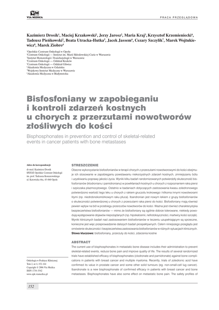 PRACA PRZEGLĄDOWA Kazimierz Drosik1, Maciej Krzakowski2, Jerzy Jarosz2, Maria Kraj3, Krzysztof Krzemieniecki4, Tadeusz Pieńkowski2, Beata Utracka-Hutka5, Jacek Jassem6, Cezary Szczylik7, Marek Wojtukiewicz8, Marek Ziobro4 1 Opolskie Centrum Onkologii w Opolu Centrum Onkologii — Instytut im. Marii Skłodowskiej-Curie w Warszawie 3 Instytut Hematologii i Transfuzjologii w Warszawie 4 Centrum Onkologii — Oddział Kraków 5 Centrum Onkologii — Oddział Gliwice 6 Akademia Medyczna w Gdańsku 7 Wojskowy Instytut Medyczny w Warszawie 8 Akademia Medyczna w Białymstoku 2 Bisfosfoniany w zapobieganiu i kontroli zdarzeń kostnych u chorych z przerzutami nowotworów złośliwych do kości Bisphosphonates in prevention and control of skeletal-related events in cancer patients with bone metastases Adres do korespondencji: STRESZCZENIE dr med. Kazimierz Drosik SPZOZ Opolskie Centrum Onkologii im. prof. Tadeusza Koszarowskiego ul. Katowicka 66a, 45–060 Opole Obecne wykorzystanie bisfosfonianów w terapii chorych z przerzutami nowotworowymi do kości obejmuje ich stosowanie w zapobieganiu powstawaniu niekorzystnych zdarzeń kostnych, zmniejszaniu bólu i uzyskiwaniu poprawy jakości życia. Wyniki kilku badań randomizowanych potwierdziły skuteczność bisfosfonianów (klodronianu i pamidronianu) w powikłaniach kostnych u chorych z rozpoznaniem raka piersi i szpiczaka plazmocytowego. Ostatnio w badaniach dotyczących zastosowania kwasu zoledronowego potwierdzono wartość tego leku u chorych z rakiem gruczołu krokowego i kilkoma innymi nowotworami litymi (np. niedrobnokomórkowym raku płuca). Ibandronian jest nowym lekiem z grupy bisfosfonianów o skuteczności potwierdzonej u chorych z przerzutami raka piersi do kości. Bisfosfoniany mają również pewien wpływ na ból w przebiegu przerzutów nowotworów do kości. Ważna jest również charakterystyka bezpieczeństwa bisfosfonianów — mimo że bisfosfoniany są ogólnie dobrze tolerowane, niekiedy powodują występowanie objawów niepożądanych (np. hipokalcemii, nefrotoksyczności, martwicy kości szczęk). Wyniki klinicznych badań nad zastosowaniem bisfosfonianów w leczeniu uzupełniającym są sprzeczne, konieczne jest więc przeprowadzenie dalszych badań prospektywnych. Celem niniejszego przeglądu jest omówienie skuteczności i bezpieczeństwa zastosowania bisfosfonianów w różnych sytuacjach klinicznych. Słowa kluczowe: bisfosfoniany, przerzuty do kości, zdarzenia kostne ABSTRACT The current use of bisphosphonates in metastatic bone disease includes their administration to prevent skeletal-related events, reduce bone pain and improve quality of life. The results of several randomized trials have established efficacy of bisphosphonates (clodronate and pamidronate) against bone compliOnkologia w Praktyce Klinicznej Tom 2, nr 4, 152–164 Copyright © 2006 Via Medica ISSN 1734–3542 www.opk.viamedica.pl 152 cations in patients with breast cancer and multiple myeloma. Recently, trials of zoledronic acid have confirmed its value in prostate cancer and some other solid tumours (eg. non-small-cell lug cancer). Ibandronate is a new bisphosphonate of confirmed efficacy in patients with breast cancer and bone metastases. Bisphosphonates have also some effect on metastatic bone pain. The safety profiles of Kazimierz Drosik i wsp., Bisfosfoniany w przerzutach do kości bisphosphonates are important — although bisphosphonates are well tolerated in general, they are sometimes associated with adverse events (eg., hypocalcemia, renal toxicity, and osteonecrosis of the jaw). The evidence from adjuvant clinical trials of bisphosphonates is conflicting and more prospective studies are needed to further investigate this issue. This review relates to the efficacy and safety of bisphosphonates in various clinical situations. Key words: bisphosphonates, bone metastases, skeletal-related events Wstęp Zajęcie układu kostnego w przebiegu złośliwych nowotworów dotyczy przynajmniej 50% wszystkich chorych. Zmiany kostne najczęściej wstępują u chorych na szpiczaka plazmocytowego (80–100%), raka gruczołu krokowego (70–75%), raka piersi (65–75%), raka tarczycy (50%), raka płuca (30–40%), czerniaka (15–40%) i raka nerki (20–25%) [1]. Pod względem charakteru obrazu radiograficznego można wyróżnić przerzuty osteolityczne i osteoblastyczne (osteosklerotyczne). Jednak ze względu na wzajemne oddziaływanie osteoklastów i osteoblastów przerzuty w kościach nigdy nie mają jednolitego charakteru (tzn. wyłącznie zmian litycznych lub blastycznych). Można raczej mówić o przerzutach z przewagą zmian osteolitycznych (szpiczak plazmocytowy, rak nerki, czerniak) lub osteoblastycznych (rak gruczołu krokowego, rak piersi) [1]. W warunkach prawidłowych tkanka kostna ulega stałej przebudowie, w której uczestniczą osteoklasty (udział w procesach niszczenia i usuwania) oraz osteoblasty (udział w procesach odbudowy). Aktywność obu rodzajów komórek jest bliska równowagi. Dzięki temu odbudowa kości jest symetryczna i wyrównana (nowa tkanka kostna powstaje w tym samym miejscu i w tej samej ilości co usunięte fragmenty kości) [2]. Następstwa przerzutów nowotworowych do kości nie wiążą się bezpośrednio z obecnością komórek nowotworu. Niedostatek lub nadmiar tkanki kostnej i ich następstwa są wynikiem braku równowagi między osteoklastami a osteoblastami. Zaburzenie równowagi i zwiększenie aktywności osteoklastów (najczęściej) lub osteoblastów w przebiegu nowotworów dokonuje się za pośrednictwem czynników wydzielanych przez komórki nowotworowe, do których zaliczają się: białko parathormonopodobne (PTHrP, parathormon-related protein), transformujący czynnik wzrostu a (TGF-a, transforming growth factor a), interleukina 1 (IL -1), interleukina 6 (IL-6), czynnik martwicy nowotworu (TNF, tumor necrosis factor) i inne [3, 4]. Ryzyko wystąpienia następstw przerzutów nowotworowych do kości, kt