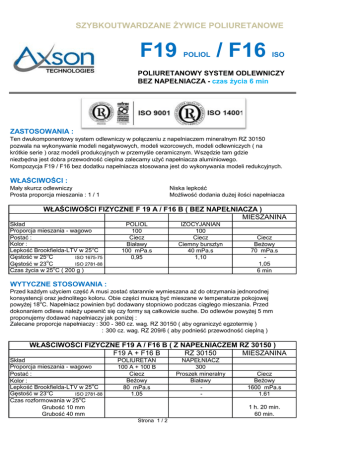 SZYBKOUTWARDZANE ŻYWICE POLIURETANOWE F19 POLIOL / F16 ISO POLIURETANOWY SYSTEM ODLEWNICZY BEZ NAPEŁNIACZA - czas życia 6 min ZASTOSOWANIA : Ten dwukomponentowy system odlewniczy w połączeniu z napelniaczem mineralnym RZ 30150 pozwala na wykonywanie modeli negatywowych, modeli wzorcowych, modeli odlewniczych ( na krótkie serie ) oraz modeli produkcyjnych w przemyśle ceramicznym. Wszędzie tam gdzie niezbędna jest dobra przewodność cieplna zalecamy użyć napełniacza aluminiowego. Kompozycja F19 / F16 bez dodatku napełniacza stosowana jest do wykonywania modeli redukcyjnych. WŁAŚCIWOŚCI : Mały skurcz odlewniczy Prosta proporcja mieszania : 1 / 1 Niska lepkość Możliwość dodania dużej ilości napełniacza WŁAŚCIWOŚCI FIZYCZNE F 19 A / F16 B ( BEZ NAPEŁNIACZA ) MIESZANINA Skład Proporcja mieszania - wagowo Postać : Kolor : Lepkość Brookfielda-LTV w 25oC Gęstość w 25oC ISO 1675-75 Gęstość w 23oC ISO 2781-88 Czas życia w 25oC ( 200 g ) POLIOL 100 Ciecz Białawy 100 mPa.s 0,95 IZOCYJANIAN 100 Ciecz Ciemny bursztyn 40 mPa.s 1,10 Ciecz Beżowy 70 mPa.s 1,05 6 min WYTYCZNE STOSOWANIA : Przed każdym użyciem część A musi zostać starannie wymieszana aż do otrzymania jednorodnej konsystencji oraz jednolitego koloru. Obie części muszą być mieszane w temperaturze pokojowej powyżej 18oC. Napełniacz powinien być dodawany stopniowo podczas ciągłego mieszania. Przed dokonaniem odlewu należy upewnić się czy formy są całkowicie suche. Do odlewów powyżej 5 mm proponujemy dodawać napełniaczy jak poniżej : Zalecane proporcje napełniaczy : 300 - 360 cz. wag. RZ 30150 ( aby ograniczyć egzotermię ) : 300 cz. wag. RZ 209/6 ( aby podnieść przewodność cieplną ) WŁAŚCIWOŚCI FIZYCZNE F19 A / F16 B ( Z NAPEŁNIACZEM RZ 30150 ) F19 A + F16 B RZ 30150 MIESZANINA Skład Proporcja mieszania - wagowo Postać : Kolor : Lepkość Brookfielda-LTV w 25oC Gęstość w 23oC ISO 2781-88 Czas rozformowania w 25oC Grubość 10 mm Grubość 40 mm POLIURETAN 100 A + 100 B Ciecz Beżowy 80 mPa.s 1.05 NAPEŁNIACZ 300 Proszek mineralny Białawy - Ciecz Beżowy 1600 mPa.s 1.61 1 h. 20 min. 60 min. Strona 1 / 2 SZYBKOUTWARDZANE ŻYWICE POLIURETANOWE F19 POLIOL / F16 ISO POLIURETANOWY SYSTEM ODLEWNICZY BEZ NAPEŁNIACZA - czas życia 6 min. WŁAŚCIWOŚCI MECHANICZNE I CIEPLNE W 23oC F19 A + F16 B + RZ 30150 Twardość ISO 868-85 Moduł elastyczności w zginaniu ISO 178-93 Wytrzymałość na zginanie ISO 178-93 Wytrzymałość na ściskanie ISO 604-97 Urarność Charpy ISO 179/1eU93 cz. wag. Shore D1 MPa MPa MPa kJ/m2 0 % RZ 30150 71 1050 53 50 15 300 % RZ 30150 82 3600 41 57 - F19 A + F16 B + RZ 30150 Temperatura zeszklenia T.M.A.-Mettler Skurcz liniowy ( 250x60x50 ) Współczynnik rozszerzalności T.M.A.-Mettler [ + 20, + 90 ]oC cieplnej cz. wag. o C % 0 % RZ 30150 90 - 300 % RZ 30150 90 0,9 (1) mm/mmoC - 80 o - średnie wartości otrzymane na standardowych próbkach utwardzonych przez 16 h. w 80 C. BEZPIECZEŃSTWO I HIGIENA PRACY : Zwykłe środki bezpieczeństwa powinny być zachowane podczas pracy z tym produktem : - zapewnić dobrą wentylację - nosić rękawice i okulary ochronne - nosić ubranie ochronne Bardziej szczegółowe informacje zawarte są w kartach charakterystyki obu składników kompozycji PRZECHOWYWANIE : Okres składowania wynosi 12 miesięcy w oryginalnych nie otwieranych pojemnikach w temperaturze pomiędzy 15 i 25oC. Po otwarciu pojemnik należy szczelnie zamknąć pod osłoną gazu obojętnego ( suche powietrze, azot itp. ). OPAKOWANIA : POLIOL 1 x 4,5.kg 1 x 18,0 kg IZOCYJANIAN 1 x 4,5 kg 1 x 18,0 kg GWARANCJA : Wszystkie informacje zawarte powyżej są rezultatem badań i testów przeprowadzonych w naszym laboratorium w ściśle określonych warunkach. Użytkownik ponosi pełną odpowiedzialność za określenie przydatności ( w swoich warunkach ) produktu AXSON ( przed dokonaniem zakupu ) do proponowanego zastosowania. AXSON gwarantuje zgodność swojego produktu z jego specyfikacją lecz nie może zagwarantować jego kompatybilności z jakimkolwiek szczególnym zastosowaniem. AXSON odrzuca jakąkolwiek odpowiedzialność za zniszczenia lub wypadki, które spowodowane zostały użyciem jego produktów. Odpowiedzialność AXSON jest ściśle ograniczona do zwrotu pieniędzy lub wymiany produktu nie zgodnego z jego specyfikacją. AMOD - Andrzej Modrzewski Przedstawiciel w Polsce : 01-793 Warszawa ul. Rydygiera 8 tel. / fax. ( 0-22 ) 633-85-06 tel. ( 0-22 ) 669-39-76 tel. komórkowy ( 0-602 ) 26-11-15 INTERNET: http://www.amod.pl e-mail:[email protected] Strona 2 / 2
