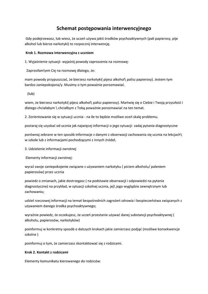Schemat postępowania interwencyjnego Gdy podejrzewasz, lub wiesz, że uczeo używa jakiś środków psychoaktywnych (pali papierosy, pije alkohol lub bierze narkotyki) to rozpocznij interwencję. Krok 1. Rozmowa interwencyjna z uczniem 1. Wyjaśnienie sytuacji- wyjaśnij powody zaproszenia na rozmowę: Zaprosiłam\em Cię na rozmowę dlatego, że: mam powody przypuszczad, że bierzesz narkotyki( pijesz alkohol\ palisz papierosy). Jestem tym bardzo zaniepokojona/y. Musimy o tym poważnie porozmawiad. (lub) wiem, że bierzesz narkotyki( pijesz alkohol\ palisz papierosy). Martwię się o Ciebie i Twoją przyszłośd i dlatego chciałabym \ chciałbym z Tobą poważnie porozmawiad na ten temat. 2. Zorientowanie się w sytuacji ucznia - na ile to będzie możliwe oceo skalę problemu. postaraj się uzyskad od ucznia jak najwięcej informacji o jego sytuacji- zadaj pytania diagnostyczne porównaj zebrane w ten sposób informacje z danymi z obserwacji zachowania się ucznia na lekcjach\ w szkole lub z informacjami pochodzącymi z innych źródeł, 3. Udzielenie informacji zwrotnej Elementy informacji zwrotnej: wyraź swoje zaniepokojenie związane z używaniem narkotyku ( piciem alkoholu/ paleniem papierosów) przez ucznia powiedz o zmianach, jakie dostrzegasz ( na podstawie obserwacji i odpowiedzi na pytania diagnostyczne) na przykład, w sytuacji szkolnej ucznia, jej\ jego wyglądzie zewnętrznym lub zachowaniu; udziel rzeczowej informacji na temat bezpośrednich zagrożeo zdrowia i bezpieczeostwa związanych z używaniem danego środka psychoaktywnego; wyraźnie powiedz, że oczekujesz, że uczeo przestanie używad danej substancji psychoaktywnej ( alkoholu, papierosów, narkotyków) poinformuj w konkretny sposób o dalszych krokach jakie zamierzasz podjąd (możliwe konsekwencje szkolne ) poinformuj o tym, że zamierzasz skontaktowad się z rodzicami. Krok 2. Kontakt z rodzicami Elementy komunikatu kierowanego do rodziców: informacja o tym, dlaczego zainteresowałaś\ łeś się ich dzieckiem; wymiana informacji o stanie dziecka (pomocy jest „Test dla rodziców”); informacja o zagrożeniach zdrowia i bezpieczeostwa dziecka, związanych z dalszym używaniem danego środka psychoaktywnego; ustalenie dalszego postępowania, którego efektem będzie wspólne sformułowanie propozycji kontaktu dla dziecka: celu lub celów, jakie sobie stawiacie (np. ma więcej nie pid), przywilejów jakie traci dziecko w związku z tym, że piło alkohol, paliło papierosy lub brało narkotyki( np. w domu- nie może spotykad się z kolegami po lekcjach i ma wracad prosto do domu; w szkole- nie bierze udziału w dodatkowych zajęciach np. sportowych i \ lub w wycieczkach szkolnych) listy zachowao, które będą podlegały kontroli w domu i w szkole( np. w domu: pory powrotu do domu, czas spędzany z rówieśnikami w szkole- obecnośd na lekcjach, spóźnienia), jasnych zasad zachowania, których dziecko ma przestrzegad(np. w domu-` nie robi awantur, nie wychodzi bez poinformowania rodziców gdzie i z kim będzie, wraca o ustalonej godzinie; w szkolenie opuszcza lekcji, wykonuje polecenia nauczycieli) konsekwencji ponoszonych przez dziecko w przypadku złamania ustalonych zasad ( np. w domuograniczenie możliwości telefonowania do znajomych, dostępu do komputera;w szkole- wykonanie dodatkowej pracy z biologii), przywilejów jakie odzyska postępując zgodnie z zasadami *przez czas określony( np. w domu- po dwóch tygodniach odzyskuje możliwośd chodzenia po szkole do kolegi; w szkole- po miesiącu może ponownie uczestniczyd w zajęciach sportowych, brad udział w wycieczkach, form współpracy rodziców i szkoły ( np. rodzice uprzedzają wychowawcę kiedy dziecko nie będzie w szkole, wychowawca, jak najszybciej, informuje rodziców o nieobecności dziecka w szkole), czasu na jaki obowiązują powyższe ustalenia ( np. do pierwszej wizyty dziecka trybu ich weryfikacji ( np. raz w tygodniu rozmawiamy o tym, jak nam idzie), u specjalisty) i przekazanie wskazówek i adresów punktów konsultacyjnych. Krok 3. Zawarcie kontraktu z uczniem Schemat kontraktu, który rodzice i przedstawiciel szkoły( zgodnie z tym, co ustalili zaproponowad uczniowi: w kroku 2) mogą Zobowiązuje się...( nie pid, nie palid, itp.) Zobowiązuje się przestrzegad następujących zasad zachowania… W związku z tym, że…( że piłem\am alkohol, paliłem \ am papierosy itp.) na okres…..( np. miesiąca) tracę następujące przywileje…lub Przyjmuję do wiadomości, że zostaną odebrane mi następujące przywileje……. Zgadzam się, że jeśli w ciągu…będę przestrzegad powyższych zasad to uzyskam następujące przywileje… Zgadzam się, że za złamanie którejś z zasad poniosę następujące konsekwencje… Zgadzam się, że jeśli nie będę przestrzegad tego kontraktu to poniosę surowe konsekwencje (wpisad jakie) niż te, które są zapisane powyżej oraz zobowiązuje się do skorzystania z pomocy terapeutycznej ( wpisad jakiej w zależności oceny powagi problemu oraz realnych możliwości zorganizowania dziecku takich form pomocy ) Schemat działao interwencyjnych W celu o kreślenia warunków w szkole zapewniających uczniom bezpieczeostwo, ochronę przed przemocą, uzależnieniami, demoralizacją oraz innymi przejawami patologii społecznej ustala się co następuje: Rodzice ucznia są bezzwłocznie zawiadamiani o każdym przypadku naruszenia przez niego obowiązujących w szkole zasad. W przypadku zagrożenia zdrowia ucznia np. w związku z używaniem przez niego narkotyków lub piciem alkoholu, szkoła zapewnia mu niezbędną opiekę medyczną (np.wzywane jest pogotowie). Policja jest wzywana w przypadku znalezienia na terenie szkoły nielegalnych substancji psychoaktywnych, gdy istnieje podejrzenie, że uczeo może posiadad nielegalne substancje psychoaktywne, gdy zachowania ucznia zagrażają bezpieczeostwu innych osób, kradzieży lub innych wykroczeo. W przypadku stwierdzenia lub podejrzenia, że uczeo