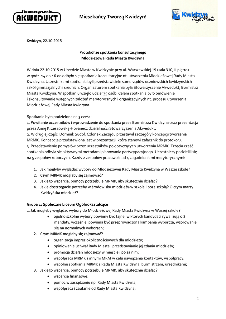Mieszkańcy Tworzą Kwidzyn! Kwidzyn, 22.10.2015 Protokół ze spotkania konsultacyjnego Młodzieżowa Rada Miasta Kwidzyna W dniu 22.10.2015 w Urzędzie Miasta w Kwidzynie przy ul. Warszawskiej 19 (sala 310, II piętro) w godz. 14.00-16.00 odbyło się spotkanie konsultacyjne nt. utworzenia Młodzieżowej Rady Miasta Kwidzyna. Uczestnikami spotkania byli przedstawiciele samorządów uczniowskich kwidzyńskich szkół gimnazjalnych i średnich. Organizatorem spotkania byli: Stowarzyszenie Akwedukt, Burmistrz Miasta Kwidzyna. W spotkaniu wzięło udział 35 osób. Celem spotkania było omówienie i skonsultowanie wstępnych założeń merytorycznych i organizacyjnych nt. procesu utworzenia Młodzieżowej Rady Miasta Kwidzyna. Spotkanie było podzielone na 3 części: 1. Powitanie uczestników i wprowadzenie do spotkania przez Burmistrza Kwidzyna oraz prezentacja przez Annę Krzeszowską-Hovanecz działalności Stowarzyszenia Akwedukt. 2. W drugiej części Dominik Sudoł, Członek Zarządu przestawił szczegóły koncepcji tworzenia MRMK. Koncepcja przedstawiona jest w prezentacji, która stanowi załącznik do protokołu. 3. Przedstawienie pomysłów przez uczestników po dotyczących utworzenia MRMK. Trzecia część spotkania odbyła się aktywnymi metodami planowania partycypacyjnego. Uczestniczy podzielili się na 5 zespołów roboczych. Każdy z zespołów pracował nad 4 zagadnieniami merytorycznymi: 1. 2. 3. 4. Jak mogłyby wyglądać wybory do Młodzieżowej Rady Miasta Kwidzyna w Waszej szkole? Czym MRMK mogłaby się zajmować? Jakiego wsparcia, pomocy potrzebuje MRMK, aby skutecznie działać? Jakie dostrzegacie potrzeby w środowisku młodzieży-w szkole i poza szkolą? O czym marzy Kwidzyńska młodzież? Grupa 1: Społeczne Liceum Ogólnokształcące 1. Jak mogłyby wyglądać wybory do Młodzieżowej Rady Miasta Kwidzyna w Waszej szkole? ogólno szkolne wybory powinny być tajne, w których kandydaci rywalizują o 2 mandaty, wcześniej powinna być przeprowadzona kampania wyborcza, wzorowanie się na normalnych wyborach; 2. Czym MRMK mogłaby się zajmować? organizacja imprez okolicznościowych dla młodzieży; opiniowanie uchwał Rady Miasta i przedstawianie jej zdania młodzieży; promocja działań młodzieży w mieście i po za nim; współpraca MRMK z innymi MRM w celu nawiązania kontaktów, współpracy; wspólne spotkania MRMK z Radą Miasta Kwidzyna, burmistrzem, urzędnikami; 3. Jakiego wsparcia, pomocy potrzebuje MRMK, aby skutecznie działać? wsparcie finansowe; pomoc w zarządzaniu np. Rady Miasta Kwidzyna; współpraca i zaufanie od Rady Miasta Kwidzyna; 1 Mieszkańcy Tworzą Kwidzyn! wsparcie z Kwidzyńskiego Centrum Kultury, Kwidzyńskiego Centrum Młodzieży; 4. Jakie dostrzegacie potrzeby w środowisku młodzieży-w szkole i poza szkolą? O czym marzy Kwidzyńska młodzież? większa ilość wydarzeń kulturalnych; większe możliwości do rozwijania swoich zainteresowań; większa dostępność informacyjna na temat wydarzeń; miejsce do spotkań i pracy twórczej; Grupa 2: I Liceum Ogólnokształcące i II Liceum Ogólnokształcące 1. Jak mogłyby wyglądać wybory do Młodzieżowej Rady Miasta Kwidzyna w Waszej szkole? kampania + wybory na wzór wyborów prezydenckich; 2. Czym MRMK mogłaby się zajmować? wstępne tworzenie uchwał i opiniowanie uchwał; organizowanie eventów; wymiana dobrych doświadczeń, poglądów na forum młodzieży; 3. Jakiego wsparcia, pomocy potrzebuje, MRMK ·aby skutecznie działać? patronat rady miasta; ankiety w szkołach nt. potrzeb w środowisku młodzieżowym; 4. Jakie dostrzegacie potrzeby w środowisku młodzieży- w szkole i poza szkolą? O czym marzy Kwidzyńska młodzież? miejsce do grania na instrumentach; współpraca młodzieży z innymi szkołami; otwartość szkół na potrzeby intelektualne; rozwój i zakup nowych pomocy dydaktycznych; Grupa 3: Gimnazjum nr 3 i Zespół Szkół Specjalnych 1. Jak mogłyby wyglądać wybory do Młodzieżowej Rady Miasta Kwidzyna w Waszej szkole? osoby kandydujące do MRMK powinny działać w samorządzie szkolnym; 5 kandydatów z samorządu szkolnego; wszyscy uczniowie mogą głosować na max 2 osoby; osoba, która uzyskała największą ilość głosów jest przedstawicielem danej szkoły; 2. Czym MRMK mogłaby się zajmować? poprzez wszystkie komunikacje społecznościom, pomysły powinny napływać od każdego młodego człowieka z Kwidzyna; życiem kulturalnym według pomysłu młodych ludzi; pomaganie ludziom, wspieranie wszystkich form charytatywnych; możliwość integrowania się w środowisku lokalnym, między szkołami; możliwość spotkania się z obcokrajowcami, którzy mieszkają w Polsce; 3. Jakiego wsparcia, pomocy potrzebuje MRMK, aby skutecznie działać? … 4. Jakie dostrzegacie potrzeby w środowisku młodzieży- w szkole i poza szkolą? O czym marzy Kwidzyńska młodzież? miejsce spotkań do twórczych i integracyjnych spotkań młodzieży; 2 Mieszkańcy Tworzą Kwidzyn! większe nakłady finansowe na ludzi trenujących sport; Grupa 4: Centrum Kształcenia Zawodowego i Ustawicznego i Zespół Szkół Ponadgimnazjalnych nr 1 1. Jak mogłyby wyglądać wybory do Młodzieżowej Rady Miasta Kwidzyna w Waszej szkole? wybory odbywają się na auli; komisja min.3 osoby + przewodniczący np.: nauczyciel; obowiązkowa obecność wszystkich uczniów na wyborach; 2. Czym MRMK mogłaby się zajmować? wolontariat; pomoc starszym ludziom; więcej imprez masowych, współpraca przy wydarzeniach kulturalnych; warsztaty dla osób, młodzieży niepełnosprawnej; 2. Jakiego wsparcia, pomocy potrzebuje MRMK, aby skutecznie działać? pieniądze na rozwój i działalność rady i pomysłów młodzieży; wsparcie osób z doświadczeniem; bardzo dobry marketing Młodzieżowej Rady Miasta (facebook, szkoły- plakaty, ulotki, koszulki, torby eko, kubki, itp.); 3. Jakie dostrzegacie potrzeby w środowisku młodzieży- w szkole i poza szkolą? O czym marzy Kwidzyńska mł