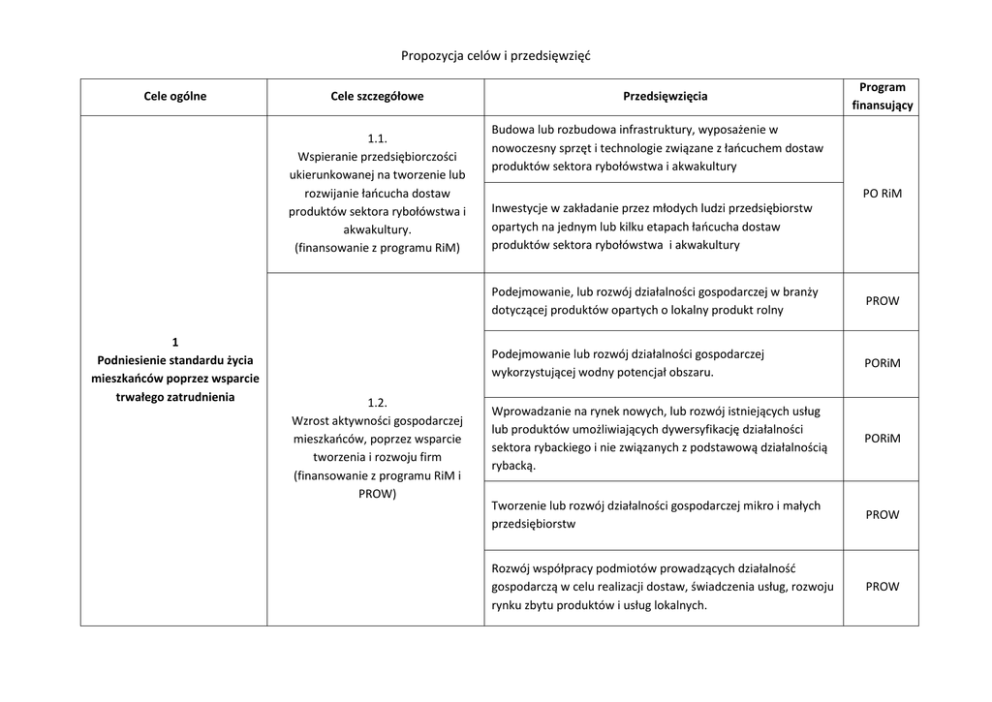 Propozycja celów i przedsięwzięć Cele ogólne Cele szczegółowe 1.1. Wspieranie przedsiębiorczości ukierunkowanej na tworzenie lub rozwijanie łańcucha dostaw produktów sektora rybołówstwa i akwakultury. (finansowanie z programu RiM) 1 Podniesienie standardu życia mieszkańców poprzez wsparcie trwałego zatrudnienia 1.2. Wzrost aktywności gospodarczej mieszkańców, poprzez wsparcie tworzenia i rozwoju firm (finansowanie z programu RiM i PROW) Przedsięwzięcia Program finansujący Budowa lub rozbudowa infrastruktury, wyposażenie w nowoczesny sprzęt i technologie związane z łańcuchem dostaw produktów sektora rybołówstwa i akwakultury PO RiM Inwestycje w zakładanie przez młodych ludzi przedsiębiorstw opartych na jednym lub kilku etapach łańcucha dostaw produktów sektora rybołówstwa i akwakultury Podejmowanie, lub rozwój działalności gospodarczej w branży dotyczącej produktów opartych o lokalny produkt rolny PROW Podejmowanie lub rozwój działalności gospodarczej wykorzystującej wodny potencjał obszaru. PORiM Wprowadzanie na rynek nowych, lub rozwój istniejących usług lub produktów umożliwiających dywersyfikację działalności sektora rybackiego i nie związanych z podstawową działalnością rybacką. PORiM Tworzenie lub rozwój działalności gospodarczej mikro i małych przedsiębiorstw PROW Rozwój współpracy podmiotów prowadzących działalność gospodarczą w celu realizacji dostaw, świadczenia usług, rozwoju rynku zbytu produktów i usług lokalnych. PROW renaturyzacja zbiorników wodnych i terenów przyległych zniszczonych w wyniku eutrofizacji 2.1. Zrównoważony rozwój gospodarki rybackiej. (finansowanie z programu RiM) 2 Ochrona zasobów naturalnych i utrzymanie atrakcyjności oraz różnorodności przyrodniczej obszaru 2.2. Wzmocnienie kapitału społecznego poprzez podniesienie świadomości ekologicznej i zwiększenie wiedzy działania polegające na walce z kłusownictwem w celu zachowania i zabezpieczenia różnorodności biologicznej PO RiM działania mające na celu przywracanie lub zabezpieczanie potencjału produkcyjnego sektora rybactwa, lub odtwarzanie pierwotnego stanu środowiska w przypadku szkody spowodowanej działalnością chronionych gatunków zwierząt inicjatywy przyczyniające się do nabycia przez mieszkańców wiedzy o środowisku i zwiększenia ich świadomości ekologicznej, np. szkolenia, warsztaty, pokazy, konkursy, doświadczenia, seminaria, wyprawy badawcze, itp. prowadzenie badań naukowych jakości środowiska na obszarze LGD i przekazywanie wyników społeczeństwu mieszkańców i turystów. (finansowanie z programu PROW) działania edukacyjne w zakresie wiedzy o zmianach klimatycznych, połączone z doradztwem w zakresie przygotowania wniosków o dofinansowanie na zastosowanie odnawialnych źródeł energii w działalności mikro i małych przedsiębiorstw PROW 3.1. Rozwój infrastruktury drogowej lokalnej (finansowanie z programu PROW) Budowa lub przebudowa dróg gminnych/powiatowych w celu połączenia obiektów użyteczności publicznej z siecią dróg publicznych lub w celu skrócenia dystansu/czasu dotarcia do tych obiektów PROW doradztwo i szkolenia dla mieszkańców zwiększające ich kompetencje w zakresie podejmowania, prowadzenia i rozwoju działalności gospodarczej PROW 3 Poprawa konkurencyjności obszaru jako miejsca wypoczynku, prowadzenia działalności gospodarczej i zamieszkania wsparcie podejmowanych działań wspólnych dla tworzenia, rozwoju i promocji atrakcji turystycznych i innych lokalnych produktów i usług w ramach partnerstw terytorialnych lub branżowych 3.2. Pobudzenie aktywności gospodarczej, społecznej i kulturalnej mieszkańców (finansowanie z programu PROW i RiM) promowanie zachowania i upowszechniania dziedzictwa lokalnego, np. poprzez tworzenie wiosek tematycznych, odtwarzanie ginących zawodów, organizację wydarzeń promocyjnych, edukacyjnych, sportowo-rekreacyjnych regionalnych i lokalnych PROW działania edukacyjne, promocyjne, informacyjne przyczyniające się do zachowania, lub upowszechniania rybackiego dziedzictwa kulturowego, w tym rybackich kulinariów PO RiM podniesienie wiedzy i umiejętności osób z sektora rybackiego, wymiana doświadczeń i dobrych praktyk PO RiM 3.3. Rozwój infrastruktury służącej zaspokajaniu potrzeb społeczności lokalnej i turystów (finansowanie z programu PROW i RiM) organizacja ogólnodostępnych miejsc tradycji i historii rybackiej, oraz wspieranie rewitalizacji istniejącej ogólnodostępnej infrastruktury w tym zakresie PO RiM budowa, przebudowa ogólnodostępnej (niekomercyjnej) infrastruktury turystycznej, rekreacyjnej, kulturalnej np. przystanie, porty, zewnętrzne siłownie, place zabaw, ścieżki rowerowe (piesze, konne, narciarskie), muzea, ośrodki kultury, amfiteatry, świetlice, grillownie, wiaty, itp. PROW inwestycje w ogólnodostępną infrastrukturę turystyczną i rekreacyjną historycznie lub terytorialnie związaną z działalnością rybacką PO RiM