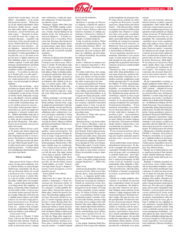nr 211 - WRZESIEŃ 2014 słychać było wesołe głosy. Ach, jak dobrze – pomyślałem – że nie muszę dziś pomywać naczyń… Wybaczcie mi, że tak właśnie pomyślałem. Jakoś tak leniwie i słodko. Jeszcze – pamiętam takie jedno zdanie, zupełnie bez kontekstu: „nicość bezbrzeżna, jak moja wanna…” Staruszek na chmurze zrobił do mnie oko i nagle, nie wiadomo dlaczego… wypuścił z rąk instrument, który począł spadać do morza. Próbowałem biec po falach, aby uratować cenne skrzypce… ale nie zdążyłem… staruszek jeszcze kilkakrotnie porozumiewawczo mrugał powiekami i w końcu pomyślałem, że ma jakiś tik, czy co. Że może to nie jest ten facet i z daleka właściwie nie było dokładnie widać, że to skrzypce właśnie wypuścił. A może tylko jakaś formacja cumulonimbusów przybrała niezwykłą konfigurację. J e s z c z e… myślałem szybko o przykładach z literatury: ...”wszystkim się zdawało, że to Wojski grał, a to echo grało”... Skąd taki pomysł nagły, może poryw wiatru przytoczył na wieczór armaty i czas już przystąpić do jakiegoś działania… Zawołano mnie na kolację… ale ja już byłem po drugiej stronie snu. Może powoli stygłem, a może tylko sobie wyobrażałem, że tak ma być. Pewnie za chwilę wstanę. Jedną rękę wyciągnę na całą długość i chwycę spadający instrument, aby jeszcze przed wieczorem zrobić coś pożytecznego, skoro nie miałem pomywać naczyń… Chwyciłem ostatni promień słońca i uratowałem go, przed niewątpliwym utonięciem w zimnych wodach zatoki… Miałem zbyt krótkie ramię, aby za jednym zamachem uratować skrzypce, które, jak już wspomniałem... mogły nie być skrzypcami... Tak sądzę... że przy życiu trzymały mnie jeszcze różne obowiązki. Koniecznie odebrać dywan z pralni. W garażu pod oknem dojrzewają gruszki… koniecznie przynieść do kuchni. Dopompować koła w rowerze i jeszcze obowiązkowo zamknąć drzwi na noc… Dlaczego ten pies tak żałośnie wyje? Może mu pan umarł? A może tylko stracił węch w tej mgle. Dziki podeszły pod dom… Czyżby to jakąś nową konfigurację stratocumulusów… przywiało znad zatoki... Dziwny wernisaż Mam prawie 66 lat. Jestem o 60 lat starszy od tego pierwszoklasisty, który siedział skulony na tylnej kanapie służbowego samochodu, tak aby go nikt nie dostrzegł. Który nie zszedł z pawlacza na czas i wszyscy myśleli, że jest już dawno w szkole. Który to już raz uciekł z kolonii letnich, aby pójść wzdłuż torów do rozstajów dróg… a potem tylko przejść po kładce na drugą stronę. Bez wątpienia – tę lepszą, wymarzoną. Gdzie rozpościera się niezwykły widok. A więc po prawej stronie można zauważyć niewielką wysepkę. Moją. Być może leży ona w zupełnie innym miejscu, a ten widok roztacza się wewnątrz mojej głowy, kiedy przymykam oczy. Kwadrans przed zanurzeniem w pierwszy, niewinny sen… poraża wzrok szczególnie krwisty zachód słońca. Moja wyspa mieści się właśnie w tych okolicach. A teraz mam 14 lat. Jestem znowu w Clamart. U babci Luizy. Całe trzy dni. Ktoś mnie przywiózł, ktoś mnie odwiezie. Trzeba się nagadać za wszystkie czasy. Babcia myśli, że jestem już starszy i częstuje mnie wiśniówką, z małej jak naparstek szklaneczki. To była moja pierwsza nalewka z życiu. Dordogne. Daglan 1960. Obóz letni harcerzy z 69 WDH, wspólnie z dziećmi z St. Denis. Chodzę na długie spacery z Josette, chociaż bardziej mi się podoba Aicha. Ale Aicha patrzy na starszych chłopców… Z Josette wymieniamy listy o wszystkim. Przez cztery lata. Pewnego dnia Josette jest zaręczona. Kolejne fotografie ukazują narzeczonego, męża, dzieci. Josette staje się matką, babcią. Jej życie jest takie samo jak wszystkich sąsiadek na piętrze... Mam 16 lat. Jedziemy do Różan koło Ostrołęki na rowerach, z Jankiem i z Danielem. Czekają na nas dziewczyny. Mieszkamy w stodole. W dole płynie rzeka Narew. Na rzece młyn ze starym kołem. Zabytek. Nic nie działa. Łopatki koła turkocą. Moja wyobraźnia podsuwa tragiczne zakończenie. Ktoś wpadnie do wody. Naturalnie - ja skoczę za nim i uratuję. Sam zginę (jak przystało na bohatera), albo właśnie ja się uratuję, a to tamten zginie. Albo – obaj zginiemy. Gdy tak idę po wale rzeki… nagle odwracam głowę. Deja vu. Widzę mój scenariusz tragiczny i stoję, jak wryty. Moje nogi nie mogą zrobić kroku. Obrazy przelatują z zawrotną prędkością. Raz do przodu, raz do tyłu. Kiedy próbuję wykonać krok, czuję, że padam bez przytomności. I tak leżę. Robi się chłodny wieczór nad Narwią, łopatki koła turkocą. Zwlekam moje schłodzone ciało z mokrej trawy i powoli, jak ślepiec odchodzę w stronę dworu, gdzie wszyscy już na mnie czekają. Małgorzata z Danielem jutro wracają do miasta. Migocze poblask płomieni pod kuchenką. Nalewam sobie wody z czajnika. Jestem ciągle zbyt słaby po moim upadku i utracie przytomności. Nie mogę utrzymać naczynia. Wrzątek oblewa mi stopę. Czuję potworny ból. Ewa przemywa mi nogę chłodną wodą. Robi się wielki bąbel na nodze. Jestem przegrany. Muszę tu być, w Różanie, dopóki noga nie wydobrzeje. Ewa zostaje jeszcze tydzień, tylko ze mną. Jest to cudowny czas. Ktoś coś robi dla mnie. Piję zupki, chodzę z bosą stopą na spacery wokół dworku i nad rzekę. Snujemy plany. Noszę Ewę „na barana”. Śmiejemy się bez powodu. Za chwilę będzie matura i każdy pójdzie „na swoje”. Tymczasem noga mieści się już w skarpecie i można wrócić pociągiem, a rower pojedzie pocztą. Jestem jednak coraz słabszy. Mam 17 lat. Opuszczam się w nauce. Nic nie rozumiem z matematyki i z fizyki. Powtarzam rok. Zmieniam szkołę. To przecież tylko inny numer. Tam było 42, a tutaj jest 7. Ludzie podobni. Korytarze także. Nauczyciele mają podobne głosy. Jestem bez przerwy oceniany. Nie potrzebuję ciągłego porównywania. 