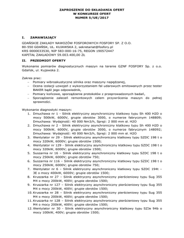 ZAPROSZENIE DO SKŁADANIA OFERT W KONKURSIE OFERT NUMER 5/UE/2017 I. ZAMAWIAJĄCY GDAŃSKIE ZAKŁADY NAWOZÓW FOSFOROWYCH FOSFORY SP. Z O.O. 80-550 GDAŃSK, UL. KUJAWSKA 2, [email protected] KRS 0000033530, NIP 583-000-16-75, REGON 190572447 KAPITAŁ ZAKŁADOWY 59.003.400,00 ZŁ II. PRZEDMIOT OFERTY Wykonanie pomiarów diagnostycznych maszyn na terenie GZNF FOSFORY Sp. z o.o. Gdańsk, ul. Kujawska 2. Zakres prac: Pomiary wibroakustyczne silnika oraz maszyny napędzanej, Ocena izolacji uzwojeń z wykorzystaniem fal udarowych emitowanych przez tester BAKER bądź jego odpowiednik, Pomiary końcowe, sporządzenie protokołów z przeprowadzonych badań, Sporządzenie zaleceń remontowych celem przywrócenia maszyn do pełnej sprawności. Wykonanie diagnostyki maszyn: 1. Dmuchawa nr 1 - Silnik elektryczny asynchroniczny klatkowy typu Sh 400 H2D o mocy 500kW, 6000V, grupie obrotów 3000, o numerze fabrycznym 148809; Dmuchawa: Wydajność: 40 000 Nm3/h, Spręż: 2 000 mm sł. H2O 2. Dmuchawa nr 2 - Silnik elektryczny asynchroniczny klatkowy typu Sh 400 H2D o mocy 500kW, 6000V, grupie obrotów 3000, o numerze fabrycznym 148092; Dmuchawa: Wydajność: 40 000 Nm3/h, Spręż: 2 000 mm sł. H2O 3. Wentylator nr 29 - Silnik elektryczny asynchroniczny klatkowy typu SZDC 198 t o mocy 320kW, 6000V; grupie obrotów 1500; 4. Wentylator nr 129 - Silnik elektryczny asynchroniczny klatkowy typu SZDC 198 t o mocy 320kW, 6000V; grupie obrotów 1500; 5. Suszarnia nr 16 – Silnik elektryczny asynchroniczny klatkowy typu SZDC 198 t o mocy 250kW, 6000V; grupie obrotów 750; 6. Suszarnia nr 116 – Silnik elektryczny asynchroniczny klatkowy typu SZDC 198 t o mocy 250kW, 6000V; grupie obrotów 750; 7. Wentylator nr 6 – Silnik elektryczny asynchroniczny klatkowy typu SZDC 194t – 3E o mocy 400kW, 6000V; grupie obrotów 1500; 8. Kruszarka nr 27 – Silnik elektryczny asynchroniczny pierścieniowy typu Sug 355 M4 o mocy 200kW, 400V; grupie obrotów 1500; 9. Kruszarka nr 127 – Silnik elektryczny asynchroniczny pierścieniowy typu Sug 355 M4 o mocy 200kW, 400V; grupie obrotów 1500; 10. Kruszarka nr 28 – Silnik elektryczny asynchroniczny pierścieniowy typu Sug 355 M4 o mocy 200kW, 400V; grupie obrotów 1500; 11. Kruszarka nr 128 – Silnik elektryczny asynchroniczny pierścieniowy typu Sug 355 M4 o mocy 200kW, 400V; grupie obrotów 1500; 12. Wentylator nr 30 - Silnik elektryczny asynchroniczny klatkowy typu SZJe 94b o mocy 100kW, 400V; grupie obrotów 1500; 13. Wentylator nr 130 - Silnik elektryczny asynchroniczny klatkowy typu SZJe 94b o mocy 100kW, 400V; grupie obrotów 1500; Uwagi: 1. Wszystkie materiały oraz sprzęt potrzebny do wykonania zakresu prac zapewnia Wykonawca. 2. Wykonawca musi posiadać niezbędną wiedzę, doświadczenie oraz dysponować potencjałem technicznym i kadrą techniczną z niezbędnymi uprawnieniami do wykonania ww. zakresu prac. 3. Dokumentację pomiarową należy wykonać w trzech egzemplarzach w wersji papierowej oraz w formie elektronicznej na płycie CD, tj. w formacie PDF. 4. Celem złożenia prawidłowej oferty konieczna jest wizja lokalna na obiekcie. 5. Maszyny w bieżącej eksploatacji, pomiary należy przeprowadzić nie zakłócając ciągłości pracy produkcji. III. INFORMACJE DOTYCZĄCE TERMINU I MIEJSCA SKŁADANIA OFERT Ofertę należy złożyć w zamkniętej kopercie w Kancelarii GZNF „FOSFORY” Sp. z o.o. 80-550 Gdańsk ul. Kujawska 2, budynek biurowca II piętro z dopiskiem " Wykonanie pomiarów diagnostycznych maszyn. Konkurs ofert nr 5/UE/2017". Osobą uprawnioną do kontaktów z oferentami branży elektrycznej Pan Michał Sziming tel. /58/ 34 38 418 lub kom. 669 600 606 oraz branży mechanicznej Pan Jarosław Malinowski tel. /58/ 34 38 315 lub kom. 669 600 415. Termin składania ofert upływa w dniu 15.02.2017 r. Za datę terminowego doręczenia oferty uważa się datę zarejestrowania oferty w Kancelarii GZNF „FOSFORY” Sp. z o.o. Oferty, które wpłyną po tym terminie nie będą rozpatrywane. IV. KRYTERIA OCENY SPEŁNIENIA DOSTAWCÓW/WYKONAWCÓW L.p. 1. 2. 3. 4. V. Kryteria Cena Czas realizacji Referencje Wiarygodność w ocenie członków Komisji WYMAGANYCH OD Znaczenie 70% 10% 10% 10% OFERTA POWINNA ZAWIERAĆ VI. WARUNKÓW Szczegółowy zakres prac. Szczegółowe zestawienie materiałów. Termin wykonania prac. Warunki płatności. Warunki gwarancyjne. Informację o kwalifikacjach posiadanej kadry technicznej. Referencje lub informacje o wykonanych pracach podobnego typu. WYMAGANE ZAŁĄCZNIKI Kserokopia dokumentu rejestrowego oferenta. Kserokopia numeru NIP, REGON. Dokumenty pozwalające ocenić wiarygodność techniczną i ekonomiczną oferenta (np. kadra techniczna, sprzęt itp.). Oświadczenie o sytuacji finansowej zapewniającej wykonanie zamówienia. Oświadczenie o braku wszczęcia w stosunku do oferenta postępowania upadłościowego lub układowego. Oświadczenie o nie zaleganiu z uiszczaniem podatków, opłat lub składek na ubezpieczenia społeczne. VII. UWAGI KOŃCOWE Wszystkie dokumenty ofertowe muszą być podpisane przez osoby uprawnione do reprezentowania firmy. W przypadku zawarcia umowy deklarowane parametry rozliczeń nie będą podlegały zmianie przez cały jej okres działania. W przypadku wątpliwości lub koniecznych uzupełnień po otwarciu ofert zastrzega się prawo do przeprowadzenia rozmów uzupełniających i ewentualnych negocjacji lub do zamknięcia konkursu ofert bez dokonania wyboru którejkolwiek z ofert bez podania przyczyny.