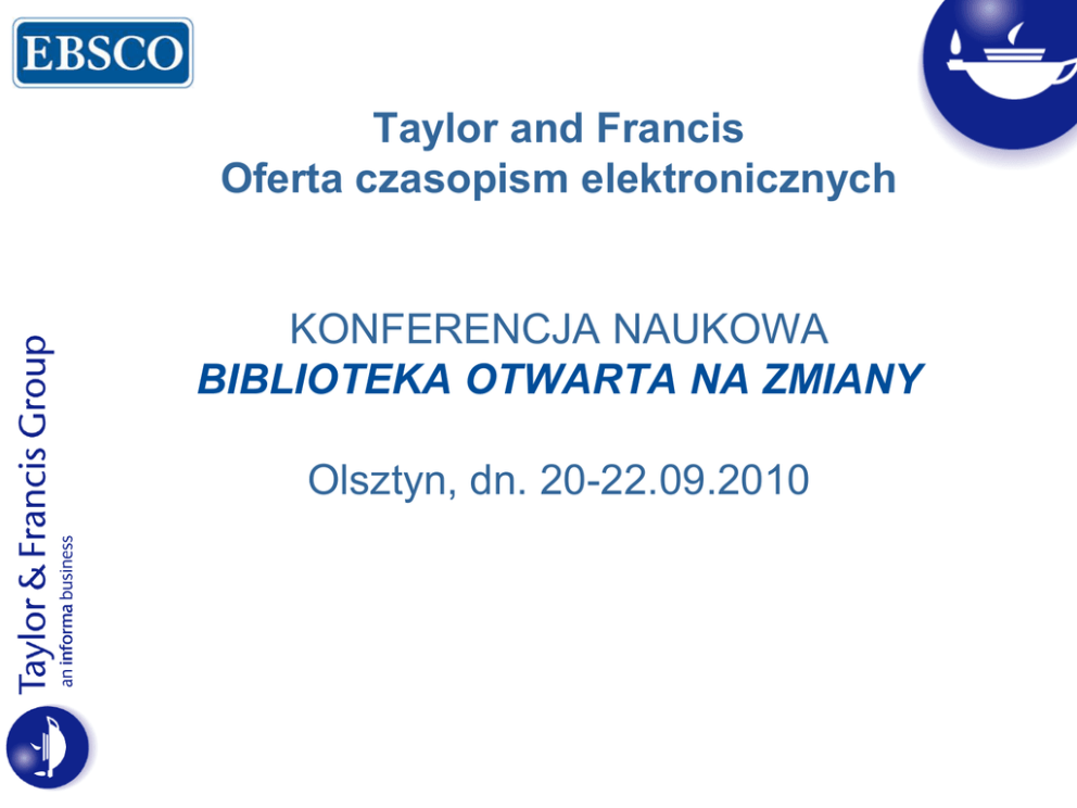 Taylor and Francis Oferta czasopism elektronicznych KONFERENCJA NAUKOWA BIBLIOTEKA OTWARTA NA ZMIANY Olsztyn, dn. 20-22.09.2010 Taylor and Francis • Założone w 1798 kiedy Richard Taylor wydał “Philosophical Magazine” • Wydawnictwo działa globalnie z głównymi biurami w Filadelfii oraz Oksfordzie oraz 20 biurami na całym świecie w tym w Singapurze, New Delhi, Melbourne i Pekinie • Grupa Taylor & Francis publikuje obecnie ponad 1,500 czasopism oraz ponad 3,000 nowych książek rocznie, co wraz z publikacjami z poprzednich lat daje ponad 20,000 specjalistycznych tytułów. • Grupa Taylor & Francis to własność Informy. Informa plc to globalny dostawca informacji dla środowisk akademickich, branżowych oraz biznesu. Publikacje Grupa Taylor and Francis rozwinęła się aby wydawać obecnie ponad 1,500 czasopism. Nasza firma rosła od wewnątrz jak również poprzez przejęcia innych wydawców. – – – – – – – – CRC Press Psychology Press Routledge Carfax Frank Cass Marcel Dekker Transaction Scandinavian University – PressGordon and Breach Publishing – Lawrence Erlbaum & Assoc.(LEA) – Haworth Press – Heldref Publications – UNISA press Taylor & Francis Online Library SSH (Nauki społeczne i humanistyczne) 997 tytułów S&T (Nauki ścisłe i technologia) 305 tytułów 1302 tytułów w 19 dziedzinach SSH&ST Całkowita wartość całej kolekcji w 2010 > 1.1 miliona EUR Dostęp od 1997 roku Nowe tytuły dostępne bezpłatnie (Voluminy I & II) Archiwa Online Dostępnych jest 19 kolekcji dziedzinowych Dostęp od woluminu 1, zeszyt 1 www.informaworld.com informaworld 2 od roku 2011… Informaworld Igenta Ebsco Database www.informaworld.com Cechy oraz opcje • • • • • • • Umieszczanie własnego logo RSS Feeds Zarządzanie kolekcją Tworzenie wyróżnionych list Statystyki zgodne z COUNTER Pobieranie cytowań Zarządzanie powiadomieniami do publikacji i artykułów Więcej informacji o ofercie Taylor & Francis, na stronie: www.tandf.co.uk/libsite/tandflibrary/ Elica Markovska Email: [email protected] A także przedstawiciel EBSCO Leszek Czerwinski [email protected] +48 61 855 45 90 +48 509 765 969