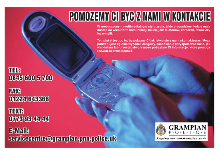 POMOZEMY CI BYC Z NAMI W KONTAKCIE W nowoczesnym multimedialnym stylu zycia, jakie prowadzimy, ludzie maja dostep do wielu form komunikacji takich, jak: telefonow, komorek, faxow czy tez e-meili. Ten plakat jest po to, by pokazac Ci jak latwo sie z nami skontaktowac. Moze potrzebujesz zglosic wypadek drogowy, zachowanie antyspoleczne takie, jak wandalizm lub przestepstwo a moze potrzebne Ci informacje, ktore pomoga rozwiazac przestepstwo. TEL: 0845 600 5 700 FAX: 01224 643366 TEXT: 0773 93 44 44 E-Mail: [email protected]