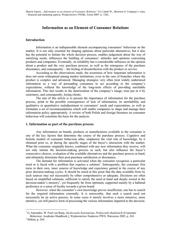 Marcin Gąsior, „Information as an element of Consumer Relations” [w:] Janik W., Skowron S. Company’s value – financial and marketing aspects, Wydawnictwo TNOiK, Toruń 2009 (s. 120); Information as an Element of Consumer Relations Introduction Information is an indispensable element accompanying consumers’ behaviour on the market. It is not only essential for shaping opinions about particular alternatives, but it also has the potential to initiate the whole decision process, enables judgement about the way of satisfying needs, influences the building of consumers’ attitudes and opinions concerning products and companies. Eventually, its reliability has a considerable influence on the opinion about a product and the very purchase process, as well as the emergence of the purchase dissonance, and consequently – the feeling of dissatisfaction with the product or service. According to the observations made, the awareness of how important information is does not seem widespread among market institutions, even in the case of branches where the product is complex and advanced. Managing strategies very often treat widely understood information as a way of persuading consumers to act according to the company’s expectations, without the knowledge of the long-term effects of providing unreliable information. This fact results in the deterioration of the company’s image, trust put in it by customers, and consequently, losing clients. The aim of this article is to present the importance of information for the purchase process, point to the possible consequences of lack of information, its unreliability and qualitative or quantitative maladjustment to consumers’ needs and expectations, as well as formulate a set of recommendations which will enable companies to shape and manage their information policy appropriately. A review of both Polish and foreign literature on consumer behaviour will constitute the basis for the analysis. 1. Information as part of the purchase process Any information on brands, products or manufacturers available to the consumer is one of the key factors that determine the course of the purchase process. Cognitive and holistic models of consumer behaviour alike, emphasize the vital role of knowledge, be it obtained prior to, or during the specific stages of the buyer’s interaction with the market. What the consumer originally knows, combined with any new information they receive, will not only initiate the decision-making process as such, but also influence the buyer’s consecutive choices, evaluation of the available alternatives and the purchase process at hand, and ultimately determine their post-purchase satisfaction or dissonance. The demand for information is activated when the consumer recognises a particular need or is faced with a problem that requires a solution1. Subsequently, the consumer first turns to their own, inner sources of knowledge and experience gained in the course of any prior decision-making cycles. It should be noted at this point that the data available from by such sources may not necessarily be either comprehensive or adequate. Decisions are often based on simplified solutions, sufficient to satisfy the need at hand and deeply rooted in the decision-maker’s memory2, yet frequently far from optimum, supported mainly by a habitual preference or a sense of loyalty towards a given brand. However, when the consumer’s own knowledge proves insufficient, one has to search for the required information externally. It is noteworthy, that such a search need not necessarily be an active process. In some cases it merely involves a more intensive, more attentive, yet still passive form of processing the various information imparted to the decision- 1 G. Antonides, W. Fred van Raaij, Zachowanie konsumenta. Podręcznik Akademicki [Consumer Behaviour. Academic Handbook.], Wydawnictwo Naukowe PWN, Warszawa 2003, p. 263. 2 Ibidem, p. 264. Marcin Gąsior, „Information as an element of Consumer Relations” [w:] Janik W., Skowron S. Company’s value – financial and marketing aspects, Wydawnictwo TNOiK, Toruń 2009 (s. 120); maker3. In particular, such passive reception may often take on an entirely involuntary form, quite unrelated to the specific decision-making processes, when the consumer acquires information somewhat “inadvertently” rather than being motivated by any actual needs4. As defined in literature, there are four main groups of sources from which a consumer may potentially obtain required information. These include5 personal sources (such as family members, friends, acquaintances), commercial sources (advertisements, manufacturer or vendor run websites, shop-assistants, labels), public sources (mass media, consumer organisations providing information on products and their quality), as well as practical sources mostly related to direct contacts with particular products, physical examination, testing or exploitation. Pertaining to the above, the particular significance of personal sources of information ought to be noted6. Their value for the consumer stems from, among other factors, our innate inclination towards exchange of information and establishing interpersonal relations, as well as our belief that the act of having a conversation can offset and minimise the risks and uncertainties experienced during a purchase process, just as it can abate our general anxiety or unease7. On the one hand, such sources are undoubtedly the most effective8, on the other, from the consumer’s standpoint, they also guarantee a high level of credibility due to, among other factors9: • the interlocutor’s lack of vested interest in providing information on the given product – which encourages the sense of impartiality, as the opinions voiced are not aimed at encouraging or discouraging the consumer from making a particular choice; the same has been confirmed by research showing that when selecting the most reliable source, we tend to op