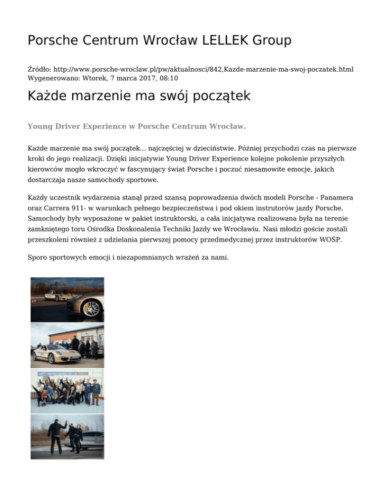 Porsche Centrum Wrocław LELLEK Group Źródło: http://www.porsche-wroclaw.pl/pw/aktualnosci/842,Kazde-marzenie-ma-swoj-poczatek.html Wygenerowano: Wtorek, 7 marca 2017, 08:10 Każde marzenie ma swój początek Young Driver Experience w Porsche Centrum Wrocław. Każde marzenie ma swój początek... najczęściej w dzieciństwie. Póżniej przychodzi czas na pierwsze kroki do jego realizacji. Dzięki inicjatywie Young Driver Experience kolejne pokolenie przyszłych kierowców mogło wkroczyć w fascynujący świat Porsche i poczuć niesamowite emocje, jakich dostarczaja nasze samochody sportowe. Każdy uczestnik wydarzenia stanął przed szansą poprowadzenia dwóch modeli Porsche - Panamera oraz Carrera 911- w warunkach pełnego bezpieczeństwa i pod okiem instrutorów jazdy Porsche. Samochody były wyposażone w pakiet instruktorski, a cała inicjatywa realizowana była na terenie zamkniętego toru Ośrodka Doskonalenia Techniki Jazdy we Wrocławiu. Nasi młodzi goście zostali przeszkoleni również z udzielania pierwszej pomocy przedmedycznej przez instruktorów WOŚP. Sporo sportowych emocji i niezapomnianych wrażeń za nami. Tweetnij