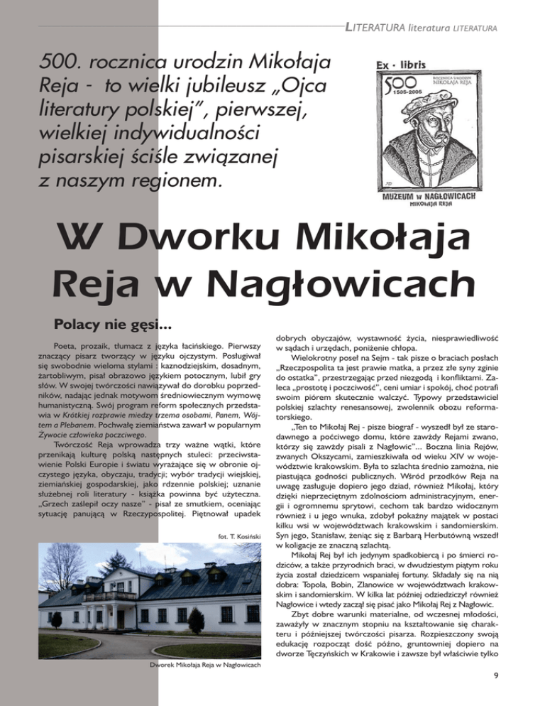–––––––––––––––––––––––––––––––––––––––––––––––––––––––––––––––––––– LITERATURA literatura LITERATURA 500. rocznica urodzin Mikołaja Reja - to wielki jubileusz „Ojca literatury polskiej”, pierwszej, wielkiej indywidualności pisarskiej ściśle związanej z naszym regionem. W Dworku Mikołaja Reja w Nagłowicach Polacy nie gęsi... Poeta, prozaik, tłumacz z języka łacińskiego. Pierwszy znaczący pisarz tworzący w języku ojczystym. Posługiwał się swobodnie wieloma stylami : kaznodziejskim, dosadnym, żartobliwym, pisał obrazowo językiem potocznym, lubił gry słów. W swojej twórczości nawiązywał do dorobku poprzedników, nadając jednak motywom średniowiecznym wymowę humanistyczną. Swój program reform społecznych przedstawia w Krótkiej rozprawie miedzy trzema osobami, Panem, Wójtem a Plebanem. Pochwałę ziemiaństwa zawarł w popularnym Żywocie człowieka poczciwego. Twórczość Reja wprowadza trzy ważne wątki, które przenikają kulturę polską następnych stuleci: przeciwstawienie Polski Europie i światu wyrażające się w obronie ojczystego języka, obyczaju, tradycji; wybór tradycji wiejskiej, ziemiańskiej gospodarskiej, jako rdzennie polskiej; uznanie służebnej roli literatury - książka powinna być użyteczna. „Grzech zaślepił oczy nasze” - pisał ze smutkiem, oceniając sytuację panującą w Rzeczypospolitej. Piętnował upadek fot. T. Kosiński dobrych obyczajów, wystawność życia, niesprawiedliwość w sądach i urzędach, poniżenie chłopa. Wielokrotny poseł na Sejm - tak pisze o braciach posłach „Rzeczpospolita ta jest prawie matka, a przez złe syny zginie do ostatka”, przestrzegając przed niezgodą i konfliktami. Zaleca „prostotę i poczciwość”, ceni umiar i spokój, choć potrafi swoim piórem skutecznie walczyć. Typowy przedstawiciel polskiej szlachty renesansowej, zwolennik obozu reformatorskiego. „Ten to Mikołaj Rej - pisze biograf - wyszedł był ze starodawnego a poćciwego domu, które zawżdy Rejami zwano, którzy się zawżdy pisali z Nagłowic”... Boczna linia Rejów, zwanych Okszycami, zamieszkiwała od wieku XIV w województwie krakowskim. Była to szlachta średnio zamożna, nie piastująca godności publicznych. Wśród przodków Reja na uwagę zasługuje dopiero jego dziad, również Mikołaj, który dzięki nieprzeciętnym zdolnościom administracyjnym, energii i ogromnemu sprytowi, cechom tak bardzo widocznym również i u jego wnuka, zdobył pokaźny majątek w postaci kilku wsi w województwach krakowskim i sandomierskim. Syn jego, Stanisław, żeniąc się z Barbarą Herbutówną wszedł w koligacje ze znaczną szlachtą. Mikołaj Rej był ich jedynym spadkobiercą i po śmierci rodziców, a także przyrodnich braci, w dwudziestym piątym roku życia został dziedzicem wspaniałej fortuny. Składały się na nią dobra: Topola, Bobin, Zlanowice w województwach krakowskim i sandomierskim. W kilka lat później odziedziczył również Nagłowice i wtedy zaczął się pisać jako Mikołaj Rej z Nagłowic. Zbyt dobre warunki materialne, od wczesnej młodości, zaważyły w znacznym stopniu na kształtowanie się charakteru i późniejszej twórczości pisarza. Rozpieszczony swoją edukację rozpocząt dość późno, gruntowniej dopiero na dworze Tęczyńskich w Krakowie i zawsze był właściwie tylko Dworek Mikołaja Reja w Nagłowicach 9 wprowadzający wygłosił prof. dr hab. Henryk Samsonowicz, samoukiem o wielkiej chłonności intelektualnej. W życiu był który w swoim wystąpieniu mówił o życiu Mikołaja Reja na sybarytą, przywiązującym dużą wagę do dóbr materialnych tle epoki. Pozostałe referaty cieszyły się podobnym zainterei protekcji możnych. sowaniem, a w sesji uczestniczyło bardzo wielu słuchaczy. W roku 1531 ożenił się Rej z Zofią Kościeniówną, córką Wystąpienia referentów były ciekawe, co prowokowało Jana Kościenia z Wywły w województwie sandomierskim. uczestników konferencji do długich dyskusji. Zofia Kościeniówna wniosła Rejowi w posagu dobra w ziemi Konferencji towarzyszyła wystawa książek Mikołaj Rej chełmskiej: Kobyle, Wolę Kobylską, na której założył miasto w 500. Rocznicę Urodzin, którą zorganizowała Wojewódzka Rejowiec, a także wsie: Rubie, Wereszce, połowę Siennicy Biblioteka w Kielcach. Ekspozycję podzielono na dwie częRóżanej oraz części we wsiach Hańsko, Kulczyn, Kołacze ści. W pierwszej pokazano stare druki ze zbiorów Biblioteki i kilka wsi w województwie sandomierskim. Narodowej. Książki, które zaprezentowano to cztery wielkie W swoich pismach posługiwał się wyłącznie językiem ojszesnastowieczne wydania dzieł Mikołaja Reja: „Postylla”, czystym, choć uczył się łaciny i dużo z niej tłumaczył. Postrze„Wizerunek”, „Zwierzyniec” i „Zwierciadło”. Oprócz orygigany był również , jako dobry gospodarz. Dzięki starannemu nalnych dzieł pisarza w tym dziale pokazano także makiety administrowaniu swoimi folwarkami, pracowitości i zapobiewykonane w Bibliotece Narodowej. Drugą część wystawy gliwości oraz powodzeniu w niezliczonych procesach, zgrostanowiły XIX i XX - wieczne wydania utworów Reja. Womadził tak znaczny majątek. Był założycielem dwóch miasteluminy zaprezentowane w tej części wystawy pochodziły ze czek, Rejowca oraz Okszy, a pod koniec życia na jego dobra zbiorów czterech bibliotek naszego regionu: Gminnej Biblioskładało się w sumie kilkanaście wsi. Choć nieustannie zajęty, teki Publicznej w Nagłowicach, Biblioteki Głównej Akademii towarzyski i lubiany przez swoich kompanów, znajdował czas Świętokrzyskiej, Biblioteki Muzeum im. Przypkowskich w Jęna pisanie, zwykle w nocy, i pozostawił po sobie olbrzymią drzejowie oraz z Wojewódzkiej literacką spuściznę. Biblioteki Publicznej w Kielca