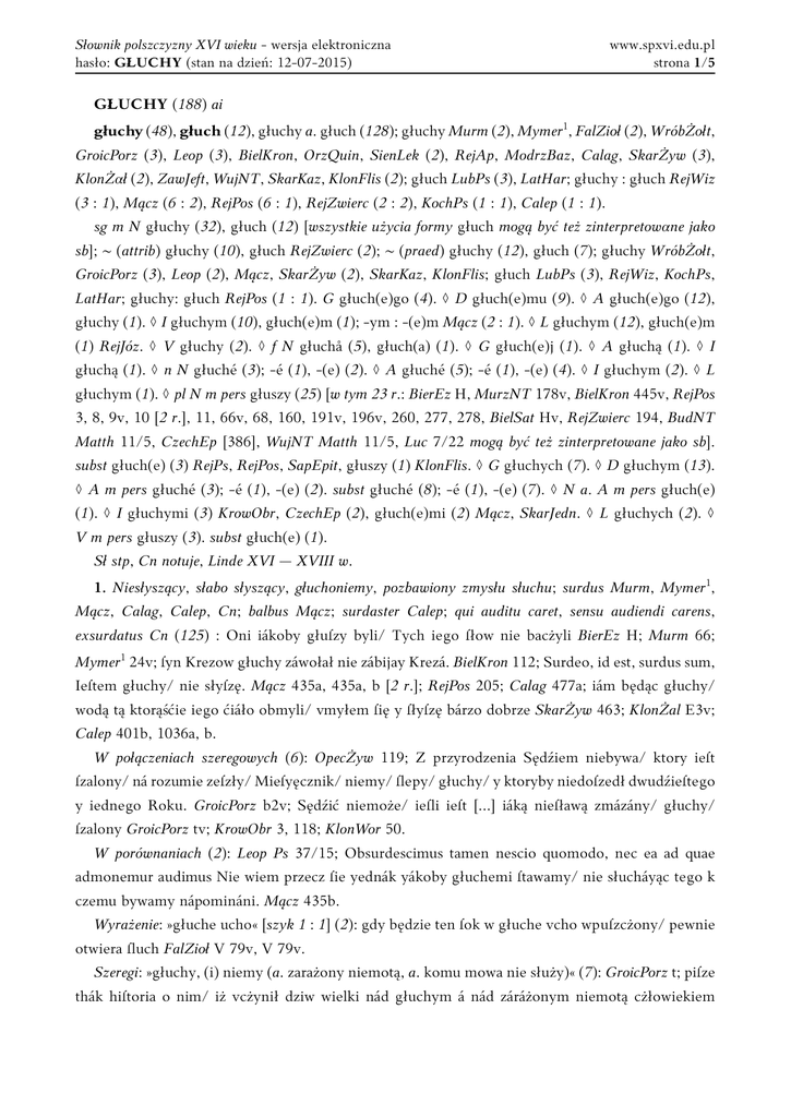 Słownik polszczyzny XVI wieku - wersja elektroniczna hasło: GŁUCHY (stan na dzień: 12-07-2015) www.spxvi.edu.pl strona 1/5 GŁUCHY (188) ai głuchy (48), głuch (12), głuchy a. głuch (128); głuchy Murm (2), Mymer1, FalZioł (2), WróbŻołt, GroicPorz (3), Leop (3), BielKron, OrzQuin, SienLek (2), RejAp, ModrzBaz, Calag, SkarŻyw (3), KlonŻαł (2), ZawJeft, WujNT, SkarKaz, KlonFlis (2); głuch LubPs (3), LatHar; głuchy : głuch RejWiz (3 : 1), Mącz (6 : 2), RejPos (6 : 1), RejZwierc (2 : 2), KochPs (1 : 1), Calep (1 : 1). sg m N głuchy (32), głuch (12) [wszystkie użycia formy głuch mogą być też zinterpretowαne jako sb]; ~ (attrib) głuchy (10), głuch RejZwierc (2); ~ (praed) głuchy (12), głuch (7); głuchy WróbŻołt, GroicPorz (3), Leop (2), Mącz, SkarŻyw (2), SkarKaz, KlonFlis; głuch LubPs (3), RejWiz, KochPs, LatHar; głuchy: głuch RejPos (1 : 1). G głuch(e)go (4). ◊ D głuch(e)mu (9). ◊ A głuch(e)go (12), głuchy (1). ◊ I głuchym (10), głuch(e)m (1); -ym : -(e)m Mącz (2 : 1). ◊ L głuchym (12), głuch(e)m (1) RejJóz. ◊ V głuchy (2). ◊ f N głuchå (5), głuch(a) (1). ◊ G głuch(e)j (1). ◊ A głuchą (1). ◊ I głuchą (1). ◊ n N głuché (3); -é (1), -(e) (2). ◊ A głuché (5); -é (1), -(e) (4). ◊ I głuchym (2). ◊ L głuchym (1). ◊ pl N m pers głuszy (25) [w tym 23 r.: BierEz H, MurzNT 178v, BielKron 445v, RejPos 3, 8, 9v, 10 [2 r.], 11, 66v, 68, 160, 191v, 196v, 260, 277, 278, BielSat Hv, RejZwierc 194, BudNT Matth 11/5, CzechEp [386], WujNT Matth 11/5, Luc 7/22 mogą być też zinterpretowane jako sb]. subst głuch(e) (3) RejPs, RejPos, SapEpit, głuszy (1) KlonFlis. ◊ G głuchych (7). ◊ D głuchym (13). ◊ A m pers głuché (3); -é (1), -(e) (2). subst głuché (8); -é (1), -(e) (7). ◊ N a. A m pers głuch(e) (1). ◊ I głuchymi (3) KrowObr, CzechEp (2), głuch(e)mi (2) Mącz, SkarJedn. ◊ L głuchych (2). ◊ V m pers głuszy (3). subst głuch(e) (1). Sł stp, Cn notuje, Linde XVI — XVIII w. 1. Niesłyszący, słabo słyszący, głuchoniemy, pozbawiony zmysłu słuchu; surdus Murm, Mymer1, Mącz, Calag, Calep, Cn; balbus Mącz; surdaster Calep; qui auditu caret, sensu audiendi carens, exsurdatus Cn (125) : Oni iákoby głuſzy byli/ Tych iego ſłow nie bacżyli BierEz H; Murm 66; Mymer1 24v; ſyn Krezow głuchy záwołał nie zábijay Krezá. BielKron 112; Surdeo, id est, surdus sum, Ieſtem głuchy/ nie słyſzę. Mącz 435a, 435a, b [2 r.]; RejPos 205; Calag 477a; iám będąc głuchy/ wodą tą ktorąśćie iego ćiáło obmyli/ vmyłem ſię y ſłyſzę bárzo dobrze SkarŻyw 463; KlonŻal E3v; Calep 401b, 1036a, b. W połączeniach szeregowych (6): OpecŻyw 119; Z przyrodzenia Sędźiem niebywa/ ktory ieſt ſzalony/ ná rozumie zeſzły/ Mieſyęcznik/ niemy/ ſlepy/ głuchy/ y ktoryby niedoſzedł dwudźieſtego y iednego Roku. GroicPorz b2v; Sędźić niemoże/ ieſli ieſt [...] iáką nieſławą zmázány/ głuchy/ ſzalony GroicPorz tv; KrowObr 3, 118; KlonWor 50. W porównaniach (2): Leop Ps 37/15; Obsurdescimus tamen nescio quomodo, nec ea ad quae admonemur audimus Nie wiem przecz ſie yednák yákoby głuchemi ſtawamy/ nie słucháyąc tego k czemu bywamy nápomináni. Mącz 435b. Wyrażenie: »głuche ucho« [szyk 1 : 1] (2): gdy będzie ten ſok w głuche vcho wpuſzcżony/ pewnie otwiera ſluch FalZioł V 79v, V 79v. Szeregi: »głuchy, (i) niemy (a. zarażony niemotą, a. komu mowa nie służy)« (7): GroicPorz t; piſze thák hiſtoria o nim/ iż vcżynił dziw wielki nád głuchym á nád záráżonym niemotą cżłowiekiem Słownik polszczyzny XVI wieku - wersja elektroniczna hasło: GŁUCHY (stan na dzień: 12-07-2015) www.spxvi.edu.pl strona 2/5 RejPos 212v, 204, 205v; A ia/ iáko kto głuchy/ álbo komu mowá Nie ſłuży/ ánim ſłuchał/ ánim przerzekł ſłowá KochPs 56; LatHar 536; WujNT przedm 36. [Ponadto w połączeniach szeregowych 4 r.]. »ślepy, (a, albo) głuchy« = caecus et surdus Vulg [szyk 3 : 1] (4): Leop Is 42/19; RejPos 204v; Kto vmiał vcho ſtworzyć y oko/ temu Iáko być głuchym/ álbo ślepym ſámemu? KochPs 141; SkarKaz 517b. [Ponadto w połączeniach szeregowych 4 r.]. W przen (10) : Iad máią [...] iáko (v) zmije głuchey zátykaiącey ſobie vcho. BudBib Ps 58/4[5]; Nie bądźże głuchy/ niechay prożnych wieśći A pilnie ſłuchay gdźie wodá ſzeleśći. KlonFlis F3. Szereg: »(ślepy), głuchy i (a) niemy« = surdus et mutus Vulg [szyk 7 : 1] (8): Co ieſt dyabelſtwo głuche a nieme. RejPos 79 marg, 79 [3 r.], 80; BiałKat 341; Vzdrawia onego ktory miał czártá głuchego y niemego WujNT przedm 35, Mar 9/25[24]. Przen: Niezdolny do zrozumienia oczywistych prawd (4) : Ták głuchemi zoſtáli/ iſz nie ſłyſzą co Prorok mowi. SkarJedn 26. Wyrażenie: »ucho głuche« (1): á tobie dano vcho/ y to głuché/ ieſlić go ten Páſtyrz pálcem ſwoim nie otworzy OrzQuin Gv. Szereg: »ślepy, (i) głuchy, (a) niemy« (2): RejPos 205; y odiął im ſmyſł/ że w tey ſpráwie ślepymi/ głuchymi/ niememi ſą CzechEp 86. a. W funkcji rzeczownika (76) : Kogo grzech oſlepi/ tedi ſie iuż sſthawa iáko głuch/ iż podnieść nie śmye do Páná głoſu ſwego LubPs K3v marg; BielKron 445v; RejPos 227; BielSat Hv. W połączeniach szeregowych (23): bo przed ijch ocżyma po kázaniu / vzdrowil wielé niemotznych/ gluchych/ ſlepych/ niemych. OpecŻyw 47, 47, 134; MurzNT Luc 7/22; Iſz będąc tákowym pánem/ niegárdził vbogimi/ ſlepymi/ głuchymi/ niemymi/ opętanymi/ trędowátymi/ chromemi/ páſterzmi/ iáwnogrzeſzniki KrowObr 49; RejPos 3, 8, 9v, 10 [2 r.], 11 (12); BiałKat 328v; BudNT Matth 11/5; ArtKanc N15; WujNT Matth 11/5, Mar 9 arg, Luc 7/22. W porównaniach (2): Iuż iáko głuch ná drugie muśiſz pálcem kiwáć/ Bo iuż tám trudno ſłuſzney rozmowy vżywáć. RejWiz 16v; RejZwierc 194. Przysłowia: Balbus balbum rectius intelligit, Głuchy rychley ſie s głuchem zmowi. Mącz 23a. ále głuchemu prozno co powiáda