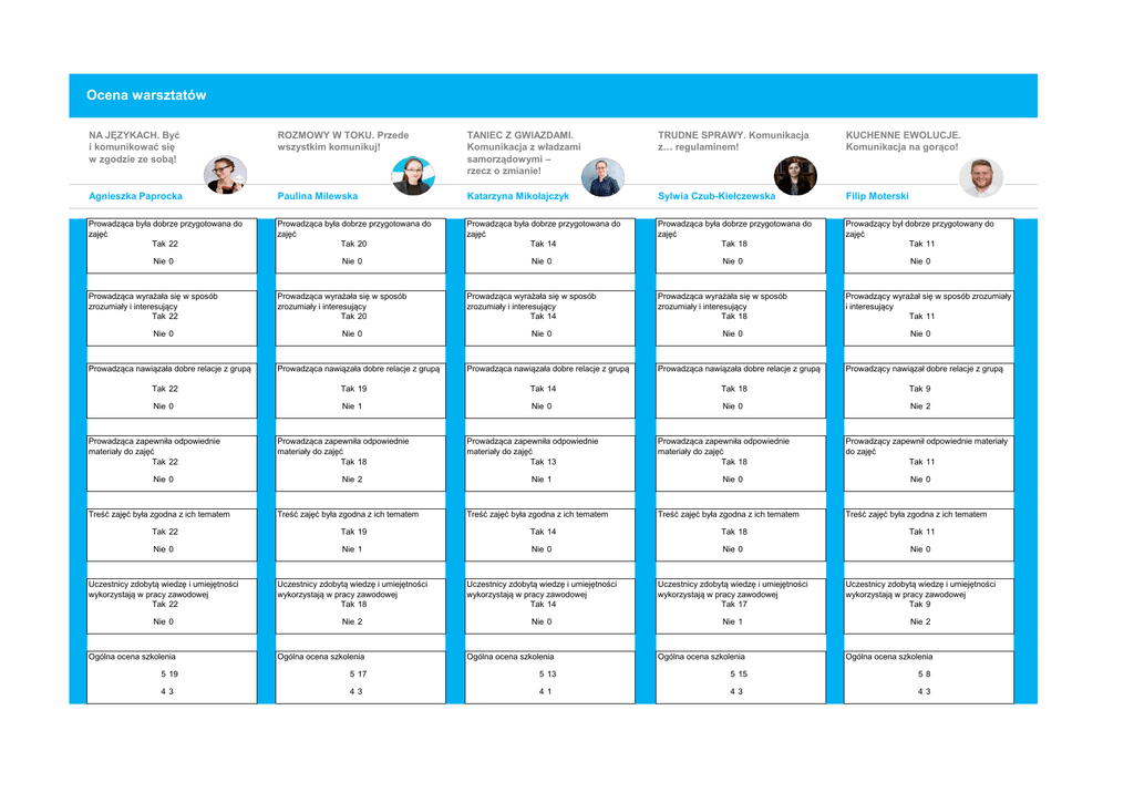 Ocena warsztatów NA JĘZYKACH. Być i komunikować się w zgodzie ze sobą! ROZMOWY W TOKU. Przede wszystkim komunikuj! TANIEC Z GWIAZDAMI. Komunikacja z władzami samorządowymi – rzecz o zmianie! TRUDNE SPRAWY. Komunikacja z… regulaminem! KUCHENNE EWOLUCJE. Komunikacja na gorąco! Agnieszka Paprocka Paulina Milewska Katarzyna Mikołajczyk Sylwia Czub-Kiełczewska Filip Moterski Prowadząca była dobrze przygotowana do zajęć Tak 22 Prowadząca była dobrze przygotowana do zajęć Tak 20 Prowadząca była dobrze przygotowana do zajęć Tak 14 Prowadząca była dobrze przygotowana do zajęć Tak 18 Prowadzący był dobrze przygotowany do zajęć Tak 11 Nie 0 Nie 0 Nie 0 Nie 0 Nie 0 Prowadząca wyrażała się w sposób zrozumiały i interesujący Tak 22 Nie 0 Prowadząca nawiązała dobre relacje z grupą Prowadząca wyrażała się w sposób zrozumiały i interesujący Tak 20 Nie 0 Prowadząca nawiązała dobre relacje z grupą Prowadząca wyrażała się w sposób zrozumiały i interesujący Tak 14 Nie 0 Prowadząca nawiązała dobre relacje z grupą Prowadząca wyrażała się w sposób zrozumiały i interesujący Tak 18 Nie 0 Prowadząca nawiązała dobre relacje z grupą Prowadzący wyrażał się w sposób zrozumiały i interesujący Tak 11 Nie 0 Prowadzący nawiązał dobre relacje z grupą Tak 22 Tak 19 Tak 14 Tak 18 Tak 9 Nie 0 Nie 1 Nie 0 Nie 0 Nie 2 Prowadząca zapewniła odpowiednie materiały do zajęć Tak 22 Nie 0 Treść zajęć była zgodna z ich tematem Prowadząca zapewniła odpowiednie materiały do zajęć Tak 18 Nie 2 Treść zajęć była zgodna z ich tematem Prowadząca zapewniła odpowiednie materiały do zajęć Tak 13 Nie 1 Treść zajęć była zgodna z ich tematem Prowadząca zapewniła odpowiednie materiały do zajęć Tak 18 Nie 0 Treść zajęć była zgodna z ich tematem Prowadzący zapewnił odpowiednie materiały do zajęć Tak 11 Nie 0 Treść zajęć była zgodna z ich tematem Tak 22 Tak 19 Tak 14 Tak 18 Tak 11 Nie 0 Nie 1 Nie 0 Nie 0 Nie 0 Uczestnicy zdobytą wiedzę i umiejętności wykorzystają w pracy zawodowej Tak 22 Uczestnicy zdobytą wiedzę i umiejętności wykorzystają w pracy zawodowej Tak 18 Uczestnicy zdobytą wiedzę i umiejętności wykorzystają w pracy zawodowej Tak 14 Uczestnicy zdobytą wiedzę i umiejętności wykorzystają w pracy zawodowej Tak 17 Uczestnicy zdobytą wiedzę i umiejętności wykorzystają w pracy zawodowej Tak 9 Nie 0 Nie 2 Nie 0 Nie 1 Nie 2 Ogólna ocena szkolenia Ogólna ocena szkolenia Ogólna ocena szkolenia Ogólna ocena szkolenia Ogólna ocena szkolenia 5 19 5 17 5 13 5 15 58 43 43 41 43 43