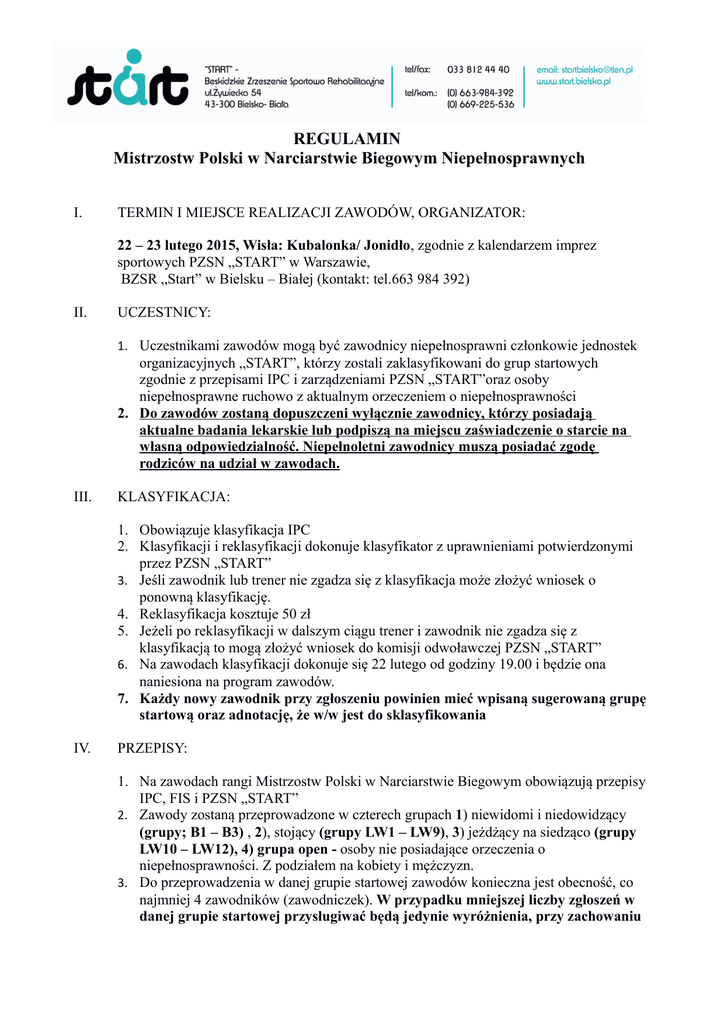 REGULAMIN Mistrzostw Polski w Narciarstwie Biegowym Niepełnosprawnych I. TERMIN I MIEJSCE REALIZACJI ZAWODÓW, ORGANIZATOR: 22 – 23 lutego 2015, Wisła: Kubalonka/ Jonidło, zgodnie z kalendarzem imprez sportowych PZSN „START” w Warszawie, BZSR „Start” w Bielsku – Białej (kontakt: tel.663 984 392) II. UCZESTNICY: 1. Uczestnikami zawodów mogą być zawodnicy niepełnosprawni członkowie jednostek organizacyjnych „START”, którzy zostali zaklasyfikowani do grup startowych zgodnie z przepisami IPC i zarządzeniami PZSN „START”oraz osoby niepełnosprawne ruchowo z aktualnym orzeczeniem o niepełnosprawności 2. Do zawodów zostaną dopuszczeni wyłącznie zawodnicy, którzy posiadają aktualne badania lekarskie lub podpiszą na miejscu zaświadczenie o starcie na własną odpowiedzialność. Niepełnoletni zawodnicy muszą posiadać zgodę rodziców na udział w zawodach. III. KLASYFIKACJA: 1. Obowiązuje klasyfikacja IPC 2. Klasyfikacji i reklasyfikacji dokonuje klasyfikator z uprawnieniami potwierdzonymi przez PZSN „START” 3. Jeśli zawodnik lub trener nie zgadza się z klasyfikacja może złożyć wniosek o ponowną klasyfikację. 4. Reklasyfikacja kosztuje 50 zł 5. Jeżeli po reklasyfikacji w dalszym ciągu trener i zawodnik nie zgadza się z klasyfikacją to mogą złożyć wniosek do komisji odwoławczej PZSN „START” 6. Na zawodach klasyfikacji dokonuje się 22 lutego od godziny 19.00 i będzie ona naniesiona na program zawodów. 7. Każdy nowy zawodnik przy zgłoszeniu powinien mieć wpisaną sugerowaną grupę startową oraz adnotację, że w/w jest do sklasyfikowania IV. PRZEPISY: 1. Na zawodach rangi Mistrzostw Polski w Narciarstwie Biegowym obowiązują przepisy IPC, FIS i PZSN „START” 2. Zawody zostaną przeprowadzone w czterech grupach 1) niewidomi i niedowidzący (grupy; B1 – B3) , 2), stojący (grupy LW1 – LW9), 3) jeżdżący na siedząco (grupy LW10 – LW12), 4) grupa open - osoby nie posiadające orzeczenia o niepełnosprawności. Z podziałem na kobiety i mężczyzn. 3. Do przeprowadzenia w danej grupie startowej zawodów konieczna jest obecność, co najmniej 4 zawodników (zawodniczek). W przypadku mniejszej liczby zgłoszeń w danej grupie startowej przysługiwać będą jedynie wyróżnienia, przy zachowaniu zasad dotyczących ilości osób w grupie startowej. Organizator zastrzega sobie prawo łączenia grup. V. KONKURENCJE: Styl Klasyczny i Styl Dowolny - dystanse w zależności od grupy startowej (2km, 3km, 5 km) NAGRODY: VI. 1.W klasyfikacji indywidualnej za pierwsze trzy miejsca przewidziane są dyplomy i medale. 2. Nagrody rzeczowe dla wszystkich uczestników zawodów. VI. ZASADY FINANSOWANIA: Koszty związane z realizacją Mistrzostw oraz koszty wyżywienia i zakwaterowania pokrywa PZSN „START” ze środków Ministerstwa Sportu i Turystyki oraz PFRON VII. POSTANOWIENIA KOŃCOWE: Trasy są przygotowane dla zawodników profesjonalnych i amatorskich. prosimy w zgłoszeniu zaznaczyć, którą trasę! 1. Za bezpieczeństwo podczas zawodów odpowiedzialni są: GOPR, sędzia główny, lekarz oraz kierownicy i trenerzy ekip. 2. Zawodnicy na czas trwania zawodów będą objęci ubezpieczeniem NNW 3. Przy składaniu protestu obowiązuje kaucja w wysokości 50 zł, protest składać można do 10 minut po zakończeniu danego przejazdu. 4. Istnieje możliwość wcześniejszego przyjazdu i późniejszego powrotu z Mistrzostw (odpłatnie) informacje; BZSR „START” Bielsko - Biała, kontakt jak wyżej. 5. Istnieje odpłatna możliwość wypożyczenia sprzętu na miejscu, koszt wypożyczenia ok 30 zł. Osoby zainteresowane prosimy w zgłoszeniu o podanie wagi, wzrostu i nr obuwia. 6. Istnieje również możliwość wypożyczenia sledgy 7. Trasa wyścigu jest uzależniona od warunków pogodowych, (Kubalonka lub Jonidło) 8. Zgłoszenia należy wysyłać na adres: [email protected] do dnia 11.01.2015 r podając: imię, nazwisko, nazwę klubu/instytucji (w przypadku braku przynależności klubowej: miejsce zamieszkania), pesel, nr kontaktowy, grupę startową (lub:do klasyfikacji), trasę (amatorska lub profesjonalna), styl: (dowolny lub klasyczny)