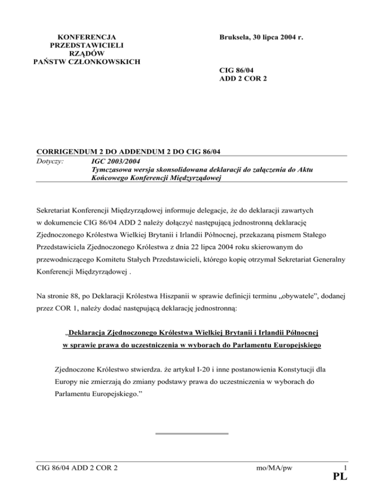 KONFERENCJA PRZEDSTAWICIELI RZĄDÓW PAŃSTW CZŁONKOWSKICH Bruksela, 30 lipca 2004 r. CIG 86/04 ADD 2 COR 2 CORRIGENDUM 2 DO ADDENDUM 2 DO CIG 86/04 Dotyczy: IGC 2003/2004 Tymczasowa wersja skonsolidowana deklaracji do załączenia do Aktu Końcowego Konferencji Międzyrządowej Sekretariat Konferencji Międzyrządowej informuje delegacje, że do deklaracji zawartych w dokumencie CIG 86/04 ADD 2 należy dołączyć następującą jednostronną deklarację Zjednoczonego Królestwa Wielkiej Brytanii i Irlandii Północnej, przekazaną pismem Stałego Przedstawiciela Zjednoczonego Królestwa z dnia 22 lipca 2004 roku skierowanym do przewodniczącego Komitetu Stałych Przedstawicieli, którego kopię otrzymał Sekretariat Generalny Konferencji Międzyrządowej . Na stronie 88, po Deklaracji Królestwa Hiszpanii w sprawie definicji terminu „obywatele”, dodanej przez COR 1, należy dodać następującą deklarację jednostronną: „Deklaracja Zjednoczonego Królestwa Wielkiej Brytanii i Irlandii Północnej w sprawie prawa do uczestniczenia w wyborach do Parlamentu Europejskiego Zjednoczone Królestwo stwierdza. że artykuł I-20 i inne postanowienia Konstytucji dla Europy nie zmierzają do zmiany podstawy prawa do uczestniczenia w wyborach do Parlamentu Europejskiego.” CIG 86/04 ADD 2 COR 2 mo/MA/pw 1 PL