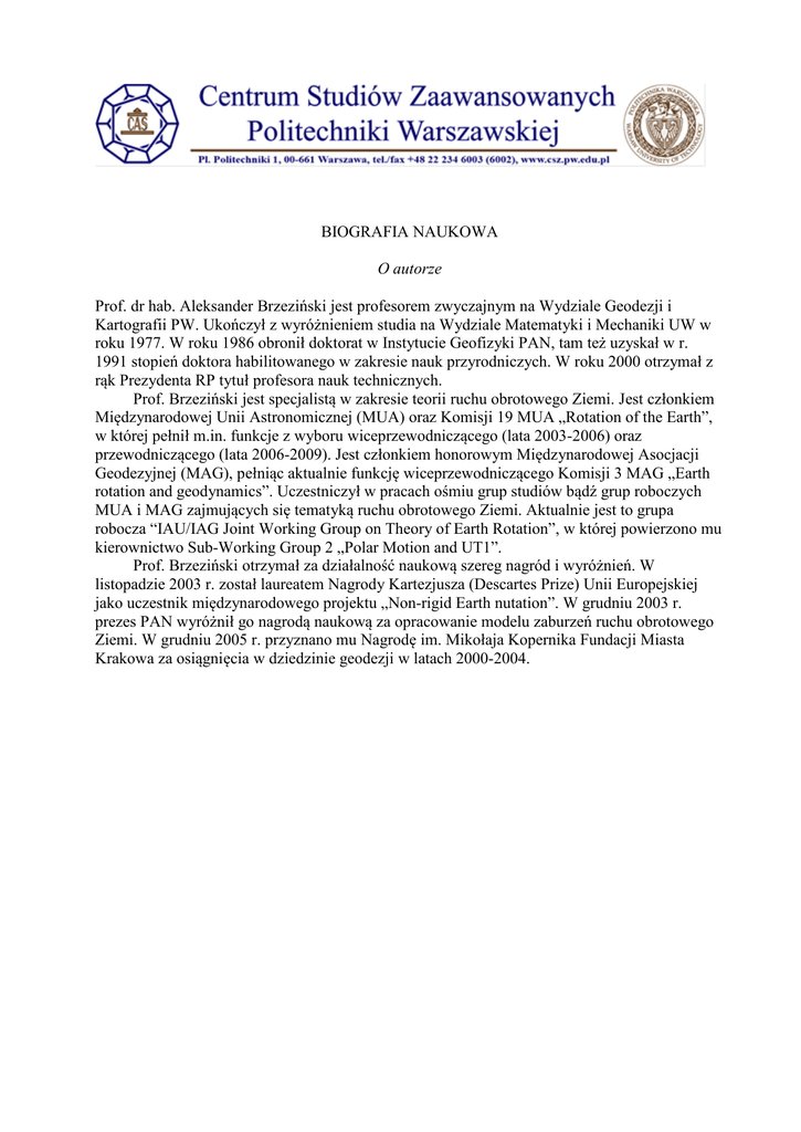 BIOGRAFIA NAUKOWA O autorze Prof. dr hab. Aleksander Brzeziński jest profesorem zwyczajnym na Wydziale Geodezji i Kartografii PW. Ukończył z wyróżnieniem studia na Wydziale Matematyki i Mechaniki UW w roku 1977. W roku 1986 obronił doktorat w Instytucie Geofizyki PAN, tam też uzyskał w r. 1991 stopień doktora habilitowanego w zakresie nauk przyrodniczych. W roku 2000 otrzymał z rąk Prezydenta RP tytuł profesora nauk technicznych. Prof. Brzeziński jest specjalistą w zakresie teorii ruchu obrotowego Ziemi. Jest członkiem Międzynarodowej Unii Astronomicznej (MUA) oraz Komisji 19 MUA „Rotation of the Earth”, w której pełnił m.in. funkcje z wyboru wiceprzewodniczącego (lata 2003-2006) oraz przewodniczącego (lata 2006-2009). Jest członkiem honorowym Międzynarodowej Asocjacji Geodezyjnej (MAG), pełniąc aktualnie funkcję wiceprzewodniczącego Komisji 3 MAG „Earth rotation and geodynamics”. Uczestniczył w pracach ośmiu grup studiów bądź grup roboczych MUA i MAG zajmujących się tematyką ruchu obrotowego Ziemi. Aktualnie jest to grupa robocza “IAU/IAG Joint Working Group on Theory of Earth Rotation”, w której powierzono mu kierownictwo Sub-Working Group 2 „Polar Motion and UT1”. Prof. Brzeziński otrzymał za działalność naukową szereg nagród i wyróżnień. W listopadzie 2003 r. został laureatem Nagrody Kartezjusza (Descartes Prize) Unii Europejskiej jako uczestnik międzynarodowego projektu „Non-rigid Earth nutation”. W grudniu 2003 r. prezes PAN wyróżnił go nagrodą naukową za opracowanie modelu zaburzeń ruchu obrotowego Ziemi. W grudniu 2005 r. przyznano mu Nagrodę im. Mikołaja Kopernika Fundacji Miasta Krakowa za osiągnięcia w dziedzinie geodezji w latach 2000-2004.