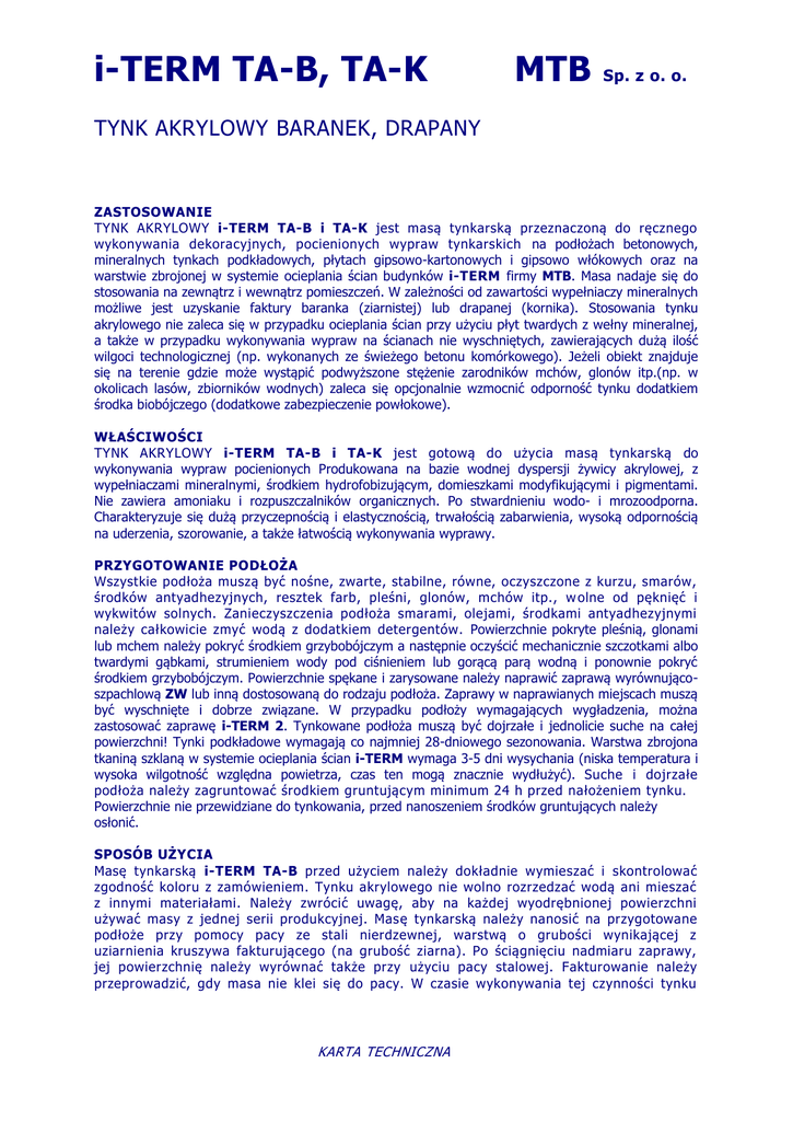 i-TERM TA-B, TA-K MTB Sp. z o. o. TYNK AKRYLOWY BARANEK, DRAPANY ZASTOSOWANIE TYNK AKRYLOWY i-TERM TA-B i TA-K jest masą tynkarską przeznaczoną do ręcznego wykonywania dekoracyjnych, pocienionych wypraw tynkarskich na podłożach betonowych, mineralnych tynkach podkładowych, płytach gipsowo-kartonowych i gipsowo włókowych oraz na warstwie zbrojonej w systemie ocieplania ścian budynków i-TERM firmy MTB. Masa nadaje się do stosowania na zewnątrz i wewnątrz pomieszczeń. W zależności od zawartości wypełniaczy mineralnych możliwe jest uzyskanie faktury baranka (ziarnistej) lub drapanej (kornika). Stosowania tynku akrylowego nie zaleca się w przypadku ocieplania ścian przy użyciu płyt twardych z wełny mineralnej, a także w przypadku wykonywania wypraw na ścianach nie wyschniętych, zawierających dużą ilość wilgoci technologicznej (np. wykonanych ze świeżego betonu komórkowego). Jeżeli obiekt znajduje się na terenie gdzie może wystąpić podwyższone stężenie zarodników mchów, glonów itp.(np. w okolicach lasów, zbiorników wodnych) zaleca się opcjonalnie wzmocnić odporność tynku dodatkiem środka biobójczego (dodatkowe zabezpieczenie powłokowe). WŁAŚCIWOŚCI TYNK AKRYLOWY i-TERM TA-B i TA-K jest gotową do użycia masą tynkarską do wykonywania wypraw pocienionych Produkowana na bazie wodnej dyspersji żywicy akrylowej, z wypełniaczami mineralnymi, środkiem hydrofobizującym, domieszkami modyfikującymi i pigmentami. Nie zawiera amoniaku i rozpuszczalników organicznych. Po stwardnieniu wodo- i mrozoodporna. Charakteryzuje się dużą przyczepnością i elastycznością, trwałością zabarwienia, wysoką odpornością na uderzenia, szorowanie, a także łatwością wykonywania wyprawy. PRZYGOTOWANIE PODŁOŻA Wszystkie podłoża muszą być nośne, zwarte, stabilne, równe, oczyszczone z kurzu, smarów, środków antyadhezyjnych, resztek farb, pleśni, glonów, mchów itp., w olne od pęknięć i wykwitów solnych. Zanieczyszczenia podłoża smarami, olejami, środkami antyadhezyjnymi należy całkowicie zmyć wodą z dodatkiem detergentów. Powierzchnie pokryte pleśnią, glonami lub mchem należy pokryć środkiem grzybobójczym a następnie oczyścić mechanicznie szczotkami albo twardymi gąbkami, strumieniem wody pod ciśnieniem lub gorącą parą wodną i ponownie pokryć środkiem grzybobójczym. Powierzchnie spękane i zarysowane należy naprawić zaprawą wyrównującoszpachlową ZW lub inną dostosowaną do rodzaju podłoża. Zaprawy w naprawianych miejscach muszą być wyschnięte i dobrze związane. W przypadku podłoży wymagających wygładzenia, można zastosować zaprawę i-TERM 2. Tynkowane podłoża muszą być dojrzałe i jednolicie suche na całej powierzchni! Tynki podkładowe wymagają co najmniej 28-dniowego sezonowania. Warstwa zbrojona tkaniną szklaną w systemie ocieplania ścian i-TERM wymaga 3-5 dni wysychania (niska temperatura i wysoka wilgotność względna powietrza, czas ten mogą znacznie wydłużyć). Suche i dojrzałe podłoża należy zagruntować środkiem gruntującym minimum 24 h przed nałożeniem tynku. Powierzchnie nie przewidziane do tynkowania, przed nanoszeniem środków gruntujących należy osłonić. SPOSÓB UŻYCIA Masę tynkarską i-TERM TA-B przed użyciem należy dokładnie wymieszać i skontrolować zgodność koloru z zamówieniem. Tynku akrylowego nie wolno rozrzedzać wodą ani mieszać z innymi materiałami. Należy zwrócić uwagę, aby na każdej wyodrębnionej powierzchni używać masy z jednej serii produkcyjnej. Mas ę tynkarską należy nanosić na przygotowane podłoże przy pomocy pacy ze stali nierdzewnej, warstwą o grubości wynikającej z uziarnienia kruszywa fakturującego (na grubość ziarna). Po ściągnięciu nadmiaru zaprawy, jej powierzchnię należy wyrównać także przy użyciu pacy stalowej. Fakturowanie należy przeprowadzić, gdy masa nie klei się do pacy. W czasie wykonywania tej czynności tynku KARTA TECHNICZNA 1 i-TERM TA-B, TA-K MTB Sp. z o. o. TYNK AKRYLOWY BARANEK, DRAPANY nie wolno skrapiać wodą! Materiał należy nakładać w sposób ciągły nie dopuszczając do wyschnięcia zafakturowanej powierzchni tynku przed nałożeniem kolejnej partii w celu uniknięcia widocznych połączeń. Przeciętny czas wysychania tynku wynosi od 1 do 3 dni i zależy od warunków atmosferycznych. Wysoka wilgotność powietrza i niska temperatura wpływają na wydłużenie czasu wiązania ty nku. UWAGA!!! W momencie nakładania oraz podczas wysychania tynk należy chronić przed deszczem, opadającą mgłą, nasłonecznieniem, wiatrem oraz mrozem. Zaleca się stosowanie osłon na rusztowaniach. Temperatura powietrza, podłoża i wbudowanego materiału w czasie pracy i wiązania tynku powinna wynosić minimum +5 o C, maksimum +25 o C, a wilgotność względna powietrza ok.60%. DANE TECHNICZNE Współczynnik przepuszczania pary wodnej: kategoria V 2 Współczynnik przenikania wody W 2 Przyczepność ≥ 0,3 MPa DANE WYKONAWCZE Temperatura stosowania (powietrza, podłoża, materiałów): od +5 °C do +25 °C Uziarnienie: 1,5; 2 i 3 mm ZUŻYCIE Orientacyjne zużycie materiału na 1m 2 przy uziarnieniu: 1,5 mm 2 mm 3 mm 2,6 kg 2,9 kg 3,7 kg OPAKOWANIA Produkt pakowany jest w wiaderka 25 kg i dostarczany na paletach po 33 sztuki. PRZECHOWYWANIE Przechowywać w nieuszkodzonym opakowaniu i temperaturze od +5 o C maksymalnie 12 miesięcy od daty produkcji umieszczonej na opakowaniu. do +25 o C UWAGA Należy unikać kontaktu ze skórą oraz chronić oczy. W przypadku kontaktu z oczami, przemyć je obficie czystą wodą i zasięgnąć porady lekarza. W przypadku kontaktu ze skórą, zmyć ją wodą. Zaleca się używanie rękawic, okularów i odzieży ochronnej. DOKUMENT ODNIESIENIA PN-EN 13499: 2005 „Wyroby do izolacji cieplnej w budownictwie. Zewnętrzne zespolone systemy ocieplania (ETICS) ze styropianem. Specyfikacja”, oraz EN 15824: 2010 Właściwości tynków zewnęt