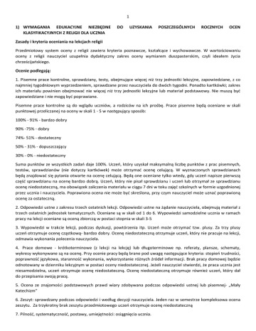 1 1) WYMAGANIA EDUKACYJNE NIEZBĘDNE KLASYFIKACYJNYCH Z RELIGII DLA UCZNIA DO UZYSKANIA POSZCZEGÓLNYCH ROCZNYCH OCEN Zasady i kryteria oceniania na lekcjach religii Przedmiotowy system oceny z religii zawiera kryteria poznawcze, kształcące i wychowawcze. W wartościowaniu oceny z religii nauczyciel uzupełnia dydaktyczny zakres oceny wymiarem duszpasterskim, czyli ideałem życia chrześcijańskiego. Ocenie podlegają: 1. Pisemne prace kontrolne, sprawdziany, testy, obejmujące więcej niż trzy jednostki lekcyjne, zapowiedziane, z co najmniej tygodniowym wyprzedzeniem, sprawdzane przez nauczyciela do dwóch tygodni. Ponadto kartkówki; zakres ich materiału powinien obejmować nie więcej niż trzy jednostki lekcyjne lub materiał podstawowy. Nie muszą być zapowiedziane i nie mogą być poprawiane. Pisemne prace kontrolne są do wglądu uczniów, a rodziców na ich prośbę. Prace pisemne będą oceniane w skali punktowej przeliczanej na oceny w skali 1 - 5 w następujący sposób: 100% - 91% - bardzo dobry 90% -75% - dobry 74%- 51% - dostateczny 50% - 31% - dopuszczający 30% - 0% - niedostateczny Suma punktów ze wszystkich zadań daje 100%. Uczeń, który uzyskał maksymalną liczbę punktów z prac pisemnych, testów, sprawdzianów (nie dotyczy kartkówek) może otrzymać ocenę celującą. W wyznaczonych sprawdzianach będą znajdować się pytania otwarte na ocenę celującą. Będą one oceniane tylko wtedy, gdy uczeń napisze pierwszą część sprawdzianu na ocenę bardzo dobrą. Uczeń, który nie pisał sprawdzianu i uczeń lub otrzymał ze sprawdzianu ocenę niedostateczną, ma obowiązek zaliczenia materiału w ciągu 7 dni w toku zajęć szkolnych w formie uzgodnionej przez ucznia i nauczyciela. Poprawiona ocena nie może być skreślona, przy czym nauczyciel może uznać poprawioną ocenę za ostateczną. 2. Odpowiedzi ustne z zakresu trzech ostatnich lekcji. Odpowiedzi ustne na żądanie nauczyciela, obejmują materiał z trzech ostatnich jednostek tematycznych. Oceniane są w skali od 1 do 6. Wypowiedzi samodzielne ucznia w ramach pracy na lekcji oceniane są oceną zbiorczą w postaci stopnia w skali 3-5 3. Wypowiedzi w trakcie lekcji, podczas dyskusji, powtórzenia itp. Uczeń może otrzymać tzw. plusy. Za trzy plusy uczeń otrzymuje ocenę cząstkową- bardzo dobry. Ocenę niedostateczną otrzymuje uczeń, który nie pracuje na lekcji, odmawia wykonania polecenia nauczyciela. 4. Prace domowe - krótkoterminowe (z lekcji na lekcję) lub długoterminowe np. referaty, plansze, schematy, wykresy wykonywane są na ocenę. Przy ocenie pracy będą brane pod uwagę następujące kryteria: stopień trudności, poprawność językowa, staranność wykonania, wykorzystanie różnych źródeł informacji. Brak pracy domowej będzie odnotowany w dzienniku lekcyjnym w postaci oceny niedostatecznej. Jeżeli nauczyciel stwierdzi, że praca ucznia jest niesamodzielna, uczeń otrzymuje ocenę niedostateczną. Ocenę niedostateczną otrzymuje również uczeń, który dał do przepisania swoją pracę. 5. Ocena ze znajomości podstawowych prawd wiary zdobywana podczas odpowiedzi ustnej lub pisemnej- „Mały Katechizm” 6. Zeszyt: sprawdzany podczas odpowiedzi i według decyzji nauczyciela. Jeden raz w semestrze kompleksowa ocena zeszytu. Za trzykrotny brak zeszytu przedmiotowego uczeń otrzymuje ocenę niedostateczną 7. Pilność, systematyczność, postawy, umiejętności: osiągnięcia ucznia. 2 8. Przygotowanie do poszczególnych katechez. 9. Korzystanie z Pisma Świętego, podręcznika i innych materiałów katechetycznych. 10. Zaangażowanie w przygotowanie i przeprowadzenie uroczystości szkolnych o charakterze religijnym, zaangażowanie w przygotowanie gazetek szkolnych, udział w konkursach religijnych. Liczba ocen: W ciągu jednego semestru nauczyciel wystawia każdemu uczniowi, co najmniej trzy oceny cząstkowe. Uczeń może trzy razy w ciągu semestru zgłosić nieprzygotowanie do lekcji, co zostaje odnotowywane. W razie nieprzygotowania do lekcji zgłasza to na początku lub w trakcie sprawdzania obecności. Promuje się systematyczne ocenianie w ciągu semestrów połączone z możliwością poprawiania. W wyjątkowych uzasadnionych sytuacjach poprawianie może odbywać się bezpośrednio przed wystawianiem oceny semestralnej lub końcowo rocznej. Przeprowadza się je według ustaleń osób zainteresowanych w terminie i z zakresu wskazanego przez nauczyciela religii z zastosowaniem formy pisemnej lub ustnej. Zasady wystawiania oceny semestralnej i końcowo rocznej z religii Klasyfikacja: Uczeń może być niesklasyfikowany z religii, jeżeli brak jest podstaw do ustalenia oceny klasyfikacyjnej z powodu nieobecności ucznia na zajęciach. Przy wystawieniu oceny śródrocznej i rocznej przyjmuje się następujące zasady: Ocena nie będzie miała charakteru średniej arytmetycznej ocen cząstkowych Znaczący wpływ mają przede wszystkim oceny uzyskane (w semestrze lub w ciągu całego roku szkolnego) z prac kontrolnych, dłuższych wypowiedzi, referatów oraz innych form pracy o charakterze samodzielnym Uczeń, który przystąpi do olimpiady czy konkursu religijnego i pomyślnie ukończy, co najmniej etap szkolny, będzie mógł uzyskać podniesienie oceny końcowo rocznej o jeden stopień. Ocena celująca Uczeń: • Spełnia wymagania określone w zakresie oceny bardzo dobrej. • Wykazuje się wiadomościami wykraczającymi poza program religii poziomu edukacji. • Angażuje się w pracach pozalekcyjnych, np. gazetki religijne, montaże sceniczne, pomoce katechetyczne itp. • Uczestniczy w konkursach wiedzy religijnej. • Pilność, systematyczność, zainteresowanie, stosunek do przedmiotu nie budzi żadnych zastrzeżeń. • Poznane prawdy wiary stosuje w życiu. Ocena celująca jest wystawiana tylko, jako ocena końcowo roczna Ocena bardzo dobra Uczeń: • Spełnia wymagania określone w zakresie oceny dobrej. • Opanował pełny zakres wiedzy, postaw i 