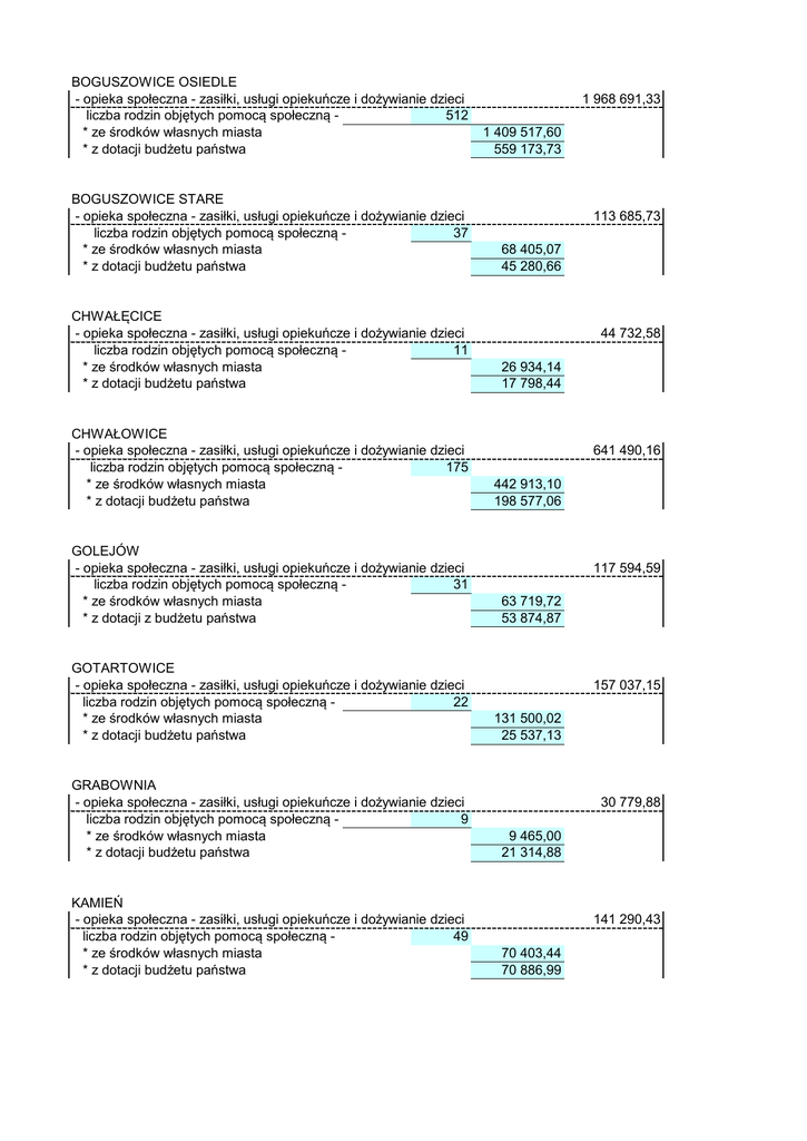 BOGUSZOWICE OSIEDLE - opieka społeczna - zasiłki, usługi opiekuńcze i dożywianie dzieci liczba rodzin objętych pomocą społeczną 512 * ze środków własnych miasta * z dotacji budżetu państwa BOGUSZOWICE STARE - opieka społeczna - zasiłki, usługi opiekuńcze i dożywianie dzieci liczba rodzin objętych pomocą społeczną 37 * ze środków własnych miasta * z dotacji budżetu państwa CHWAŁĘCICE - opieka społeczna - zasiłki, usługi opiekuńcze i dożywianie dzieci liczba rodzin objętych pomocą społeczną 11 * ze środków własnych miasta * z dotacji budżetu państwa CHWAŁOWICE - opieka społeczna - zasiłki, usługi opiekuńcze i dożywianie dzieci liczba rodzin objętych pomocą społeczną 175 * ze środków własnych miasta * z dotacji budżetu państwa GOLEJÓW - opieka społeczna - zasiłki, usługi opiekuńcze i dożywianie dzieci liczba rodzin objętych pomocą społeczną 31 * ze środków własnych miasta * z dotacji z budżetu państwa GOTARTOWICE - opieka społeczna - zasiłki, usługi opiekuńcze i dożywianie dzieci liczba rodzin objętych pomocą społeczną 22 * ze środków własnych miasta * z dotacji budżetu państwa GRABOWNIA - opieka społeczna - zasiłki, usługi opiekuńcze i dożywianie dzieci liczba rodzin objętych pomocą społeczną 9 * ze środków własnych miasta * z dotacji budżetu państwa KAMIEŃ - opieka społeczna - zasiłki, usługi opiekuńcze i dożywianie dzieci liczba rodzin objętych pomocą społeczną 49 * ze środków własnych miasta * z dotacji budżetu państwa 1 968 691,33 1 409 517,60 559 173,73 113 685,73 68 405,07 45 280,66 44 732,58 26 934,14 17 798,44 641 490,16 442 913,10 198 577,06 117 594,59 63 719,72 53 874,87 157 037,15 131 500,02 25 537,13 30 779,88 9 465,00 21 314,88 141 290,43 70 403,44 70 886,99 KŁOKOCIN - opieka społeczna - zasiłki, usługi opiekuńcze i dożywianie dzieci liczba rodzin objętych pomocą społeczną 31 * ze środków własnych miasta * z dotacji budżetu państwa LIGOTA - opieka społeczna - zasiłki, usługi opiekuńcze i dożywianie dzieci liczba rodzin objętych pomocą społeczną 35 * ze środków własnych miasta * z dotacji budżetu państwa MAROKO-NOWINY - opieka społeczna - zasiłki, usługi opiekuńcze i dożywianie dzieci liczba rodzin objętych pomocą społeczną 304 * ze środków własnych miasta * z dotacji budżetu państwa MEKSYK - opieka społeczna - zasiłki, usługi opiekuńcze i dożywianie dzieci liczba rodzin objętych pomocą społeczną 18 * ze środków własnych miasta * z dotacji budżetu państwa NIEDOBCZYCE - opieka społeczna - zasiłki i dożywianie dzieci liczba rodzin objętych pomocą społeczną * ze środków własnych miasta * z dotacji budżetu państwa 124 965,21 71 389,90 53 575,31 138 536,96 99 703,95 38 833,01 1 354 101,06 963 146,36 390 954,70 26 295,66 17 422,81 8 872,85 877 629,37 231 NIEWIADOM - opieka społeczna - zasiłki, usługi opiekuńcze i dożywianie dzieci liczba rodzin objętych pomocą społeczną 211 * ze środków własnych miasta * z dotacji budżetu państwa OCHOJEC - opieka społeczna - zasiłki, usługi opiekuńcze i dożywianie dzieci liczba rodzin objętych pomocą społeczną 14 * ze środków własnych miasta * z dotacji budżetu państwa ORZEPOWICE - opieka społeczna - zasiłki, usługi opiekuńcze i dożywianie dzieci liczba rodzin objętych pomocą społeczną 37 * ze środków własnych miasta * z dotacji budżetu państwa 579 848,56 297 780,81 548 793,05 277 724,13 271 068,92 53 668,69 48 270,69 5 398,00 358 079,45 287 066,62 71 012,83 PARUSZOWIEC - opieka społeczna - zasiłki, usługi opiekuńcze i dożywianie dzieci liczba rodzin objętych pomocą społeczną 448 * ze środków własnych miasta * z dotacji budżetu państwa POPIELÓW - opieka społeczna - zasiłki i dożywianie dzieci liczba rodzin objętych pomocą społeczną * ze środków własnych miasta * z dotacji budżetu państwa 632 199,85 509 729,71 454 293,10 44 371 908,08 82 385,02 PÓŁNOC - opieka społeczna - zasiłki, usługi opiekuńcze i dożywianie dzieci liczba rodzin objętych pomocą społeczną 138 * ze środków własnych miasta * z dotacji budżetu państwa RADZIEJÓW - opieka społeczna - zasiłki, usługi opiekuńcze i dożywianie dzieci liczba rodzin objętych pomocą społeczną 17 * ze środków własnych miasta * z dotacji budżetu państwa RYBNICKA KUŹNIA - opieka społeczna - zasiłki i dożywianie dzieci liczba rodzin objętych pomocą społeczną * ze środkow własnych miasta * z dotacji budżetu państwa 1 141 929,56 607 936,49 226 431,45 381 505,04 188137,50 159 448,00 28 689,50 222 903,99 32 SMOLNA - opieka społeczna - zasiłki, usługi opiekuńcze i dożywianie dzieci liczba rodzin objętych pomocą społeczną 59 * ze środków własnych miasta * z dotacji budżetu państwa STODOŁY - opieka społeczna - zasiłki, usługi opiekuńcze i dożywianie dzieci liczba rodzin objętych pomocą społeczną 4 * ze środków własnych miasta * z dotacji budżetu państwa ŚRÓDMIEŚCIE - opieka społeczna - zasiłki, usługi opiekuńcze i dożywianie dzieci liczba rodzin objętych pomocą społeczną 180 * ze środków własnych miasta * z dotacji budżetu państwa 144 310,34 78 593,65 253 240,81 160 043,56 93 197,25 16 888,50 9 637,00 7 251,50 566 581,84 343 946,85 222 634,99 WIELOPOLE - opieka społeczna - zasiłki i dożywianie dzieci liczba rodzin objętych pomocą społeczną * ze środków własnych miasta * z dotacji budżetu państwa 35 505,11 14 16 370,12 19 134,99 ZAMYSŁÓW - opieka społeczna - zasiłki, usługi opiekuńcze i dożywianie dzieci liczba rodzin objętych pomocą społeczną 39 * ze środków własnych miasta * z dotacji budżetu państwa ZEBRZYDOWICE - opieka społeczna - zasiłki, usługi opiekuńcze i dożywianie dzieci liczba rodzin objętych pomocą społeczną 34 * ze środków własnych miasta * z dotacji budżetu państwa własne dotacja łącznie liczba rodzin, środki własne i dotacj