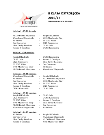 B KLASA OSTROŁĘCKA 2016/17 TERMINARZ RUNDY JESIENNEJ Kolejka 1 - 27-28 sierpnia - Kurpik II Kadzidło WKS Mystkówiec Stary FC 2013 Różan GKS Andrzejewo GLKS Lelis GUKS Krasnosielc Kurpik II Kadzidło GLKS Lelis GKS Andrzejewo FC 2013 Różan WKS Mystkówiec Stary ALDO Bartnik Myszyniec - GUKS Krasnosielc Korona II Ostrołęka Iskra Zaręby Kościelne Orz Goworowo KS Pniewo Wymakracz Długosiodło Kolejka 3 - 10-11 września Wymakracz Długosiodło KS Pniewo Orz Goworowo Iskra Zaręby Kościelne Korona II Ostrołęka GUKS Krasnosielc - Kurpik II Kadzidło ALDO Bartnik Myszyniec WKS Mystkówiec Stary FC 2013 Różan GKS Andrzejewo GLKS Lelis Kolejka 4 - 17-18 września Kurpik II Kadzidło GKS Andrzejewo FC 2013 Różan WKS Mystkówiec Stary ALDO Bartnik Myszyniec Wymakracz Długosiodło - GLKS Lelis GUKS Krasnosielc Korona II Ostrołęka Iskra Zaręby Kościelne Orz Goworowo KS Pniewo Kolejka 5 - 24-25 września KS Pniewo Orz Goworowo Iskra Zaręby Kościelne Korona II Ostrołęka - Kurpik II Kadzidło Wymakracz Długosiodło ALDO Bartnik Myszyniec WKS Mystkówiec Stary ALDO Bartnik Myszyniec Wymakracz Długosiodło KS Pniewo Orz Goworowo Iskra Zaręby Kościelne Korona II Ostrołęka Kolejka 2 - 3-4 września GUKS Krasnosielc GLKS Lelis - FC 2013 Różan GKS Andrzejewo Kolejka 6 - 1-2 października Kurpik II Kadzidło FC 2013 Różan WKS Mystkówiec Stary ALDO Bartnik Myszyniec Wymakracz Długosiodło KS Pniewo - GKS Andrzejewo GLKS Lelis GUKS Krasnosielc Korona II Ostrołęka Iskra Zaręby Kościelne Orz Goworowo Kolejka 7 - 8-9 października Orz Goworowo Iskra Zaręby Kościelne Korona II Ostrołęka GUKS Krasnosielc GLKS Lelis GKS Andrzejewo - Kurpik II Kadzidło KS Pniewo Wymakracz Długosiodło ALDO Bartnik Myszyniec WKS Mystkówiec Stary FC 2013 Różan Kolejka 8 - 15-16 października Kurpik II Kadzidło WKS Mystkówiec Stary ALDO Bartnik Myszyniec Wymakracz Długosiodło KS Pniewo Orz Goworowo - FC 2013 Różan GKS Andrzejewo GLKS Lelis GUKS Krasnosielc Korona II Ostrołęka Iskra Zaręby Kościelne Kolejka 9 - 22-23 października Iskra Zaręby Kościelne Korona II Ostrołęka GUKS Krasnosielc GLKS Lelis GKS Andrzejewo FC 2013 Różan - Kurpik II Kadzidło Orz Goworowo KS Pniewo Wymakracz Długosiodło ALDO Bartnik Myszyniec WKS Mystkówiec Stary Kolejka 10 - 29-30 października Kurpik II Kadzidło ALDO Bartnik Myszyniec Wymakracz Długosiodło KS Pniewo Orz Goworowo Iskra Zaręby Kościelne - WKS Mystkówiec Stary FC 2013 Różan GKS Andrzejewo GLKS Lelis GUKS Krasnosielc Korona II Ostrołęka Kolejka 11 - 5-6 listopada Korona II Ostrołęka GUKS Krasnosielc Kurpik II Kadzidło Iskra Zaręby Kościelne - GLKS Lelis GKS Andrzejewo FC 2013 Różan WKS Mystkówiec Stary - Orz Goworowo KS Pniewo Wymakracz Długosiodło ALDO Bartnik Myszyniec NAJNOWSZE I SPRAWDZONE INFORMACJE SPORTOWE Z TERENU OSTROŁĘKI I POWIATU OSTROŁĘCKIEGO PRZECZYTASZ W SERWISIE eOstroleka.pl ORAZ NA FACEBOOKU – SPORTOWA OSTROŁĘKA.