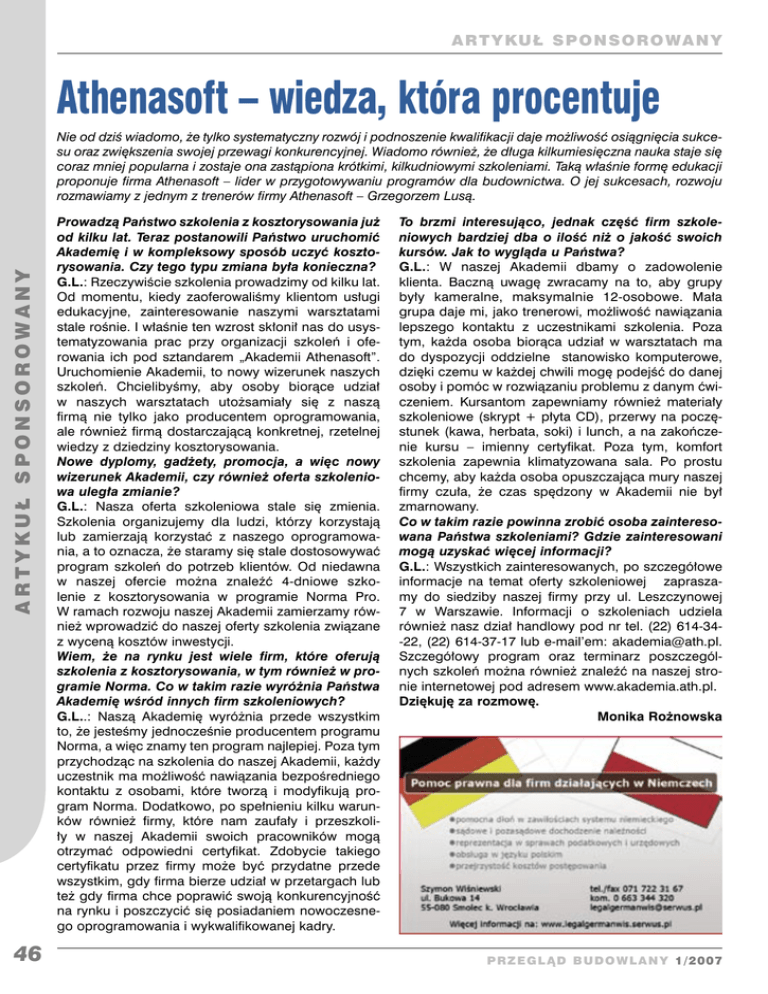 ARTYKUŁ SPONSOROWA N Y Athenasoft – wiedza, która procentuje ARTYKUŁ SPONSOROWANY Nie od dziś wiadomo, że tylko systematyczny rozwój i podnoszenie kwalifikacji daje możliwość osiągnięcia sukcesu oraz zwiększenia swojej przewagi konkurencyjnej. Wiadomo również, że długa kilkumiesięczna nauka staje się coraz mniej popularna i zostaje ona zastąpiona krótkimi, kilkudniowymi szkoleniami. Taką właśnie formę edukacji proponuje firma Athenasoft – lider w przygotowywaniu programów dla budownictwa. O jej sukcesach, rozwoju rozmawiamy z jednym z trenerów firmy Athenasoft – Grzegorzem Lusą. 46 Prowadzą Państwo szkolenia z kosztorysowania już od kilku lat. Teraz postanowili Państwo uruchomić Akademię i w kompleksowy sposób uczyć kosztorysowania. Czy tego typu zmiana była konieczna? G.L.: Rzeczywiście szkolenia prowadzimy od kilku lat. Od momentu, kiedy zaoferowaliśmy klientom usługi edukacyjne, zainteresowanie naszymi warsztatami stale rośnie. I właśnie ten wzrost skłonił nas do usystematyzowania prac przy organizacji szkoleń i oferowania ich pod sztandarem „Akademii Athenasoft”. Uruchomienie Akademii, to nowy wizerunek naszych szkoleń. Chcielibyśmy, aby osoby biorące udział w naszych warsztatach utożsamiały się z naszą firmą nie tylko jako producentem oprogramowania, ale również firmą dostarczającą konkretnej, rzetelnej wiedzy z dziedziny kosztorysowania. Nowe dyplomy, gadżety, promocja, a więc nowy wizerunek Akademii, czy również oferta szkoleniowa uległa zmianie? G.L.: Nasza oferta szkoleniowa stale się zmienia. Szkolenia organizujemy dla ludzi, którzy korzystają lub zamierzają korzystać z naszego oprogramowania, a to oznacza, że staramy się stale dostosowywać program szkoleń do potrzeb klientów. Od niedawna w naszej ofercie można znaleźć 4-dniowe szkolenie z kosztorysowania w programie Norma Pro. W ramach rozwoju naszej Akademii zamierzamy również wprowadzić do naszej oferty szkolenia związane z wyceną kosztów inwestycji. Wiem, że na rynku jest wiele firm, które oferują szkolenia z kosztorysowania, w tym również w programie Norma. Co w takim razie wyróżnia Państwa Akademię wśród innych firm szkoleniowych? G.L..: Naszą Akademię wyróżnia przede wszystkim to, że jesteśmy jednocześnie producentem programu Norma, a więc znamy ten program najlepiej. Poza tym przychodząc na szkolenia do naszej Akademii, każdy uczestnik ma możliwość nawiązania bezpośredniego kontaktu z osobami, które tworzą i modyfikują program Norma. Dodatkowo, po spełnieniu kilku warunków również firmy, które nam zaufały i przeszkoliły w naszej Akademii swoich pracowników mogą otrzymać odpowiedni certyfikat. Zdobycie takiego certyfikatu przez firmy może być przydatne przede wszystkim, gdy firma bierze udział w przetargach lub też gdy firma chce poprawić swoją konkurencyjność na rynku i poszczycić się posiadaniem nowoczesnego oprogramowania i wykwalifikowanej kadry. To brzmi interesująco, jednak część firm szkoleniowych bardziej dba o ilość niż o jakość swoich kursów. Jak to wygląda u Państwa? G.L.: W naszej Akademii dbamy o zadowolenie klienta. Baczną uwagę zwracamy na to, aby grupy były kameralne, maksymalnie 12-osobowe. Mała grupa daje mi, jako trenerowi, możliwość nawiązania lepszego kontaktu z uczestnikami szkolenia. Poza tym, każda osoba biorąca udział w warsztatach ma do dyspozycji oddzielne stanowisko komputerowe, dzięki czemu w każdej chwili mogę podejść do danej osoby i pomóc w rozwiązaniu problemu z danym ćwiczeniem. Kursantom zapewniamy również materiały szkoleniowe (skrypt + płyta CD), przerwy na poczęstunek (kawa, herbata, soki) i lunch, a na zakończenie kursu – imienny certyfikat. Poza tym, komfort szkolenia zapewnia klimatyzowana sala. Po prostu chcemy, aby każda osoba opuszczająca mury naszej firmy czuła, że czas spędzony w Akademii nie był zmarnowany. Co w takim razie powinna zrobić osoba zainteresowana Państwa szkoleniami? Gdzie zainteresowani mogą uzyskać więcej informacji? G.L.: Wszystkich zainteresowanych, po szczegółowe informacje na temat oferty szkoleniowej zapraszamy do siedziby naszej firmy przy ul. Leszczynowej 7 w Warszawie. Informacji o szkoleniach udziela również nasz dział handlowy pod nr tel. (22) 614-34-22, (22) 614-37-17 lub e-mail’em: [email protected]. Szczegółowy program oraz terminarz poszczególnych szkoleń można również znaleźć na naszej stronie internetowej pod adresem www.akademia.ath.pl. Dziękuję za rozmowę. Monika Rożnowska PRZEGLĄD BUDOWLANY 1/2007