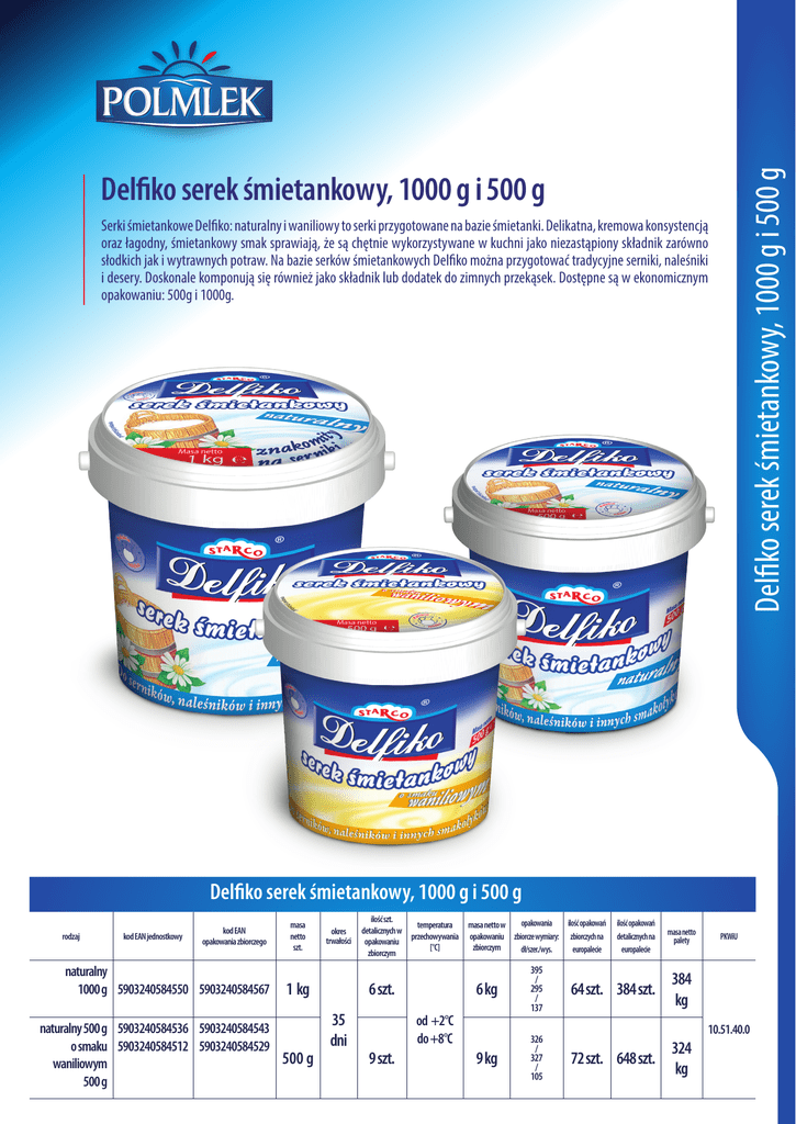 Delfiko serek śmietankowy, 1000 g i 500 g Delfiko serek śmietankowy, 1000 g i 500 g Serki śmietankowe Delfiko: naturalny i waniliowy to serki przygotowane na bazie śmietanki. Delikatna, kremowa konsystencją oraz łagodny, śmietankowy smak sprawiają, że są chętnie wykorzystywane w kuchni jako niezastąpiony składnik zarówno słodkich jak i wytrawnych potraw. Na bazie serków śmietankowych Delfiko można przygotować tradycyjne serniki, naleśniki i desery. Doskonale komponują się również jako składnik lub dodatek do zimnych przekąsek. Dostępne są w ekonomicznym opakowaniu: 500g i 1000g. Delfiko serek śmietankowy, 1000 g i 500 g rodzaj kod EAN jednostkowy kod EAN opakowania zbiorczego naturalny 1000 g 5903240584550 5903240584567 masa netto szt. okres trwałości 1 kg naturalny 500 g 5903240584536 5903240584543 o smaku 5903240584512 5903240584529 500 g waniliowym 500 g ilość szt. opakowania ilość opakowań temperatura masa netto w detalicznych w przechowywania opakowaniu zbiorcze wymiary: zbiorczych na opakowaniu [°C] zbiorczym dł/szer./wys. europalecie zbiorczym 6 szt. 35 dni 6 kg 395 / 295 / 137 9 kg 326 / 327 / 105 od +2°C do +8°C 9 szt. ilość opakowań detalicznych na europalecie 64 szt. 384 szt. 72 szt. 648 szt. masa netto palety PKWiU 384 kg 324 kg 10.51.40.0